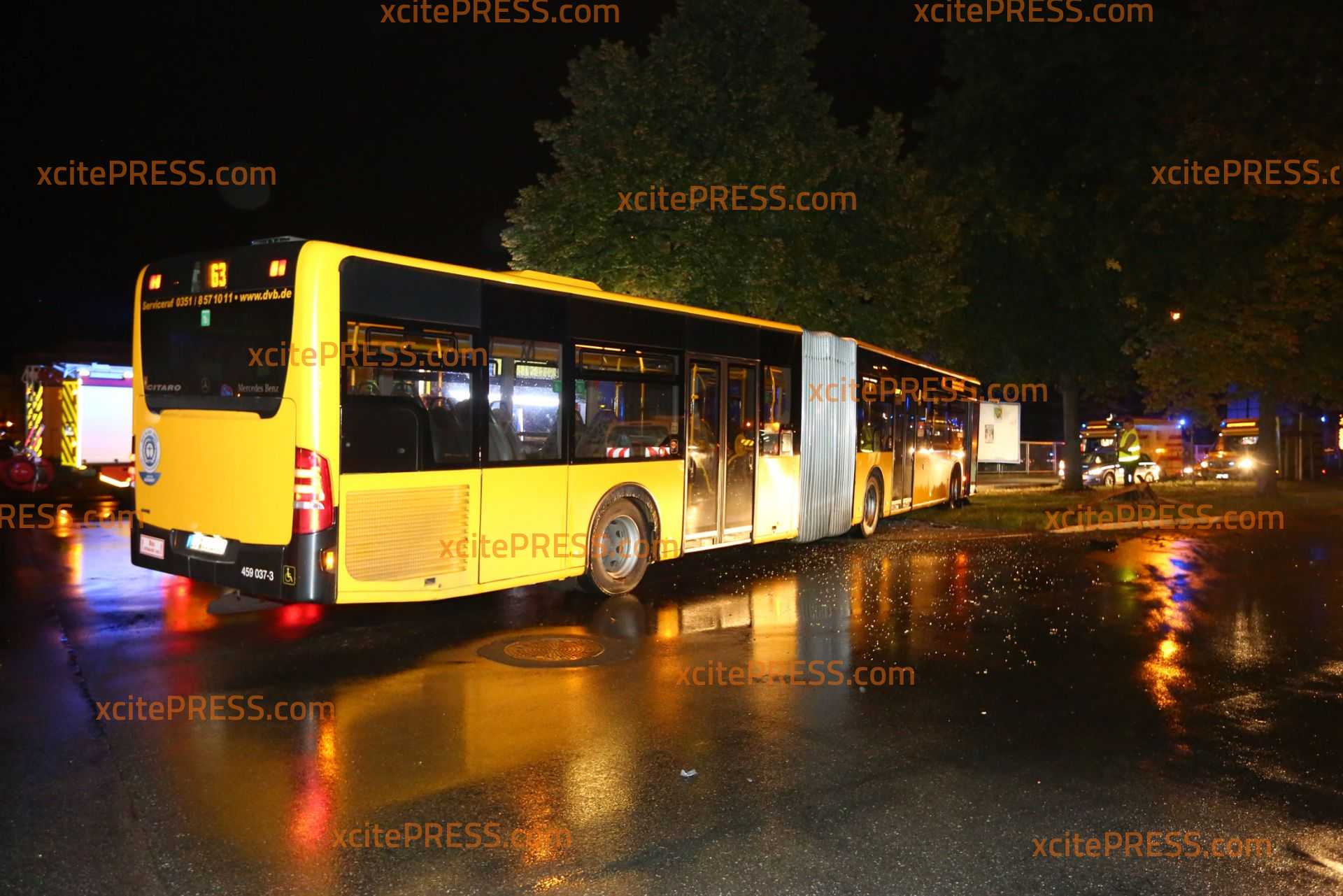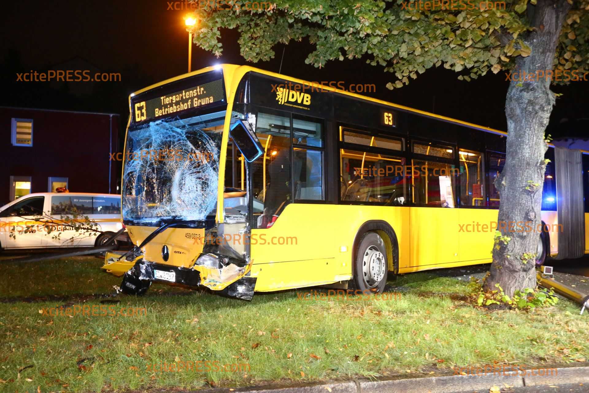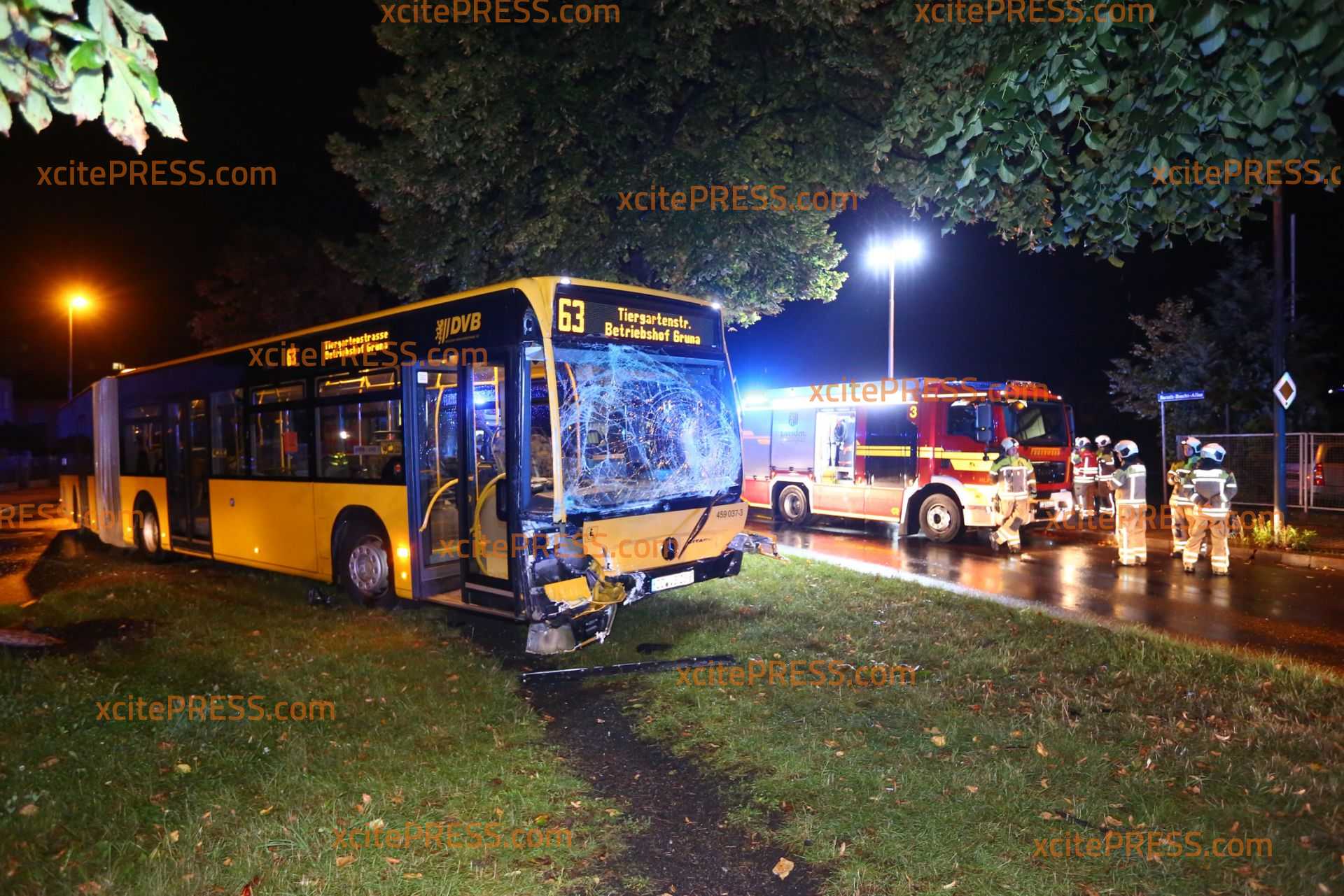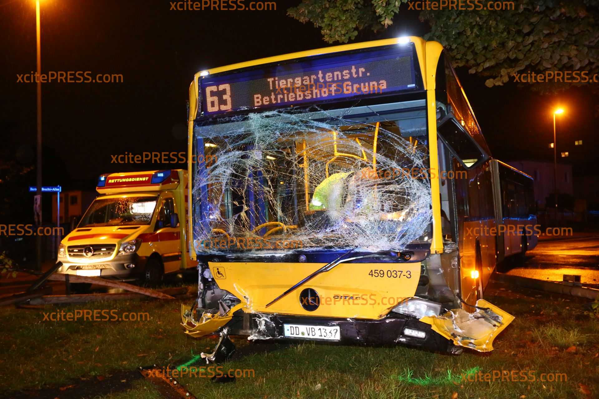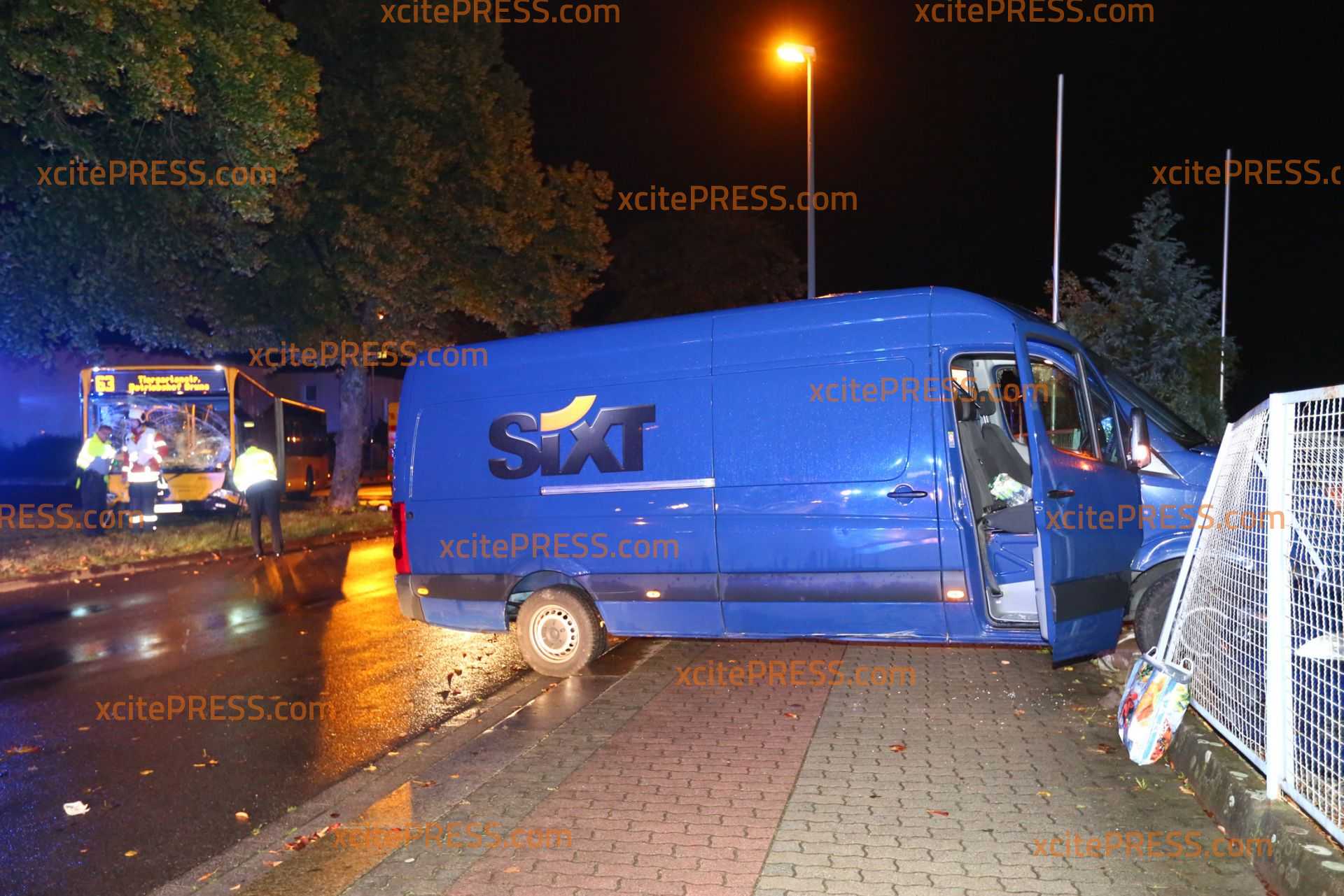 Am Donnerstagabend kam es gegen 23.10 Uhr zu einem schweren Verkehrsunfall. Nach ersten Informationen befuhr ein Transporter die Laubestraße. Offenbar missachtete an der Kreuzung Bertolt-Brecht-Allee einen vorfahrtsberechtigten Bus. Der Bus kam trotz sofort eingeleiteter Bremsmaßnahmen auf der regennassen Fahrbahn nicht mehr rechtzeitig zum Stehen und rammte den Transporter. Im weiteren Verlauf fällte der Bus eine Straßenlaterne, der Transporter landete durch den Aufprall am Zaun eines Gebrauchtwagen-Handels - beschädigte dort noch 4 PKW.