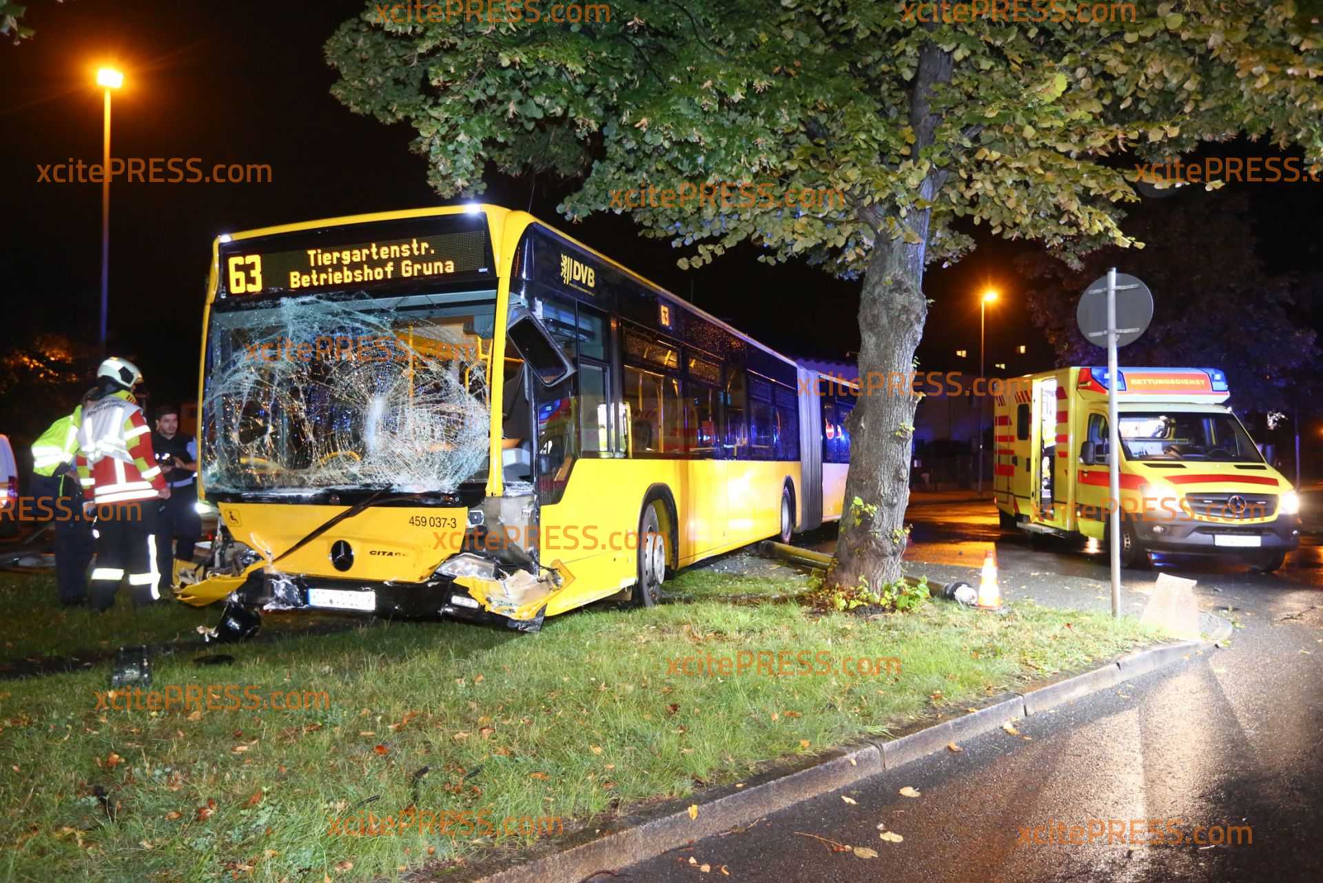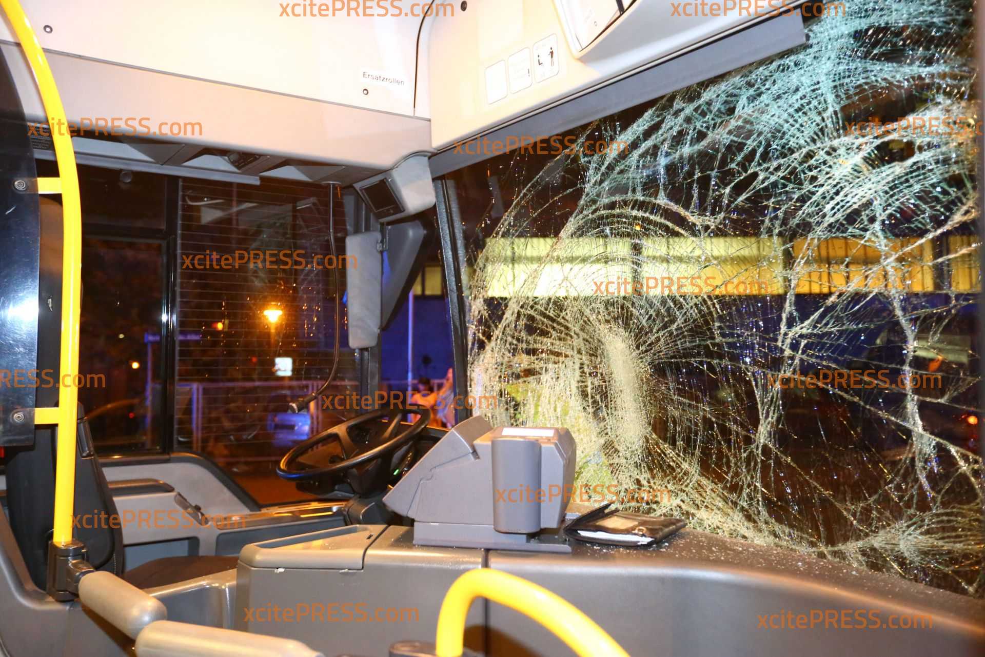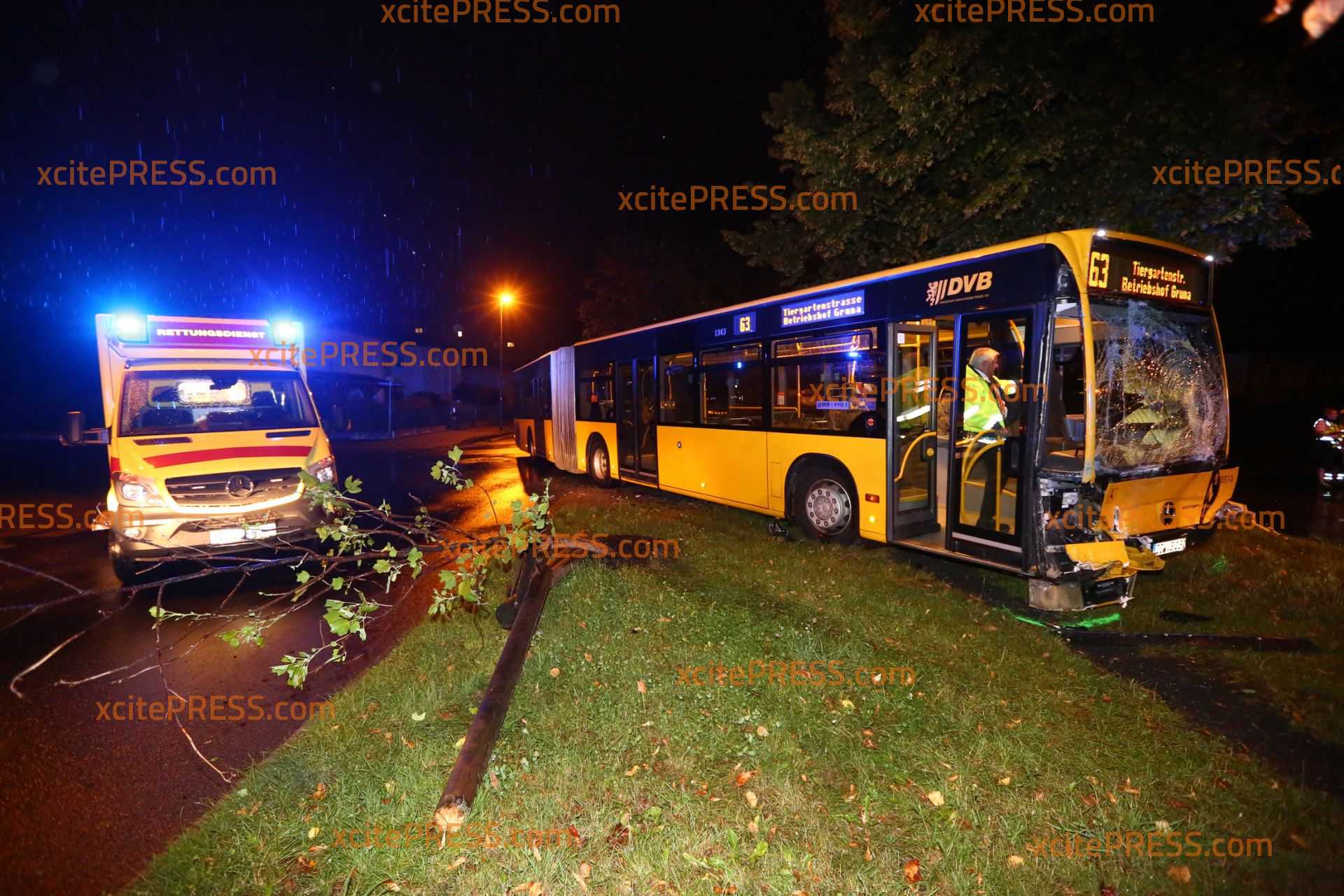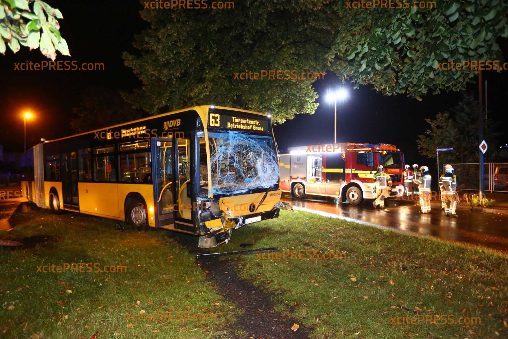 Am Donnerstagabend kam es gegen 23.10 Uhr zu einem schweren Verkehrsunfall. Nach ersten Informationen befuhr ein Transporter die Laubestraße. Offenbar missachtete an der Kreuzung Bertolt-Brecht-Allee einen vorfahrtsberechtigten Bus. Der Bus kam trotz sofort eingeleiteter Bremsmaßnahmen auf der regennassen Fahrbahn nicht mehr rechtzeitig zum Stehen und rammte den Transporter. Im weiteren Verlauf fällte der Bus eine Straßenlaterne, der Transporter landete durch den Aufprall am Zaun eines Gebrauchtwagen-Handels - beschädigte dort noch 4 PKW.