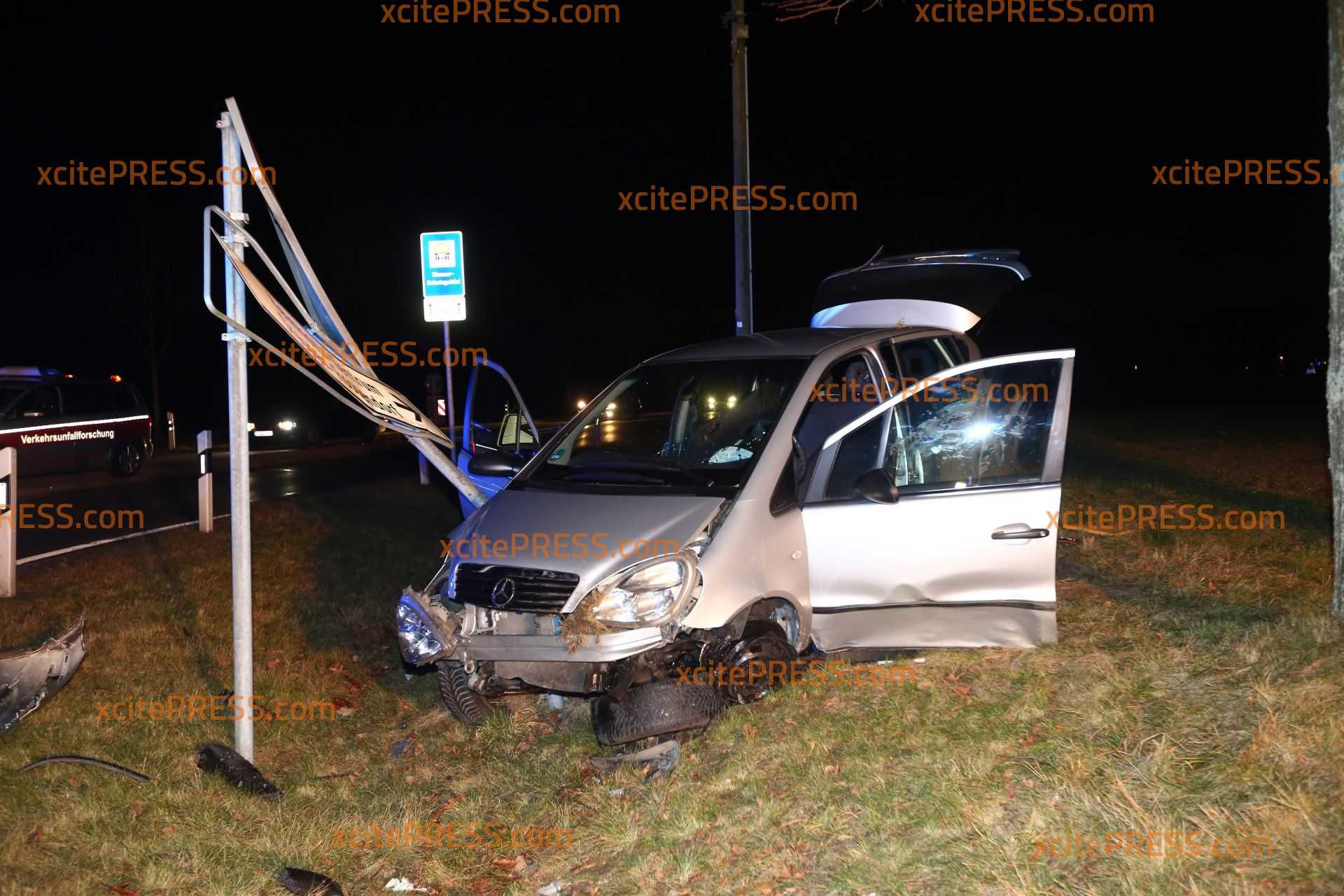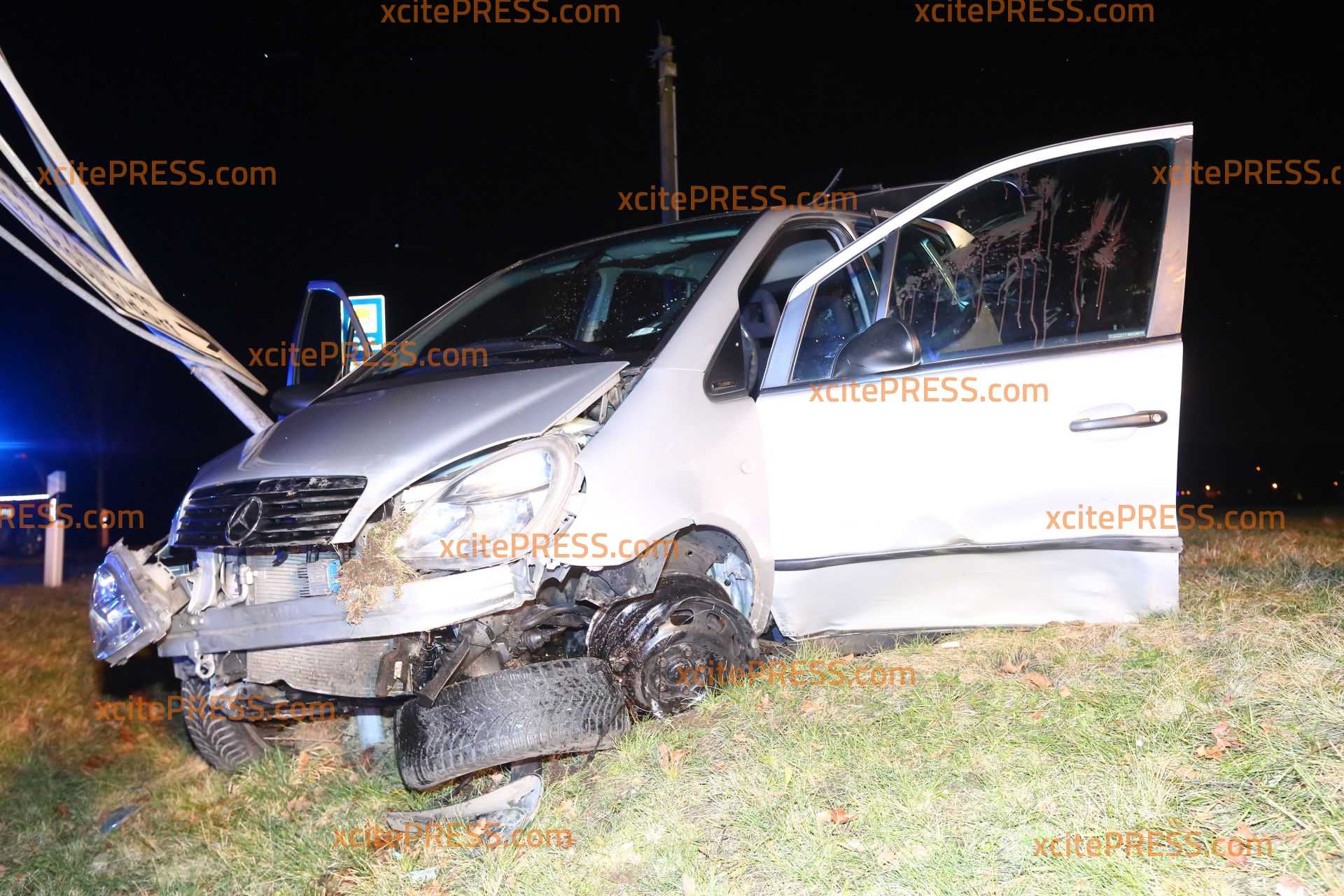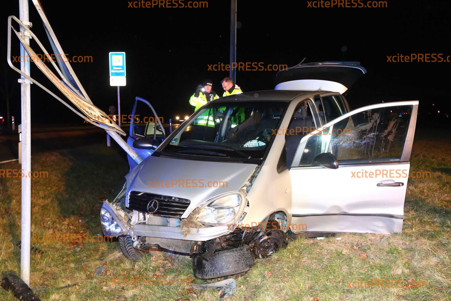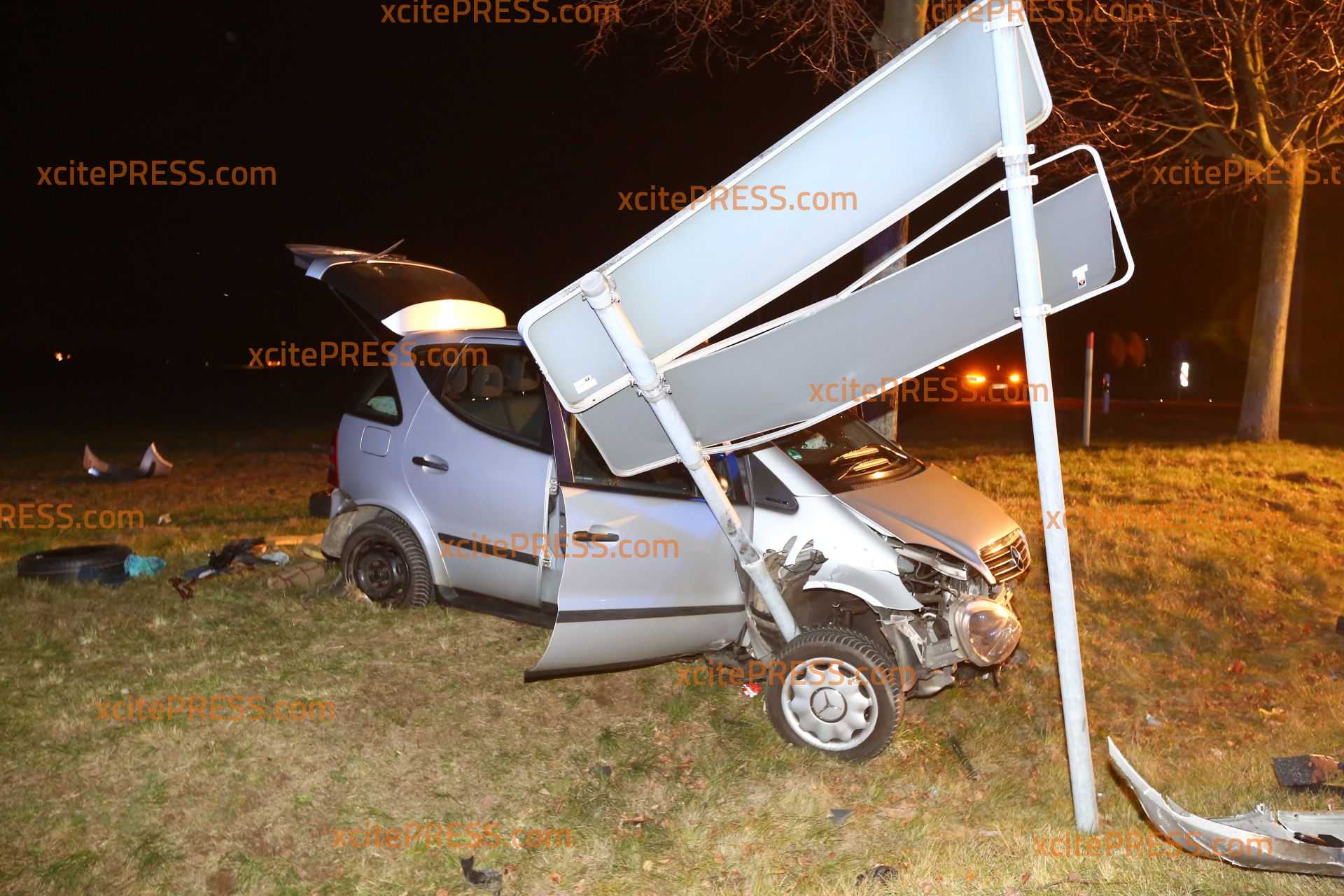 - demolierter Mercedes "hängt" an Ortsschildern