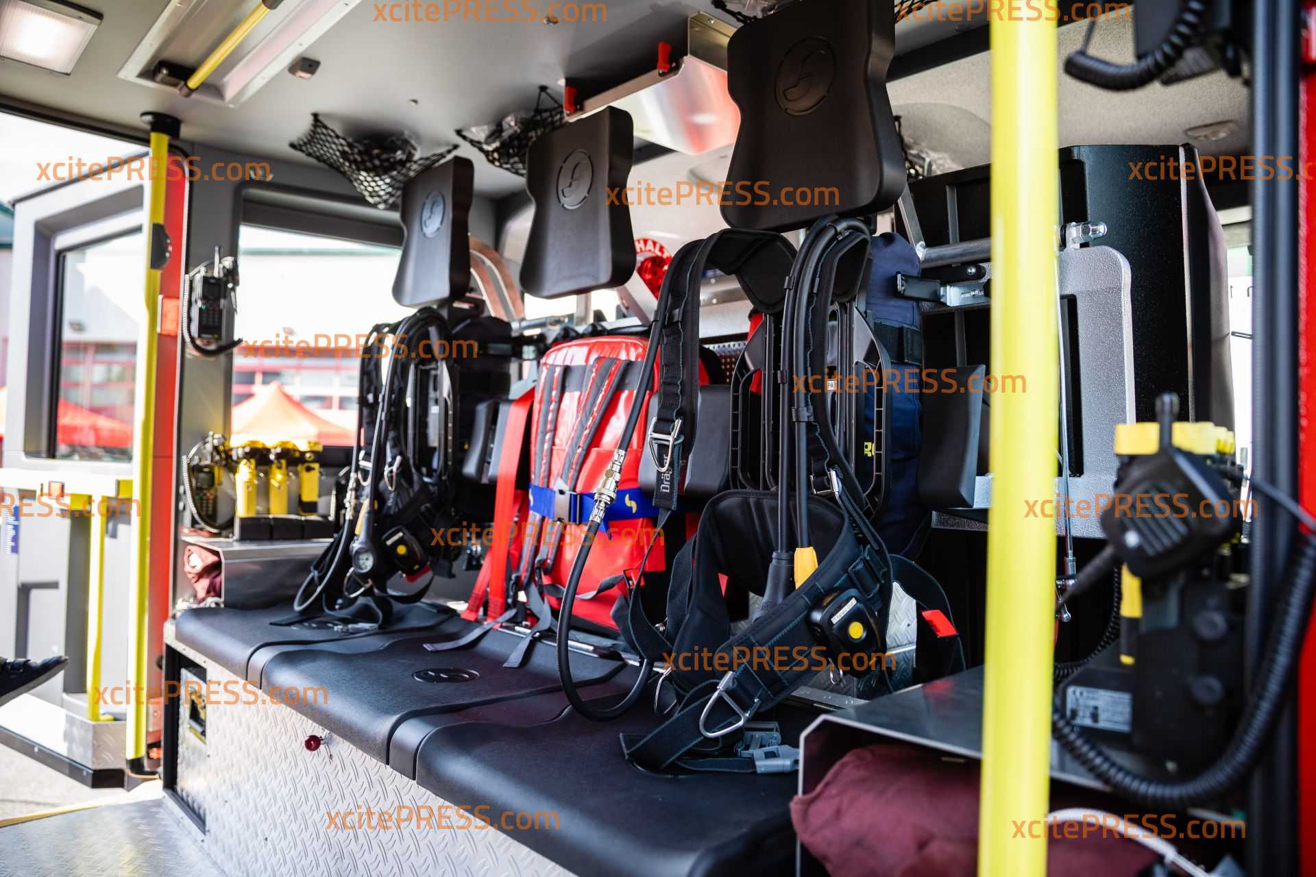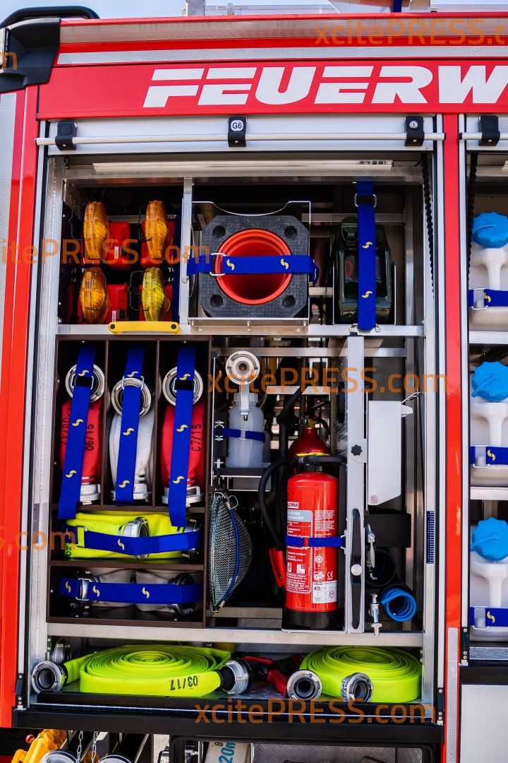 Insgesamt sind sieben Pressluftatemschutzgeräte auf dem HLF 20 verlastet. Eines davon ist für den Gruppenführer vorgesehen. Ein besonderes Highlight ist die Leiter- und Saugleitungsentnahme mithilfe eines Schlittens. Weitere Ausrüstungsgegenstände wie eine LKW-Rettungsplattform, schweres hydraulisches Rettungsgerät, ein Überdrucklüfter, ein Sprungretter und ein 14kVA-Notstromaggregat sorgen dafür, dass die Kameraden für viele Szenarien ausgestattet sind.