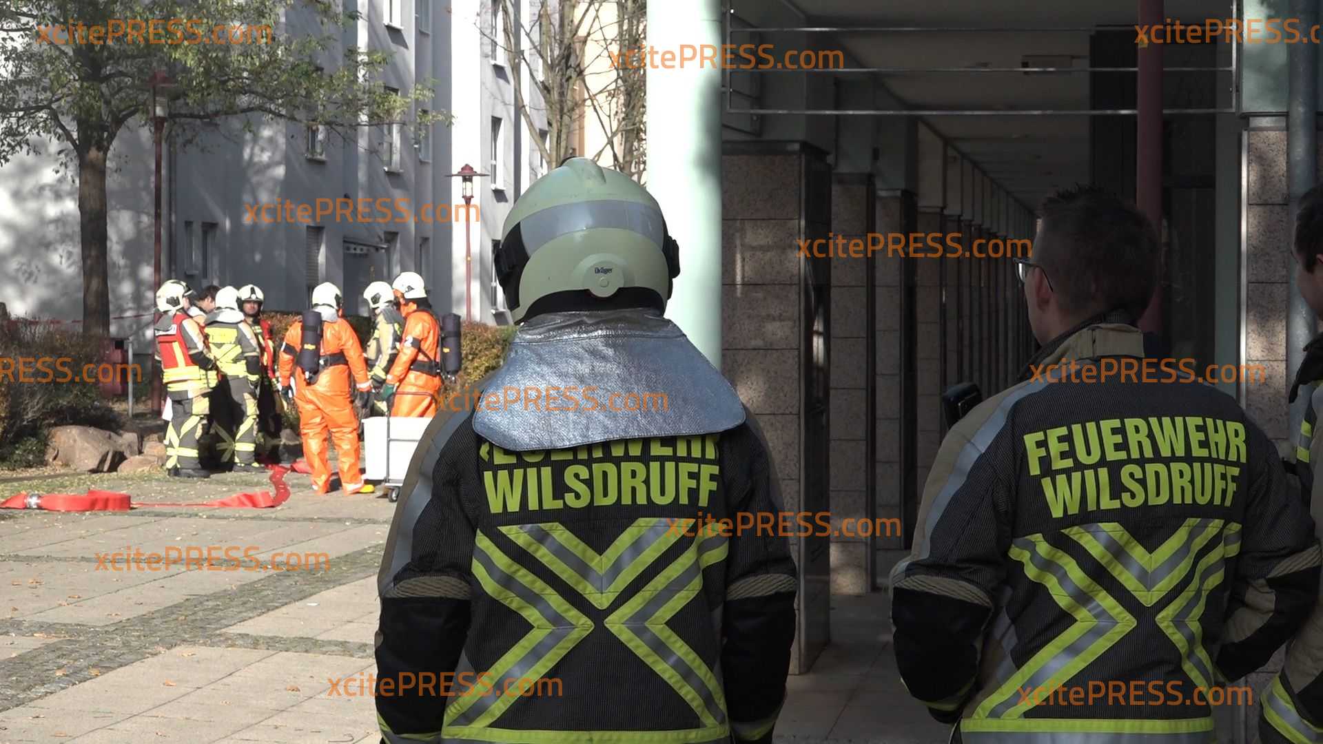 - Feuerwehr in Schutzanzügen stehen am Haus