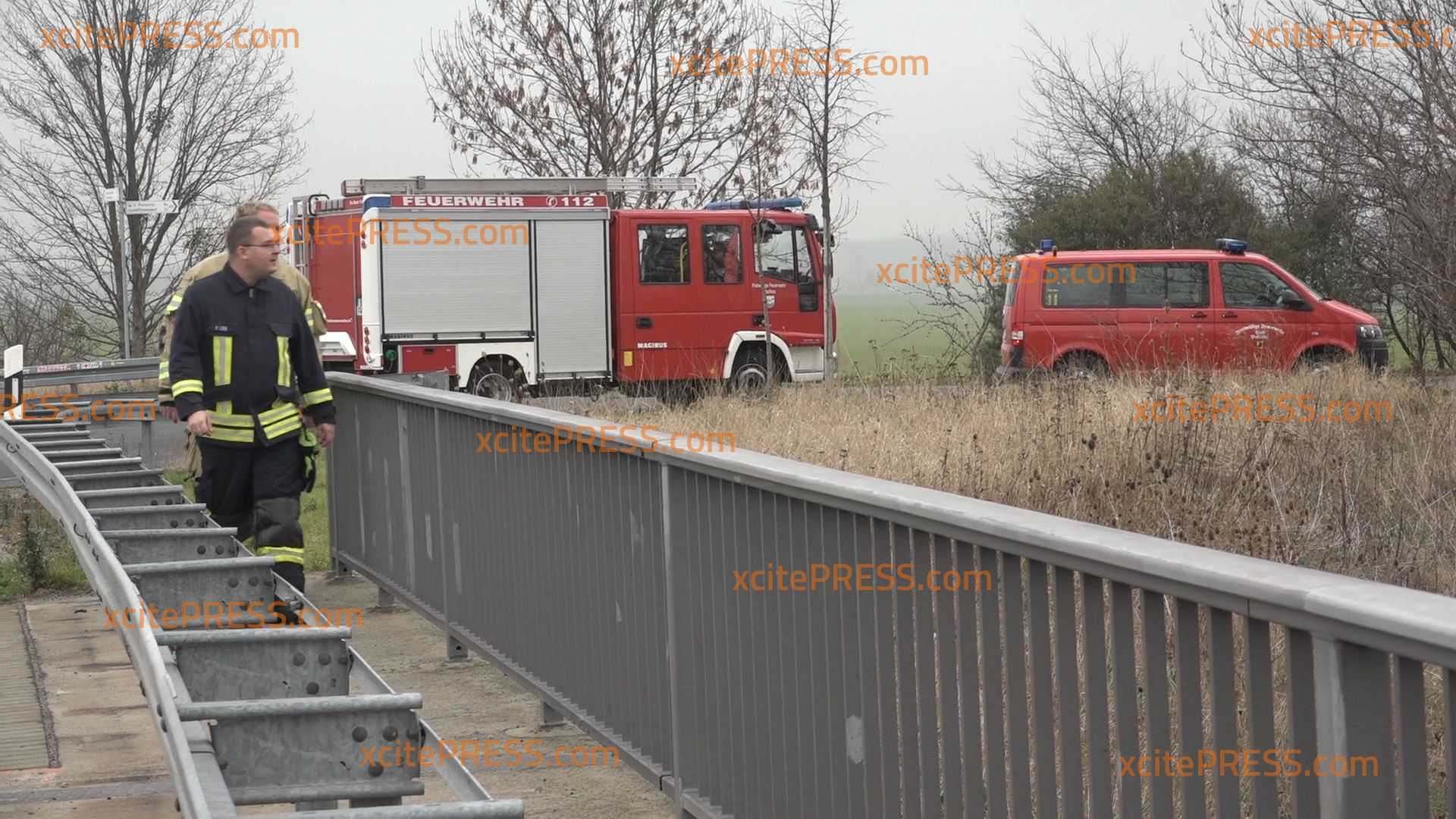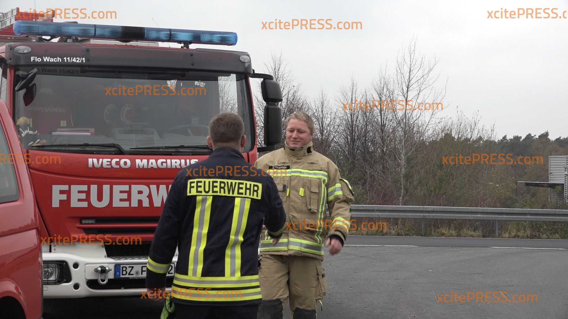 - Feuerwehrleute (R. Löb und D. Thamsen) kommen an Autobahnbrücke mit Feuerwehrfahrzeugen an