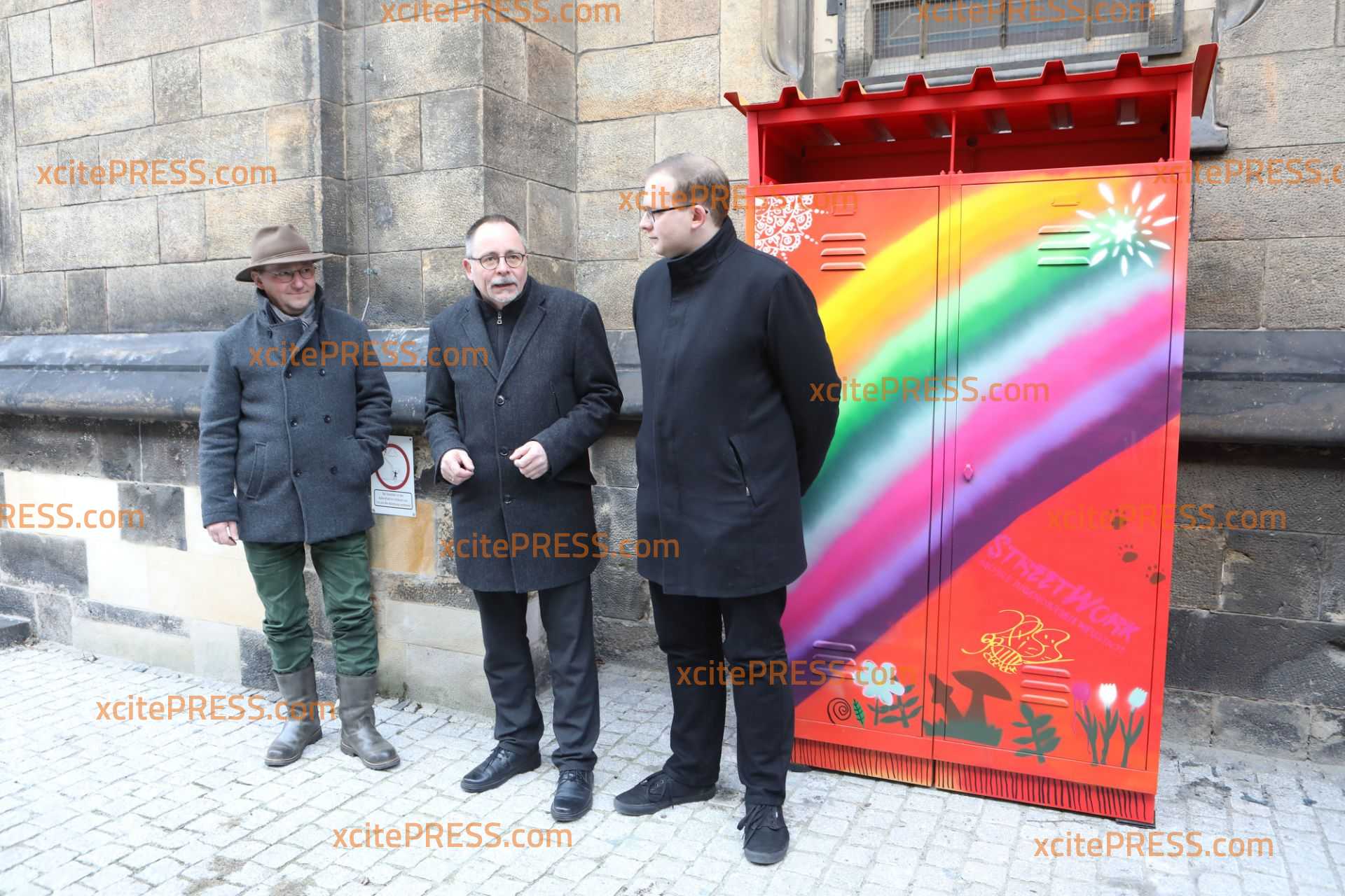 Am Dienstag gaben Stadtbezirksamtsleiter André Barth, Pfarrer Eckehard Möller und der Betreiber Christopher Colditz den Schrank zur Nutzung frei.