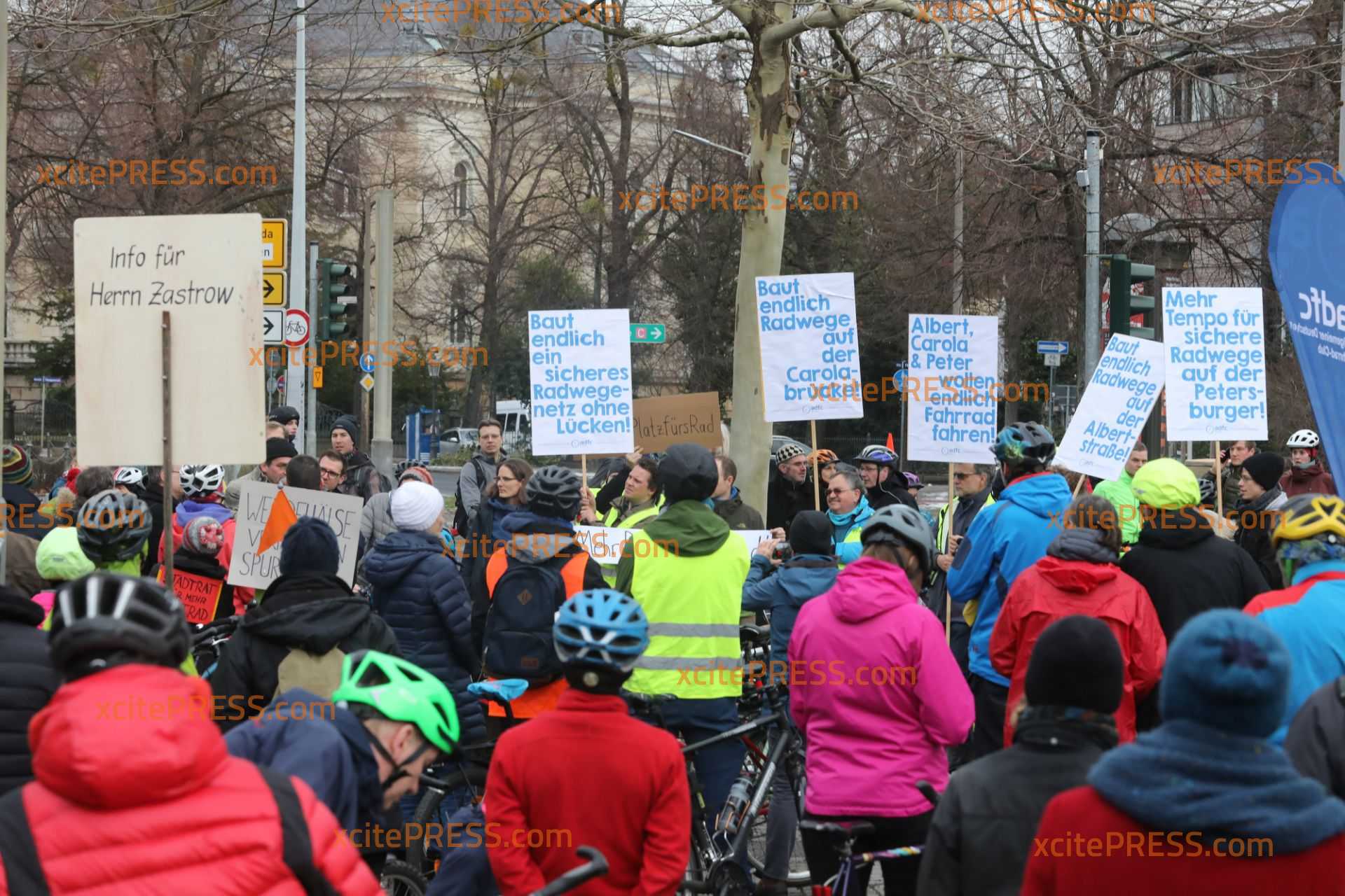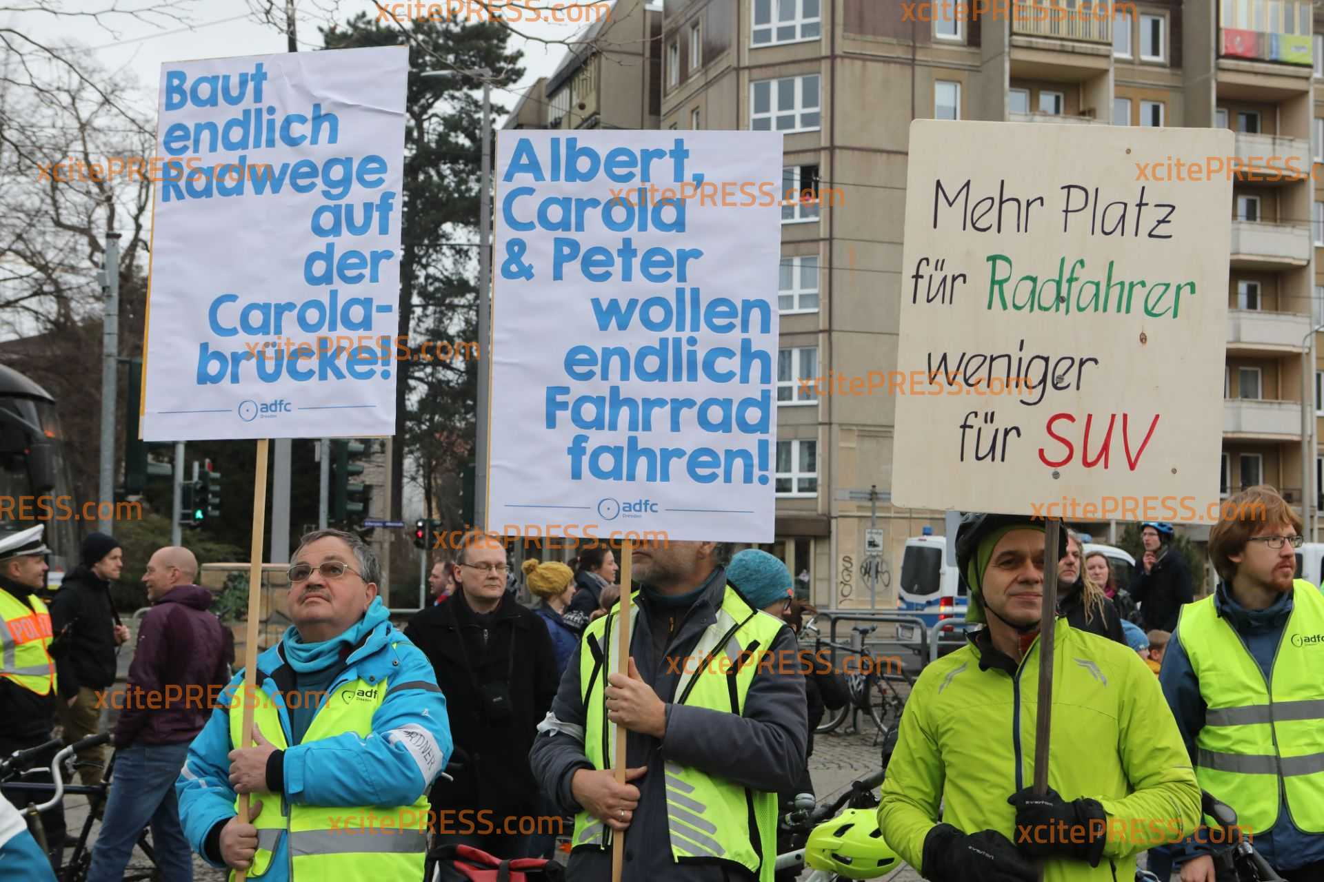 Unter dem Motto "Albert, Carola und Peter wollen endlich Radfahren!" demonstrierten 600 Radler für eine sichere und gut nutzbare Nord-Süd-Route. Der ADAF ist für mehr Platz für das Rad auf dieser wichtigen Verbindung, die nach Zahlen der Stadt Dresden im Jahr 2018 von über 50% mehr Radfahrer im Vergleich zu 2009 genutzt wurde! In der Albertstraße fordert der ADFC nach einer Petition auf beiden Seiten der Straße gut nutzbare, sichere und direkt geführte Radfahrstreifen. Auf der St. Petersburger Straße zwischen Wiener und Georgplatz fordert er eine andere, sichere Radverkehrsführung, die nicht zwischen parkenden Autos und eng überholenden Autos eingequetscht ist. Außerdem setzt sich der ADFC für die Schaffung regelkonformer Radverkehrsanlagen auf der Carolabrücke ein.