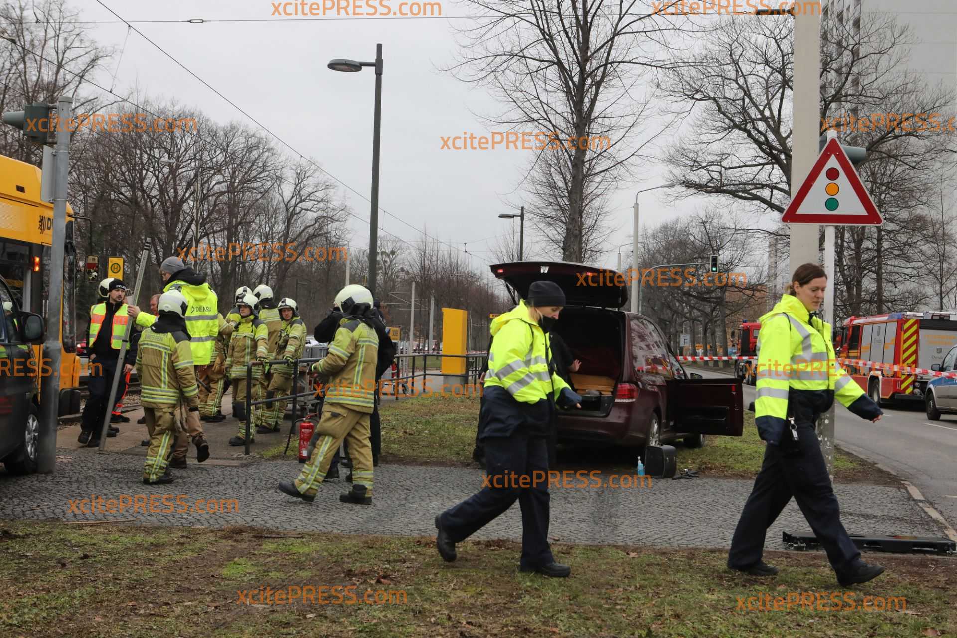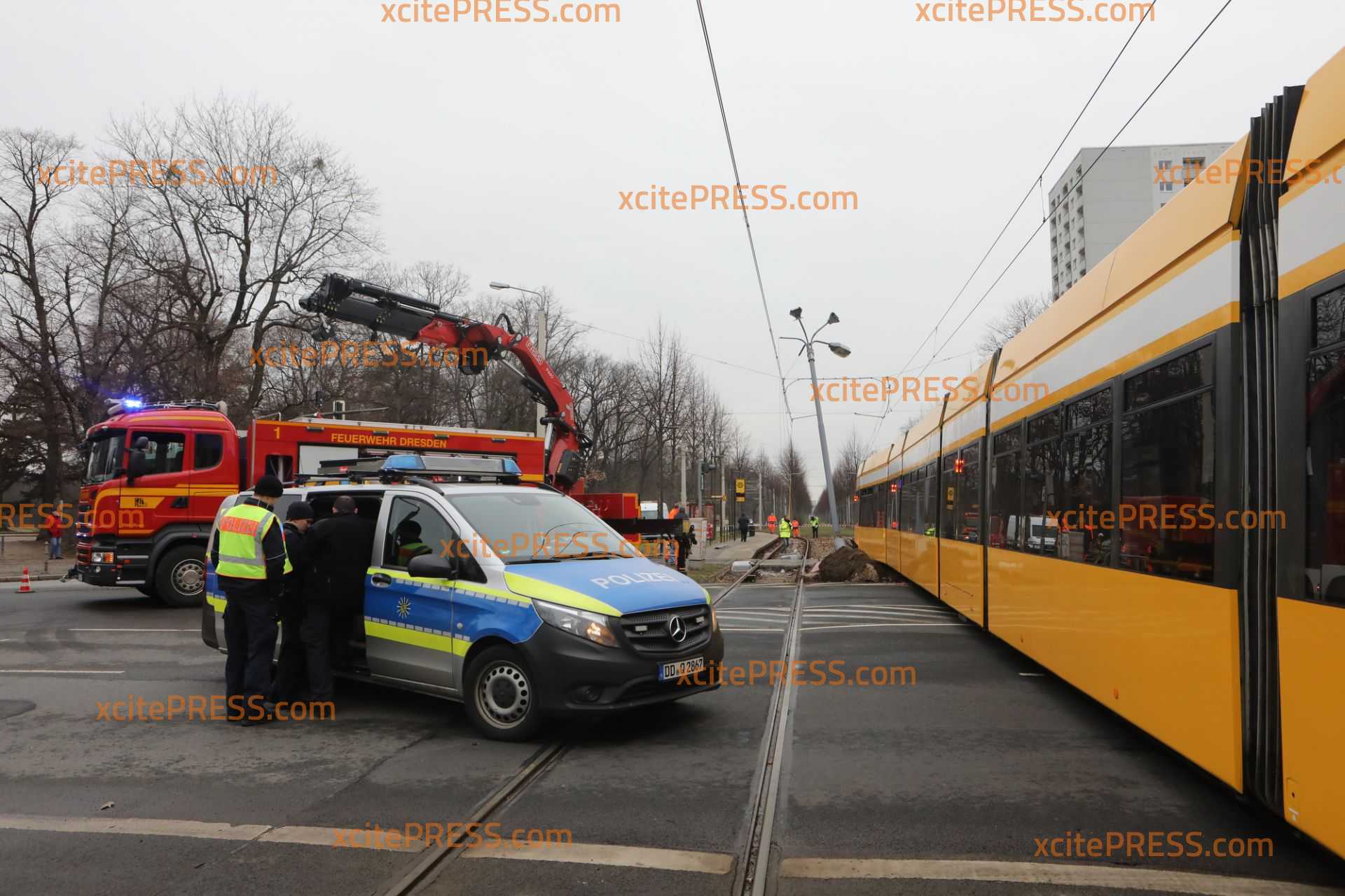 Zu einem schweren Verkehrsunfall kam es am Mittwochvormittag gegen 9.30 Uhr auf der Stübelallee Ecke Karcherallee. Aus bisher noch ungeklärter Ursache kollidierte eine Tram der Linie 2 mit einem noch über die Gleise fahrenden Hyundai, welcher anschließend noch mehrere Meter mitgeschleift wurde. Dabei wurde ein Laternenmast umgeknickt und fiel auf die Oberleitung. Ersten Informationen zur Folge wurde dabei eine Person schwerst verletzt und verstarb noch am Unfallort. Für die noch laufenden Rettung- und Bergungsmaßnahmen wurde die Kreuzung Stübelallee/ Karcherallee vollgesperrt. Die Polizei hat die Ermittlungen zum genauen Unfallhergang aufgenommen. Die Straßenbahnlinien 1 und 2 sowie die Buslinie 63 werden von der DVB umgeleitet.