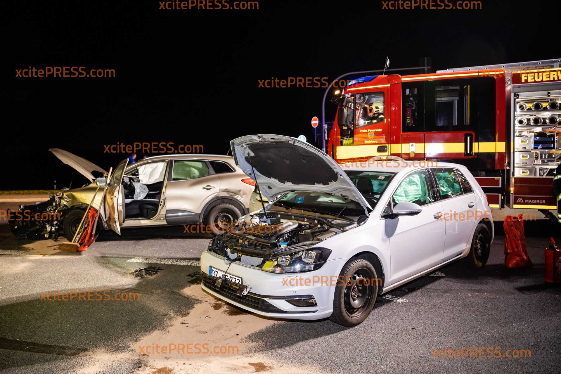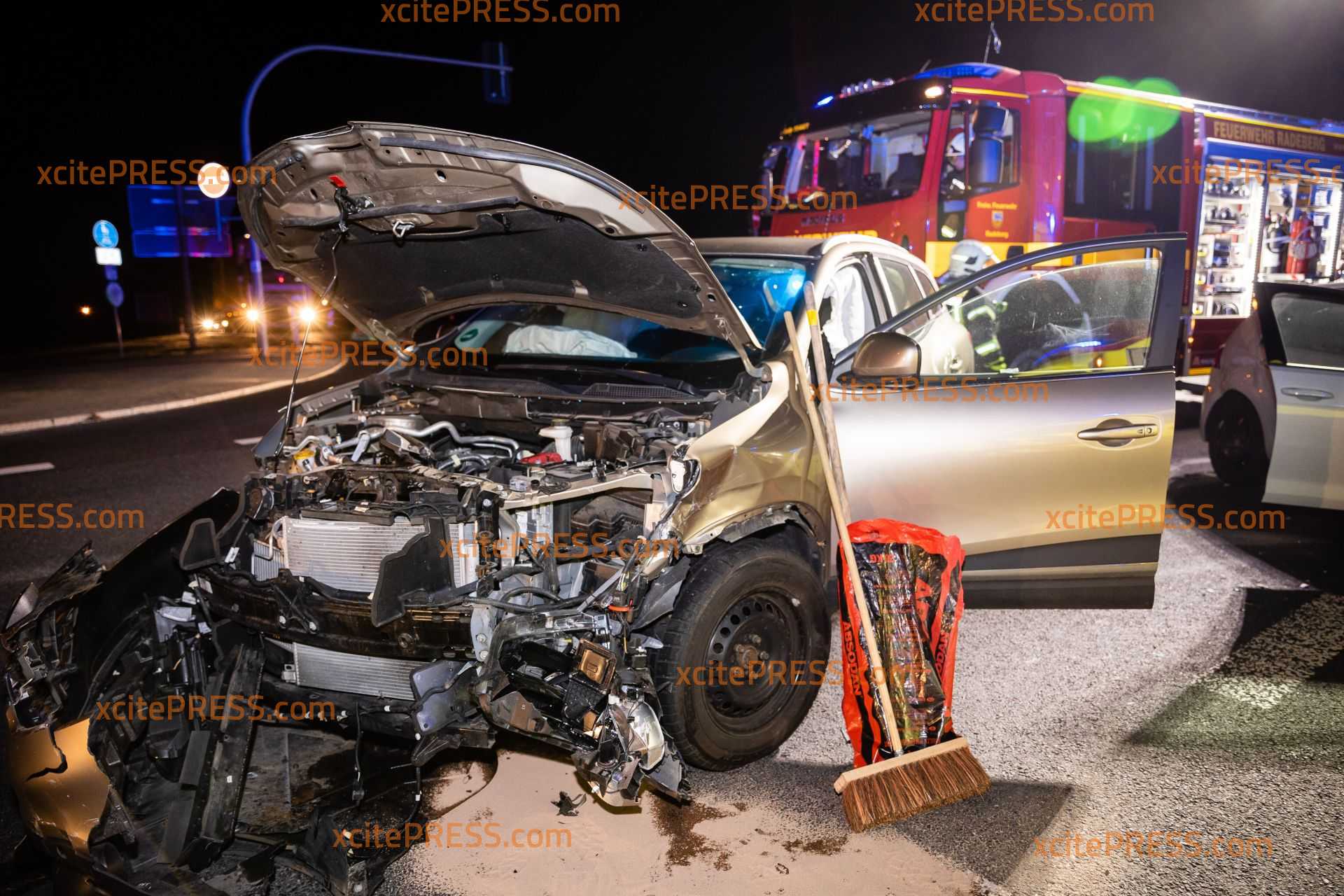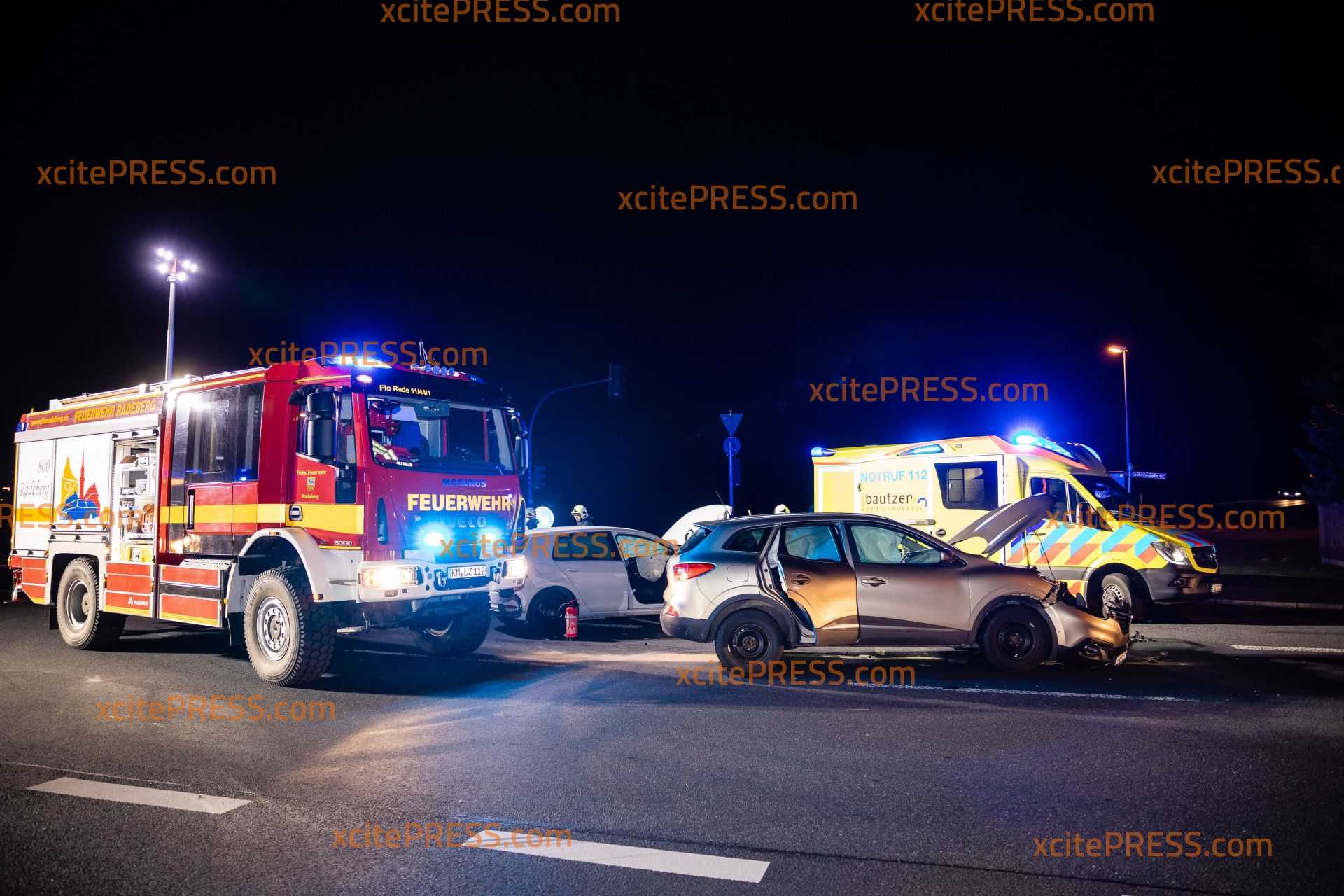 An einer Ampelkreuzung in Radeberg sind am Mittwochabend zwei Autos zusammengestoßen. Der Unfall geschah an der Kreuzung Kamenzer Straße/Großröhrsdorfer Straße. Noch ist unklar, warum der VW Golf mit dem Renault zusammenstieß. Die Ampelanlage war zum Zeitpunkt des Unfalls in Betrieb. Die Feuerwehr Radeberg rückte an, und sperrte den Kreuzungsbereich soweit ab, dass der Verkehr um die Unfallstelle herumgeführt wurde. Ein Rettungswagen versorgte einen Unfallbeteiligten und die Polizei nahm den Sachverhalt auf.