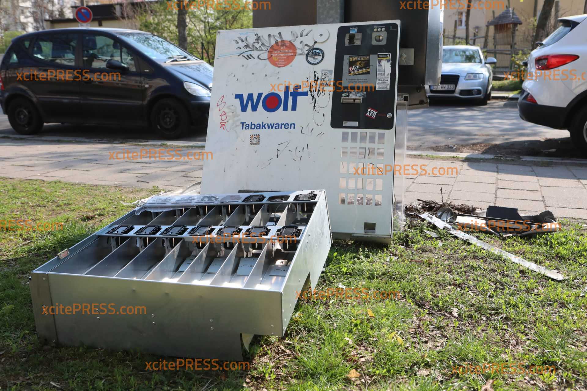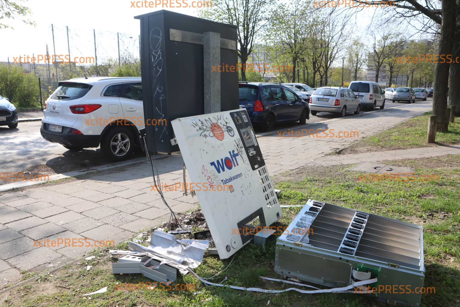 Unbekannte Täter sprengten vermutlich unter Verwendung von Pyrotechnik einen Zigarettenautomaten und entwendeten daraus Bargeld und Tabakwaren. Der Automat wurde dabei vollständig zerstört. Durch herumfliegende Trümmerteile wurden auch zwei parkende Pkw beschädigt.