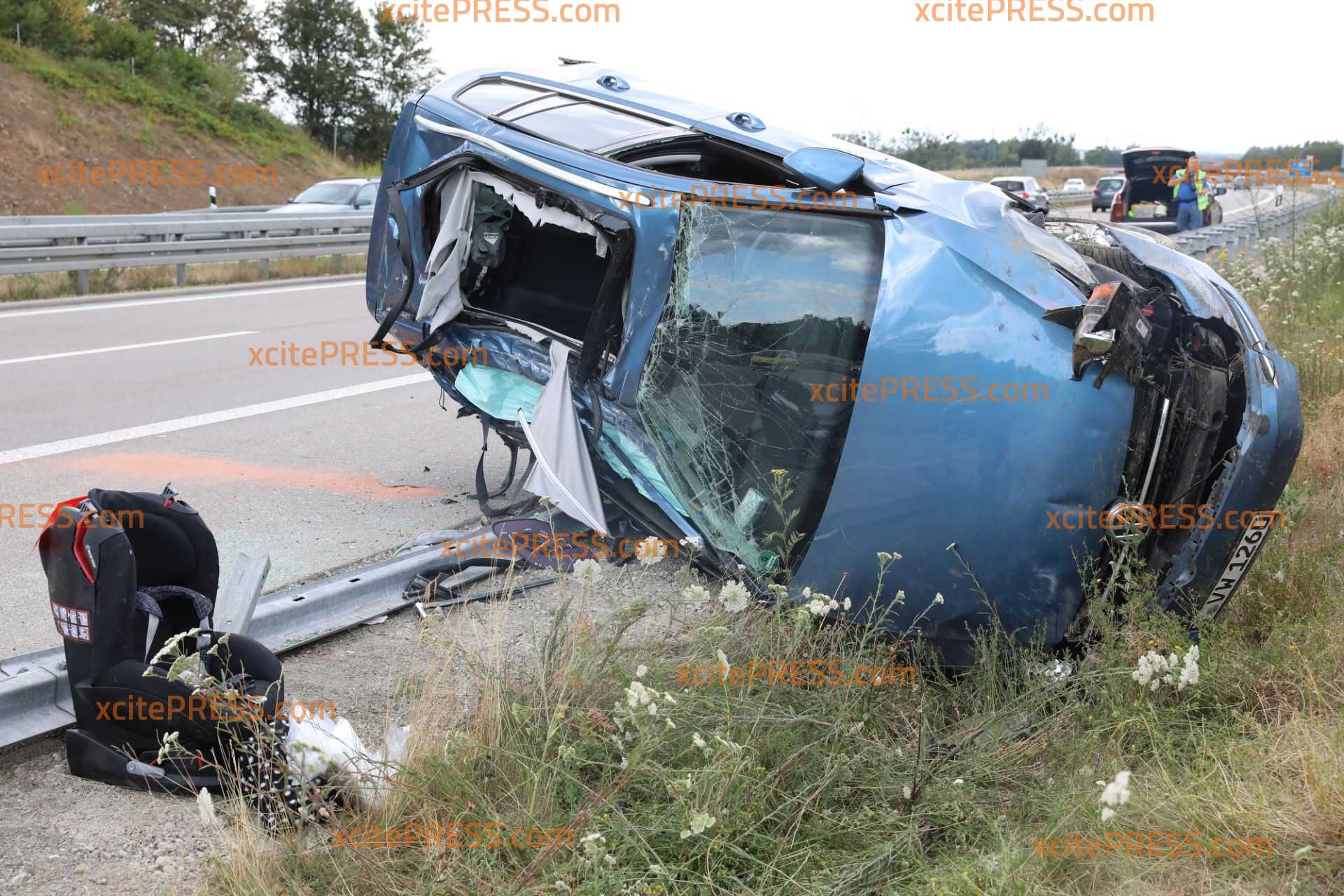 Plötzlich kam der VW Golf aus ungeklärter Ursache ins Schleudern, überschlug sich mehrfach, rammte ein Schild um und blieb auf der Seite neben der Autobahn liegen.
