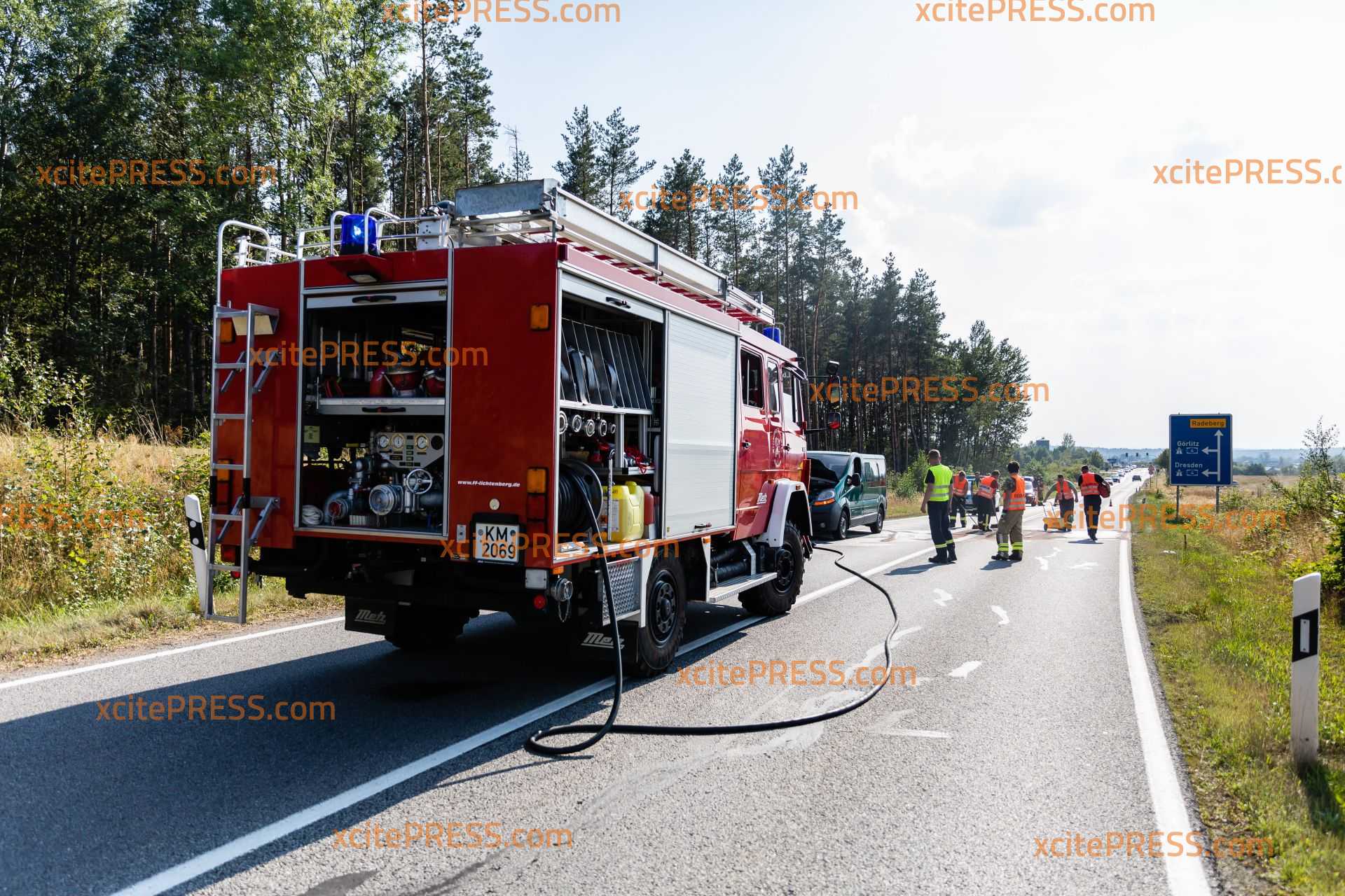 Auf der S95 ist am Samstagnachmittag zwischen Leppersdorf und Pulsnitz ein Transporter in Brand geraten. Während der Fahrt musste das Fahrzeug plötzlich gestoppt werden. Rauch drang aus dem Motorrad. Noch bevor die Feuerwehr eintraf, kam zufällig ein Rettungswagen vorbei. Die Rettungskräfte nutzten einen Feuerlöscher, um den Brand zu löschen. Die Feuerwehr erledigte dann den Rest. Möglicherweise hatte ein technischer Defekt den Brand ausgelöst. Während der Löscharbeiten war die S95 voll gesperrt.