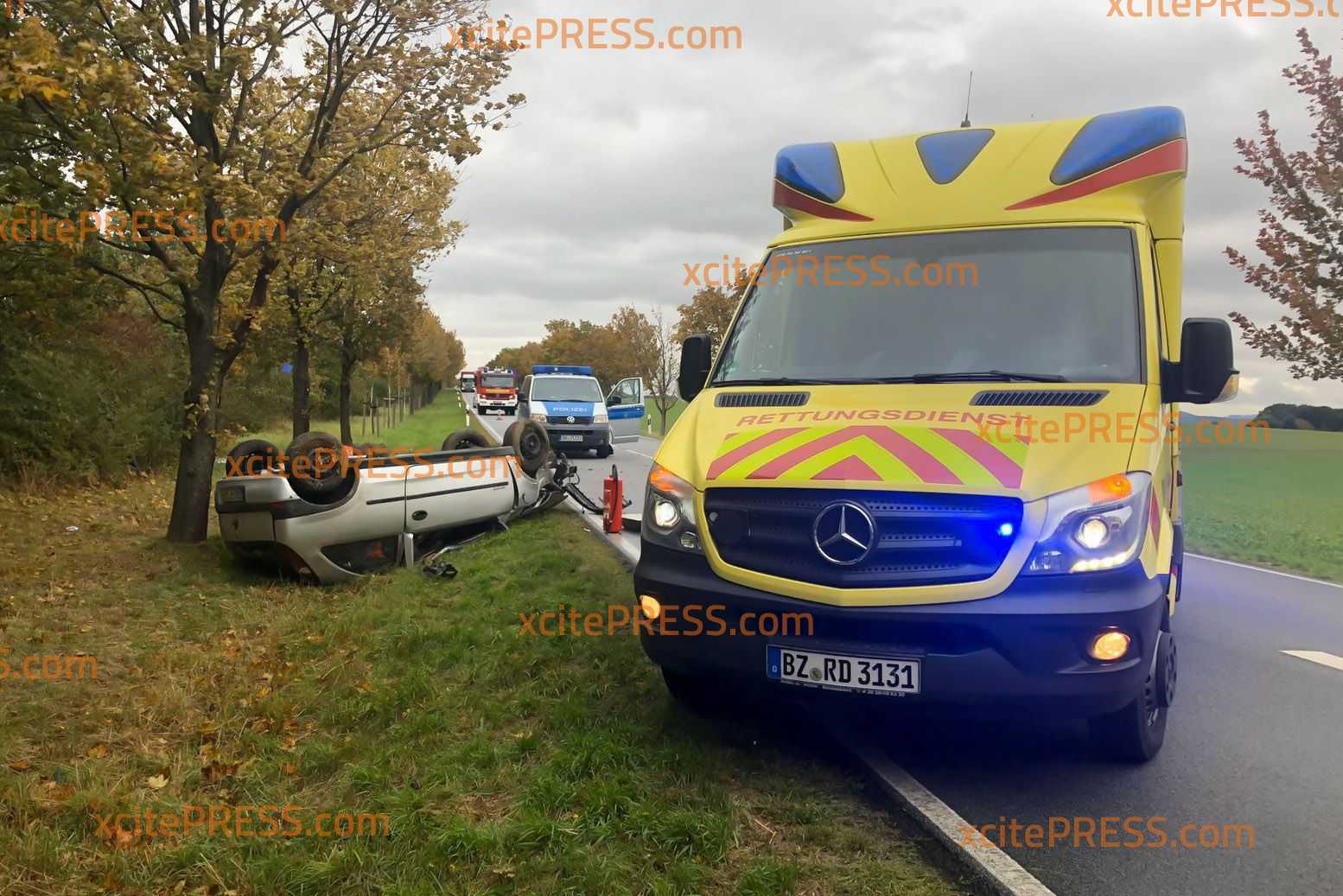 Auf gerader Straße überschlug sich der Opel bei regennasser Fahrbahn nachdem er gegen 2 Bäume gekracht war. Ersten Informationen zufolge wurden zwei Personen verletzt und in ein Krankenhaus gebracht, darunter eine Person mit einem Rettungshubschrauber.