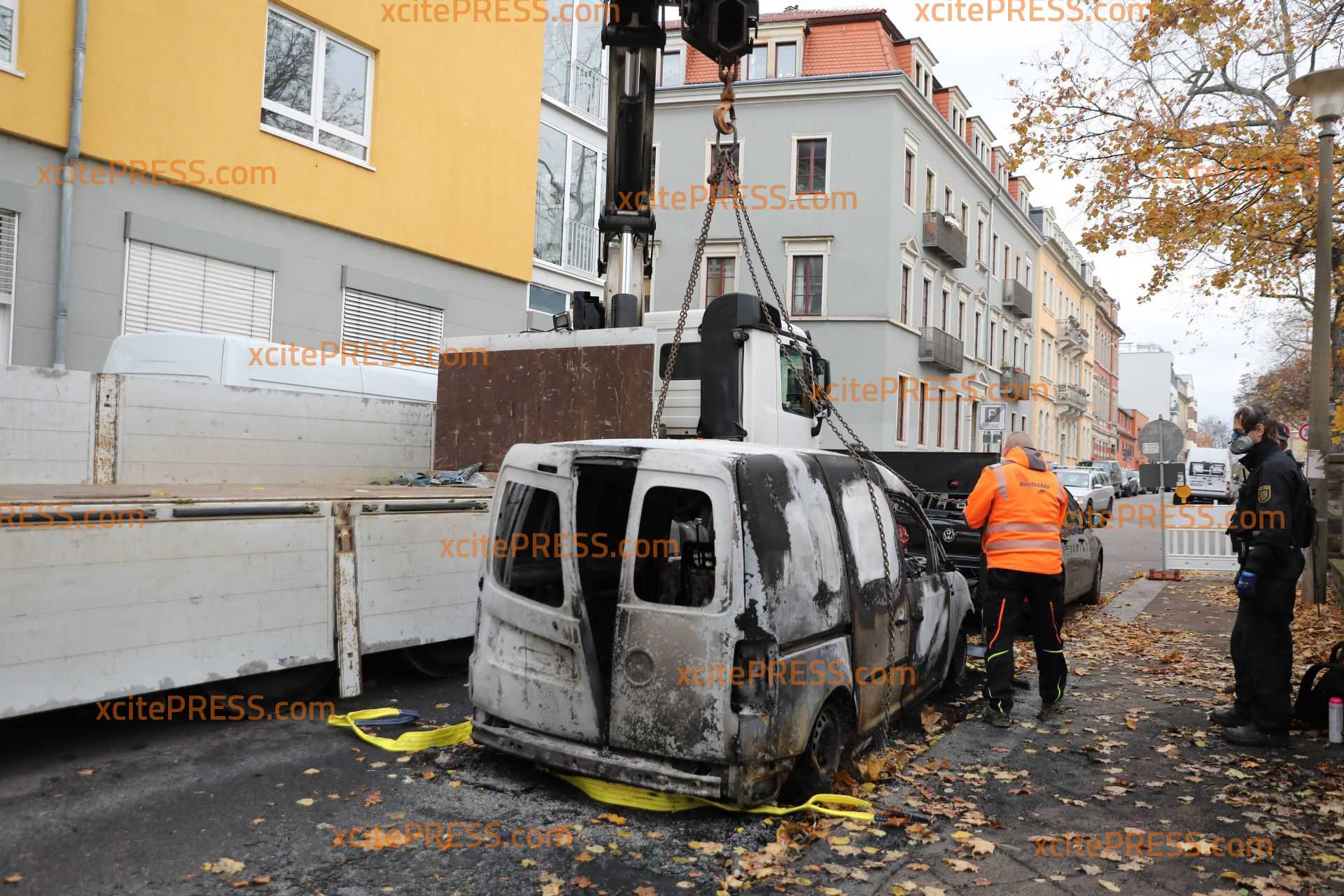 Ein Caddy der Baufirma Hentschke Bau GmbH stand die Nacht in der Dresdner Neustadt in Flammen. Das Fahrzeug wurde am Morgen durch Brandursachenermittler untersucht - letztlich durch die Firma Hentschke abgeholt.