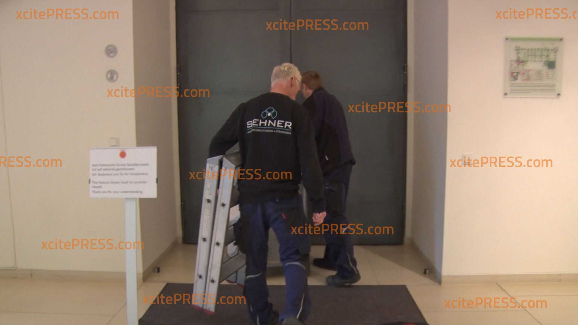 Erste Reparaturarbeiten im Inneren?! Mitarbeiter gehen an Eingangstür zum Grünen Gewölbe ein und aus