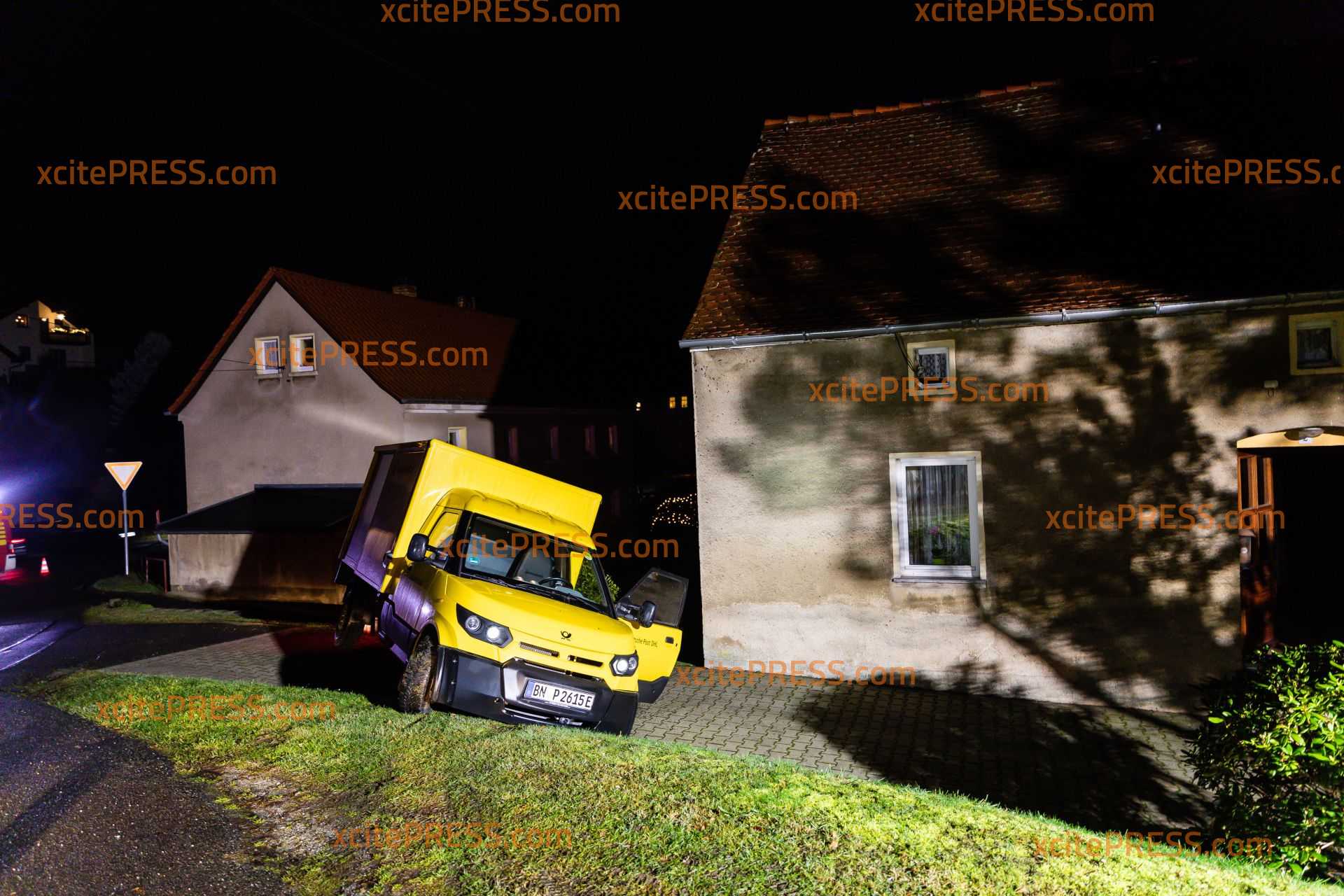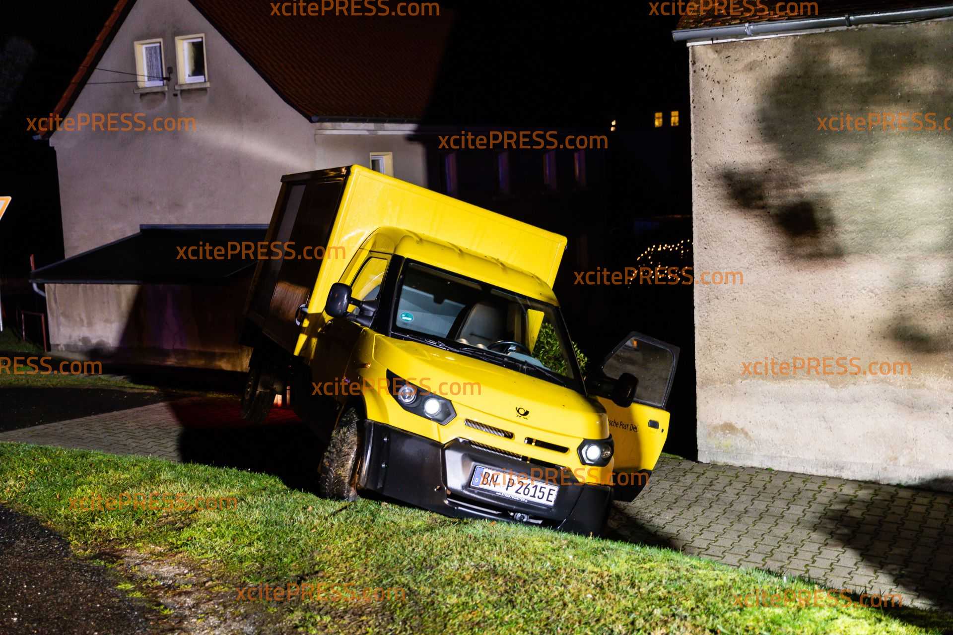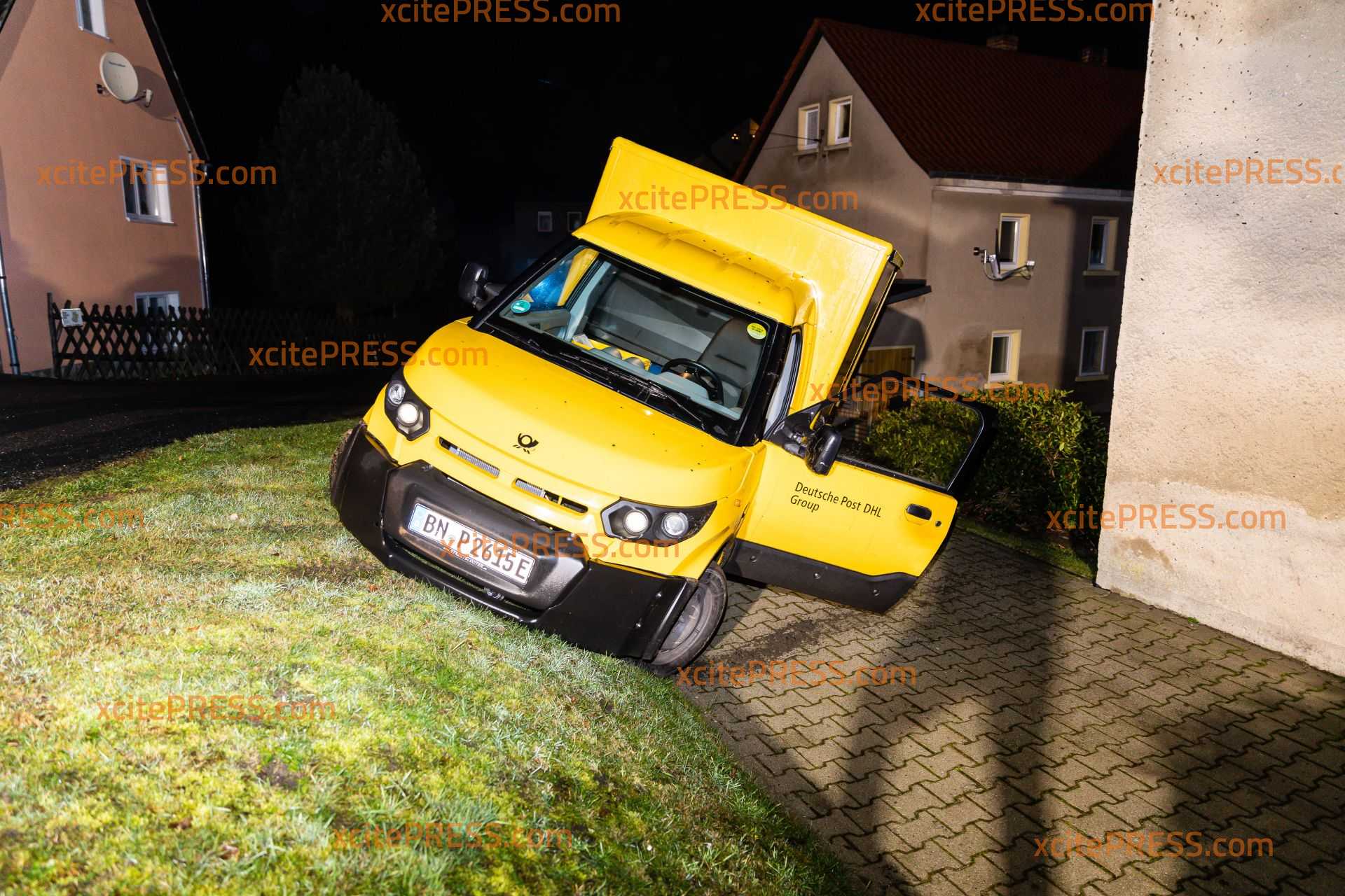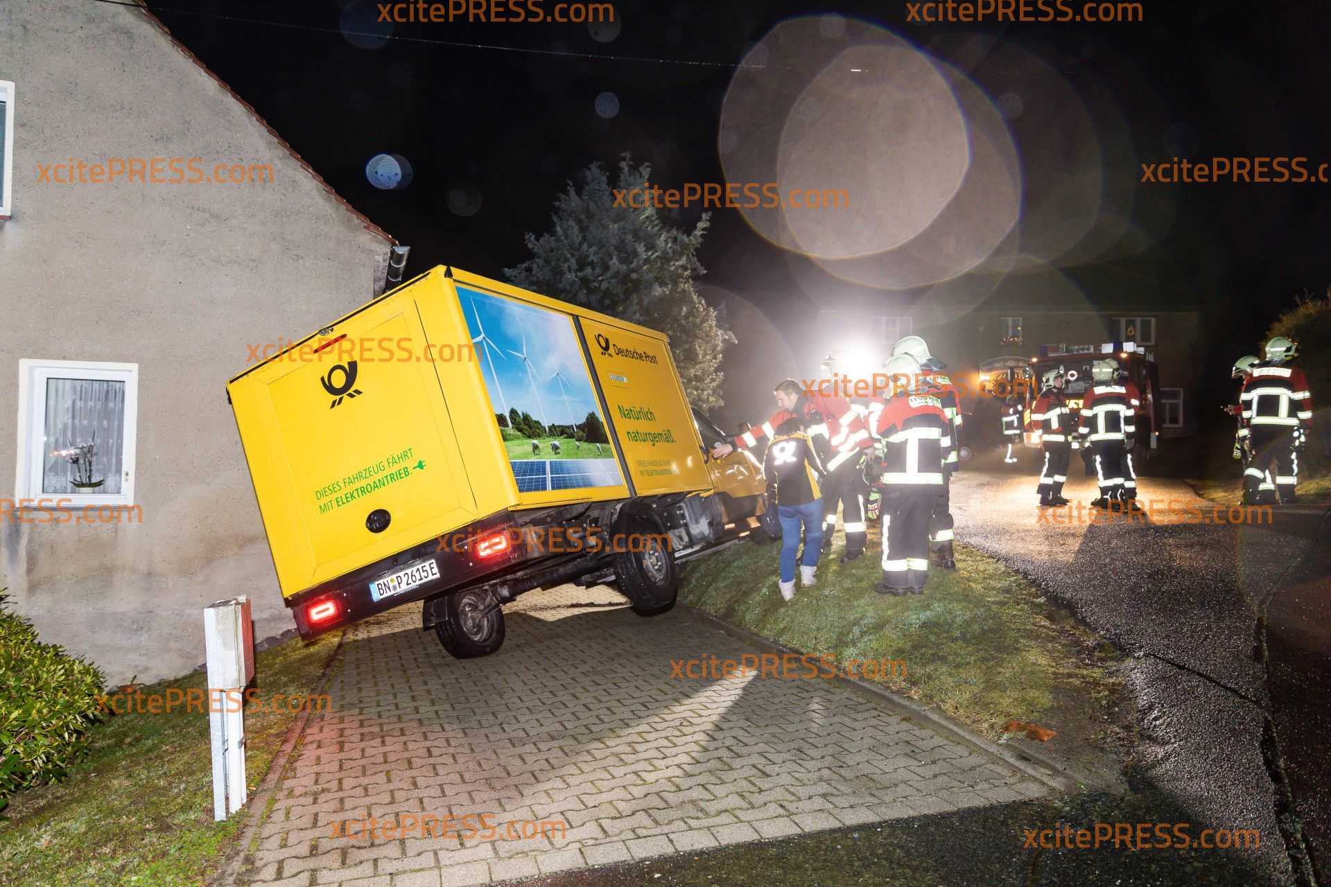 Ein Postauto in Schräglage hat am Dienstagabend die Freiwillige Feuerwehr in Frankenthal bei Bischofswerda beschäftigt. Auf einer Nebenstraße hatte die Postbotin offenbar mit dem Streetscooter rangiert und war dabei an einem Hang in die verzwickte Situation geraten. Das Elektrofahrzeug blieb so schräg stehen, dass es umzukippen drohte. Mit zahlreichen Briefsendungen an Bord musste der Wagen erstmal stehen bleiben. Die ehrenamtlichen Helfer der örtlichen Feuerwehr rückten an, sperrten das Gelände weiträumig ab und sicherten das Zustellfahrzeug. Dazu wurde ein Stahlseil über einen sogenannten Greifzug mit einem geeigneten Anschlagmittel am Löschfahrzeug und das Gegenstück am verunglückten Fahrzeug befestigt. So konnte ein weiteres Abrutschen ausgeschlossen werden. Ein Abschleppunternehmen übernahm dann die fachgerechte Bergung des Autos. Währenddessen leuchtete die Feuerwehr die Einsatzstelle noch aus. Im Einsatz waren 15 Kameraden der Feuerwehr mit drei Fahrzeugen.