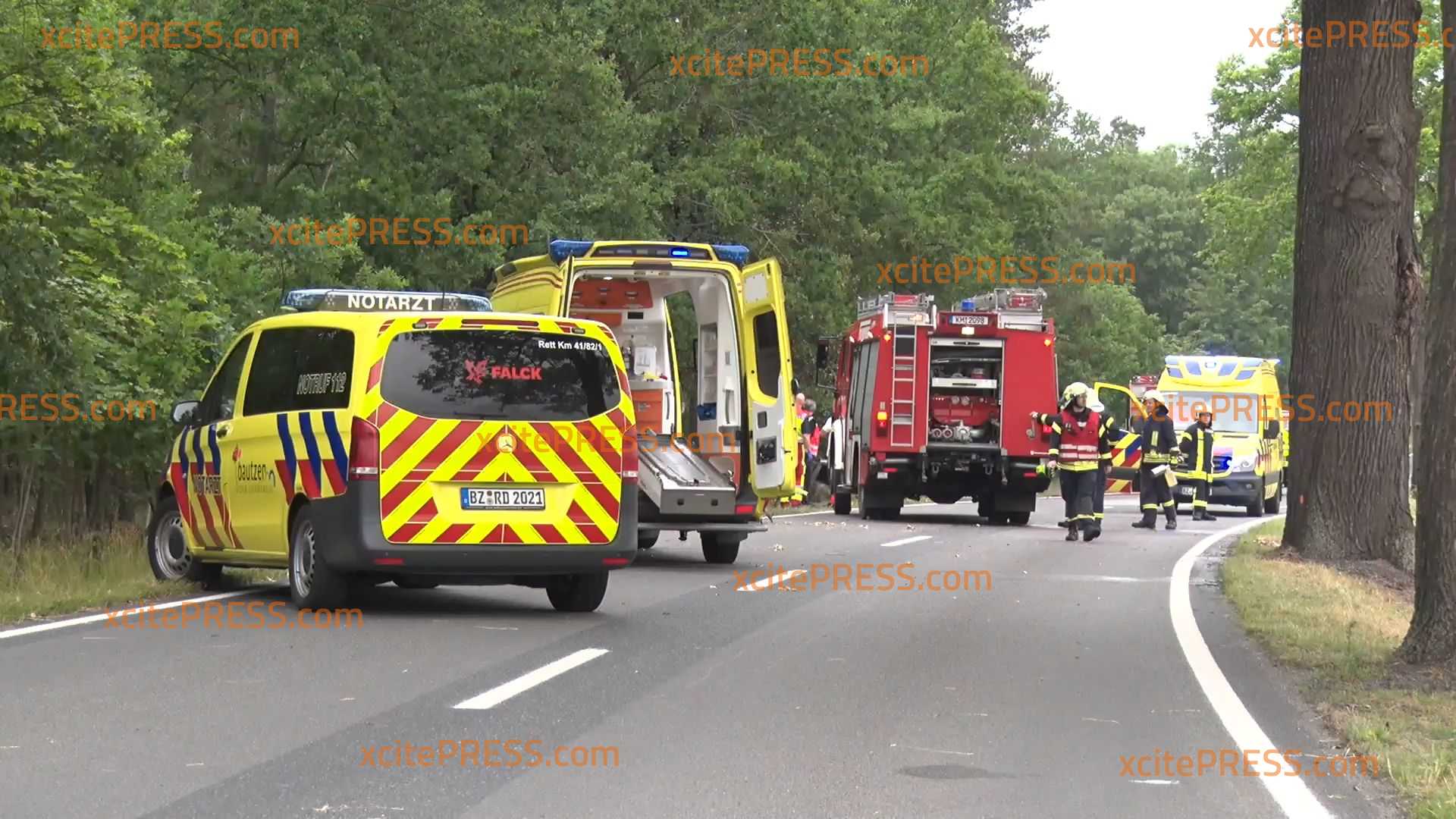Zu einem schweren Verkehrsunfall kam es am Sonntagmorgen gegen 8.15 Uhr auf der Bundesstraße 97. Zwischen Schmorkau und Schwepnitz verlor der Fahrer (20) eines Kleinwagens in einer Rechtskurve aus noch ungeklärter Ursache die Kontrolle über sein Fahrzeug und kollidierte mit einem Baum. Als die Rettungskräfte eintrafen stand der PKW bereits in Flammen - der Fahrer konnte trotz des schnellen Einsatz nicht mehr gerettet werden und verbrannte in dem Fahrzeug.