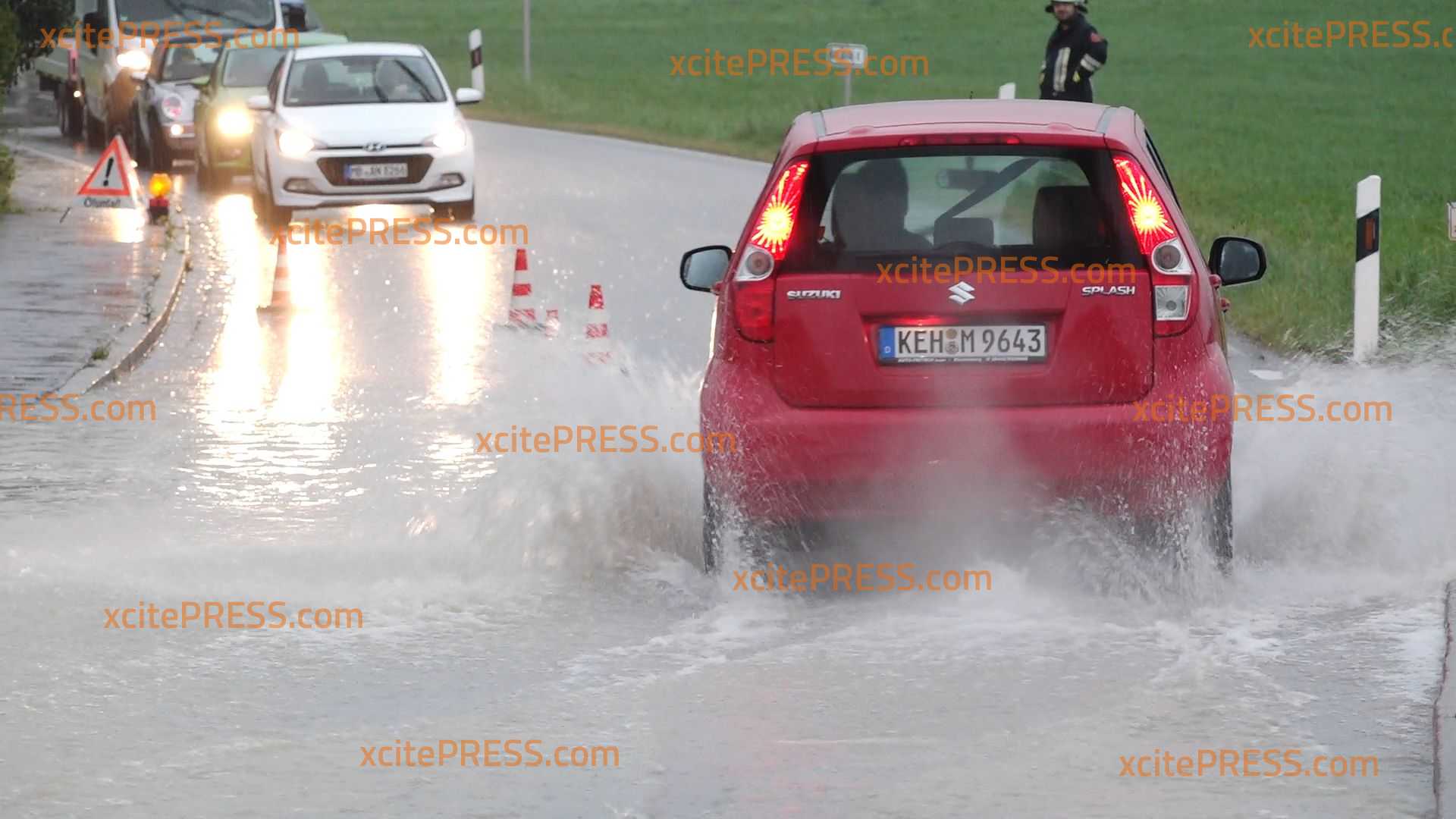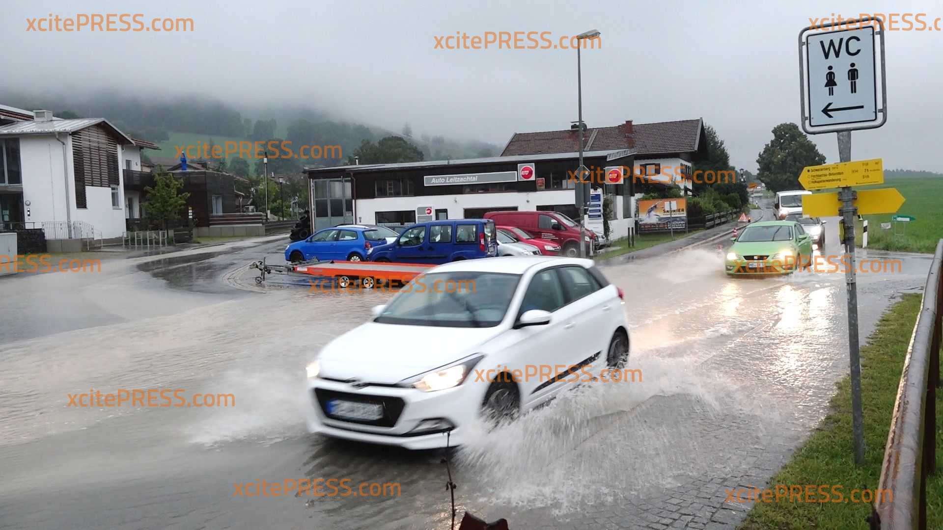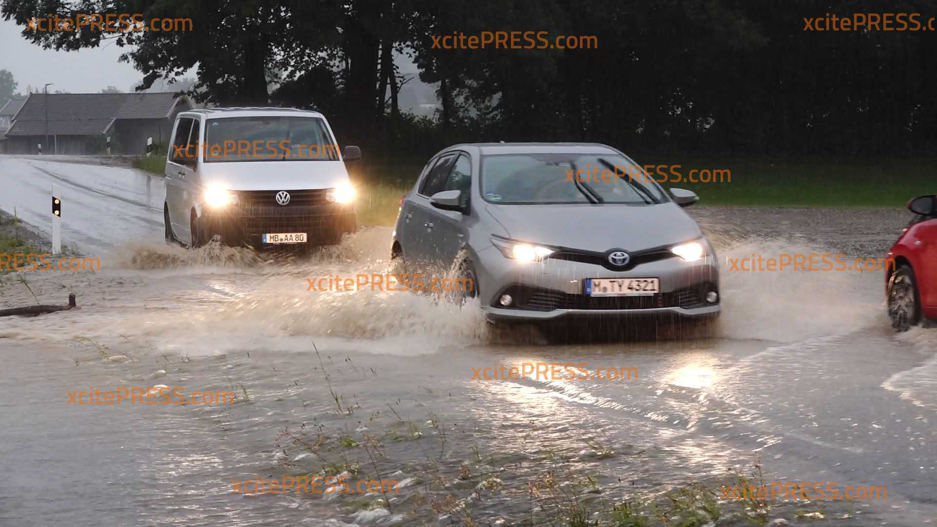 Auch bei Bad Feilnbach sieht man die ersten Auswirkungen des anhaltenden Regens: Autos quälen sich durch überflutete Straßen und kleinere Flüsse werden reißerisch.