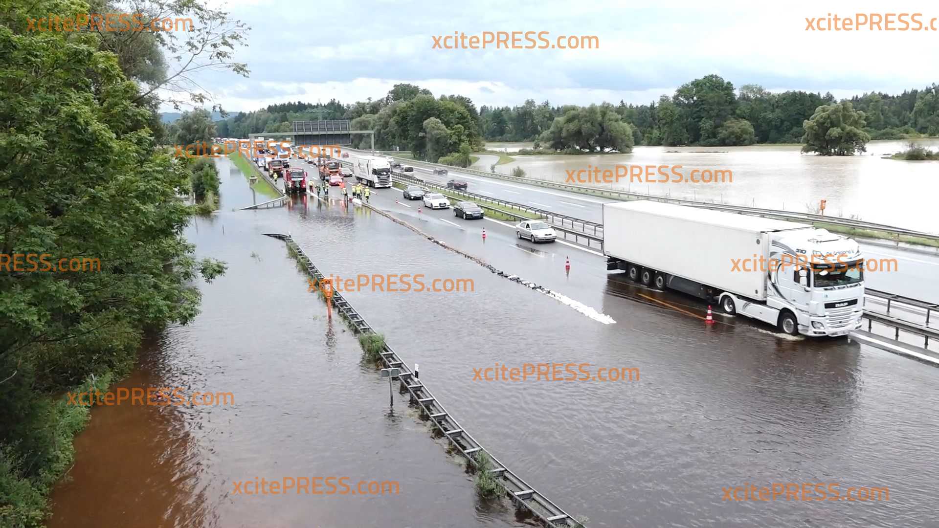 Die Feuerwehr und das THW stellt nunmehr auf der A8 bei Bad Aibling mit Sandsäcken sicher, dass die Fahrzeuge rollen können. Noch immer gibt es erhebliche Verkehrsbehinderungen.
