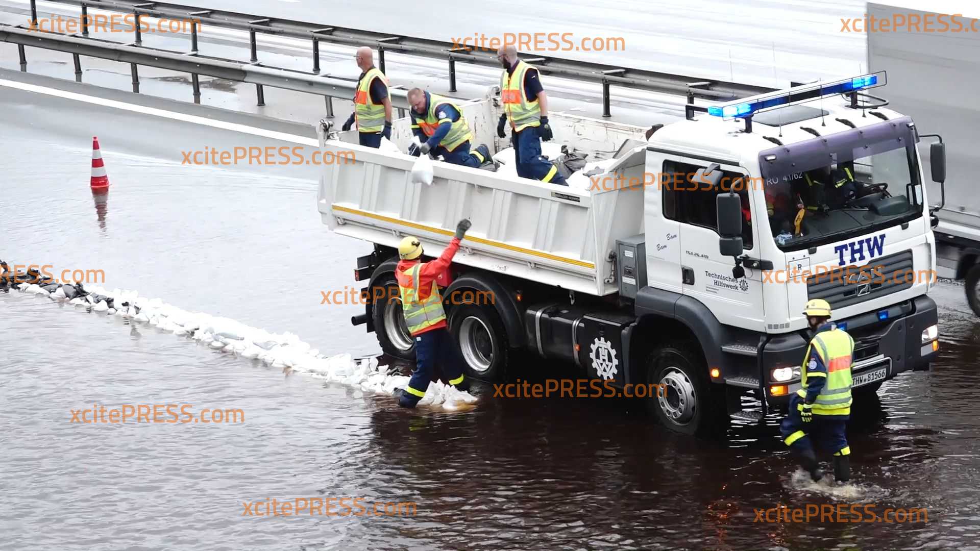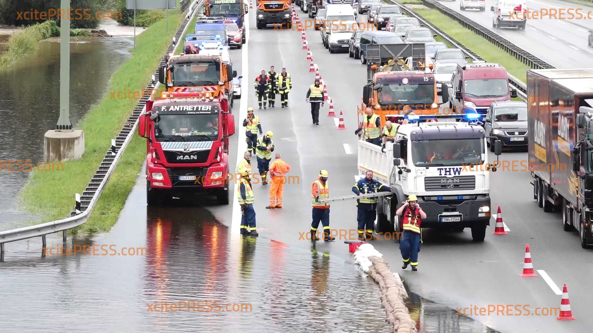 Unwetter überflutet die Autobahn 8 - Feuerwehr und THW sichert zweite Fahrspur mit Sandsäcken