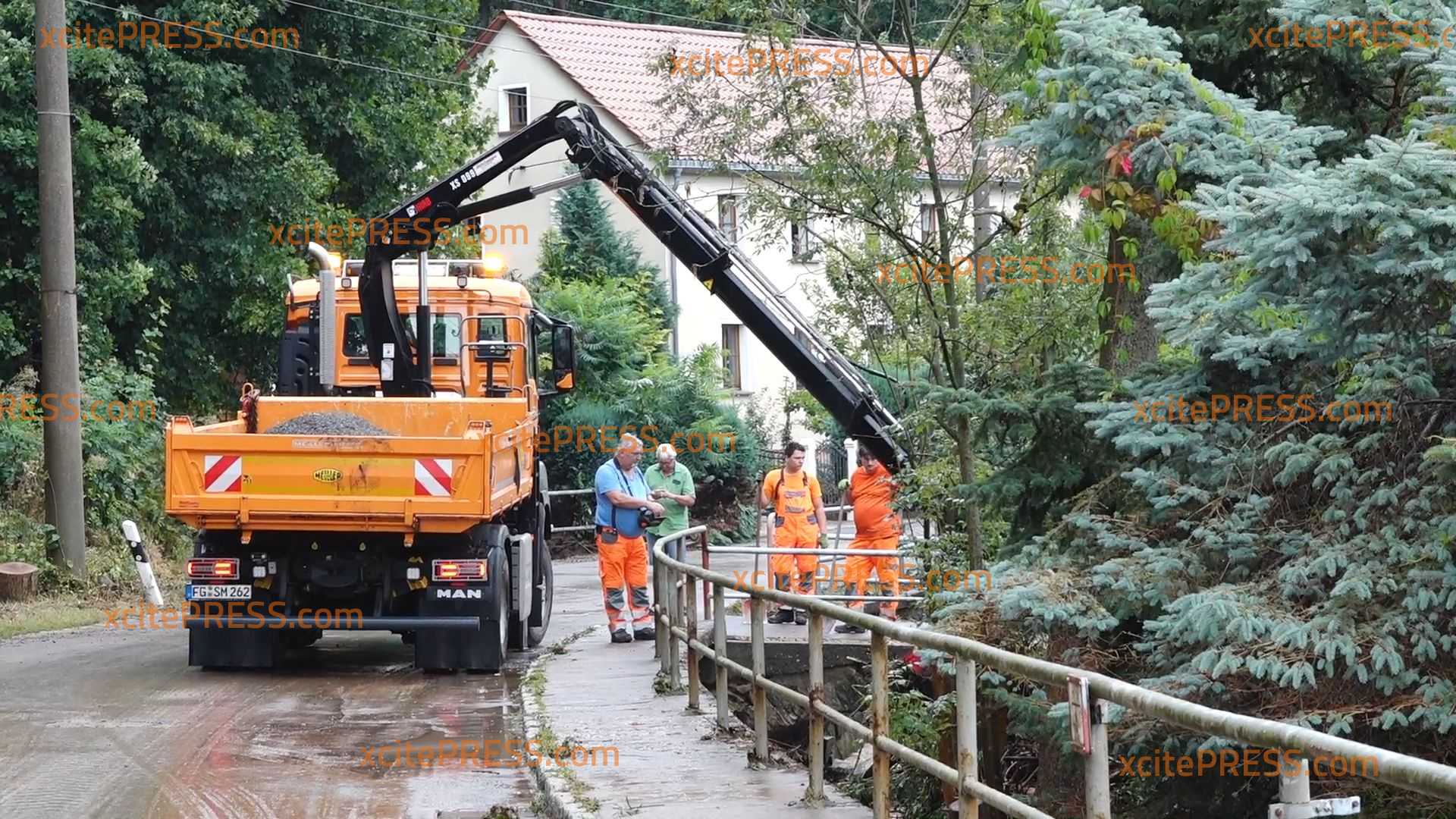 Nach dem massiven Unwetter im Landkreis Mittelsachsen wurden am frühen Nachmittag die Überreste beseitigt. Hierfür kam auch schweres Gerät zum Einsatz. Stärkere Äste werden aus dem Fluss geholt um weitere Schäden zu vermeiden. Die Feuerwehr ist hier dauerhaft im Einsatz. Gemeinsam mit den Anwohnern wird versucht so schnell wie möglich die Schäden zu beseitigen.