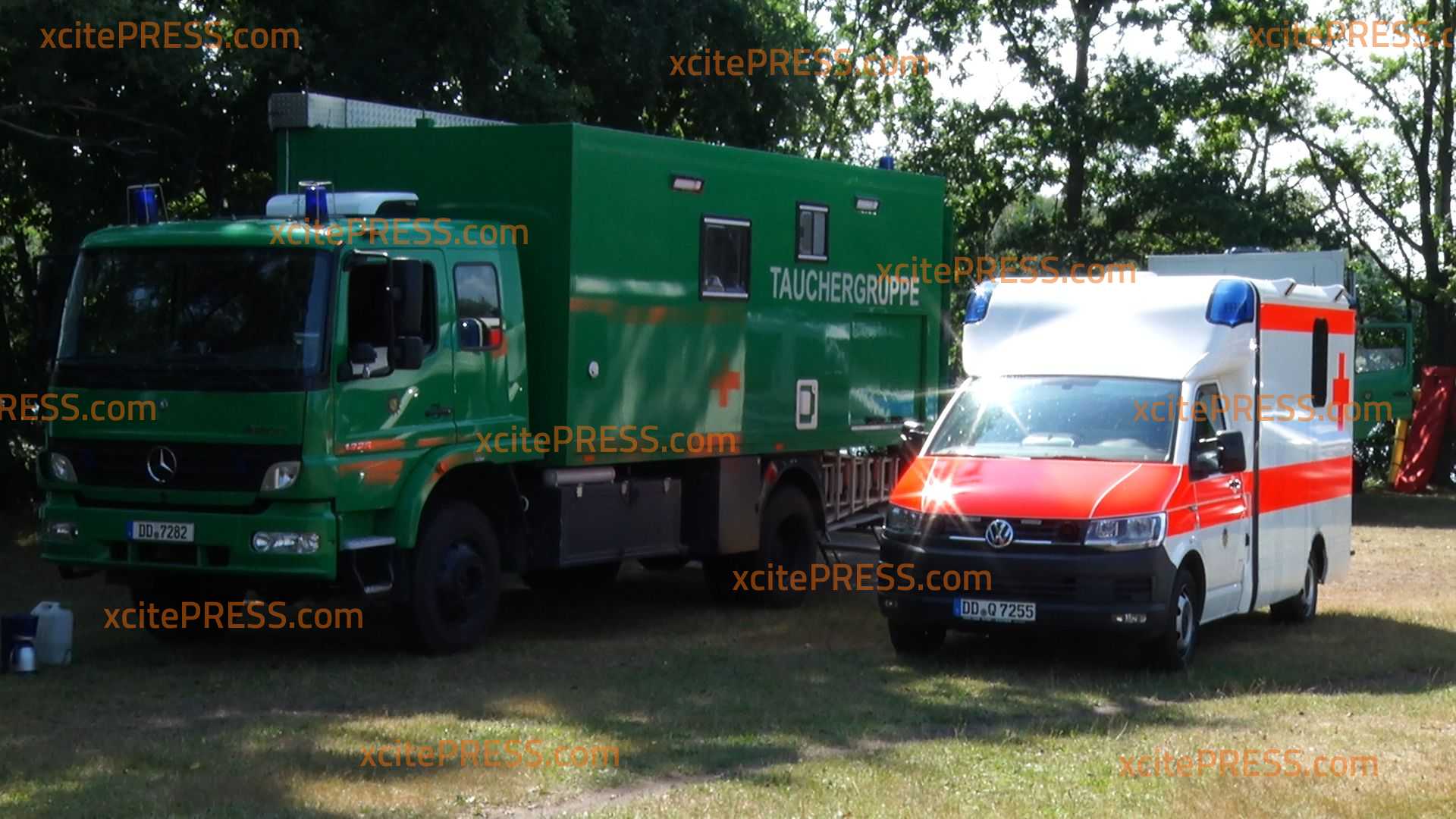 Auch drei Tage nach dem Verschwinden eines 44-Jährigen beim Schwimmen am Olbasee in Malschwitz suchen Rettungskräfte vergeblich. Mittlerweile sind neben zwei Booten der Feuerwehr mit Sonargeräten auch Taucher der Polizeigruppe aus Leipzig vor Ort. Vor allem die Hitze macht den Einsatzkräften zu Schaffen - neben ausreichend Getränken und Essen sichert der Rettungsdienst die medizinische Versorgung der Einsatzkräfte. Heute wird die Suche fortgesetzt...