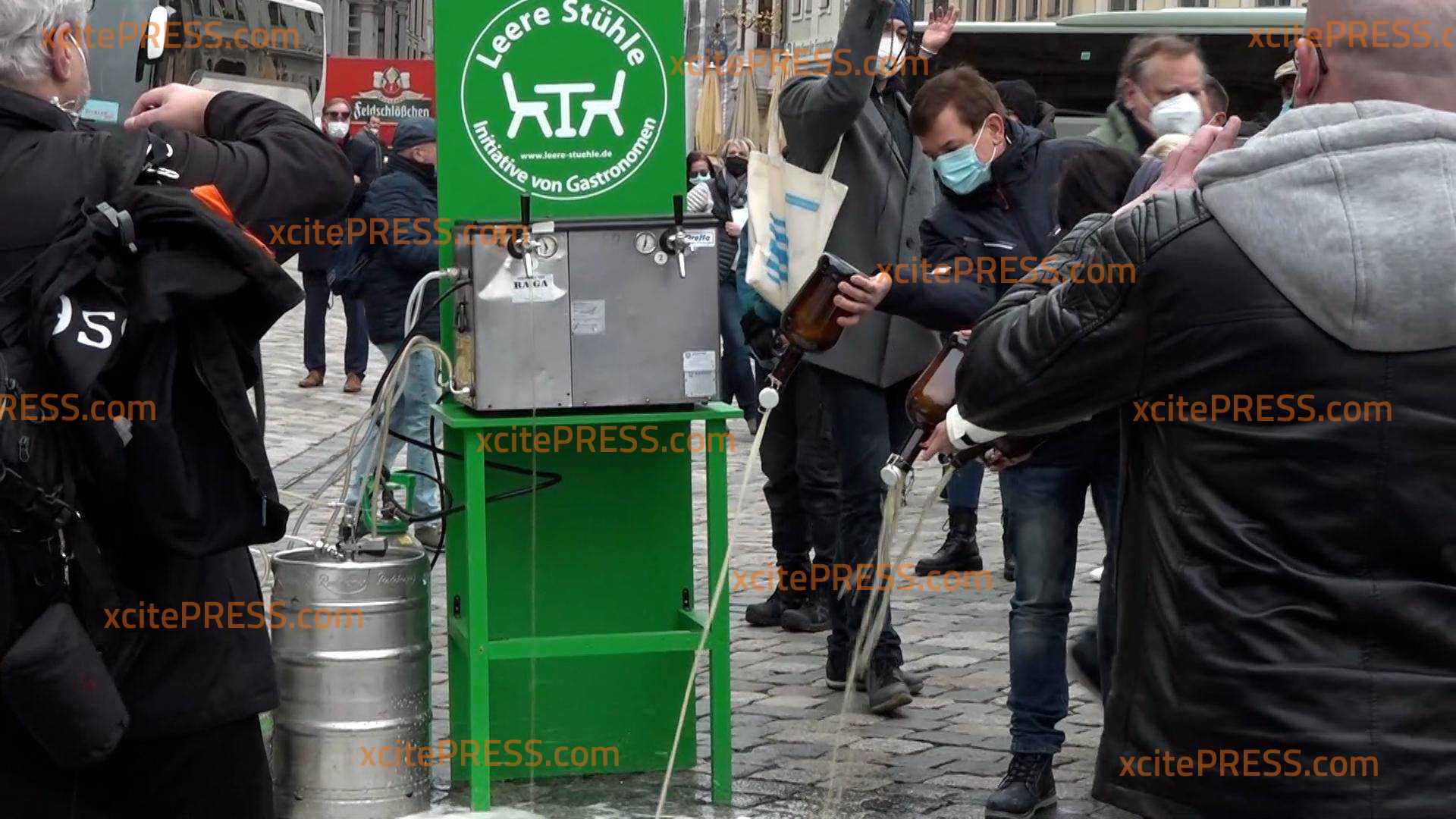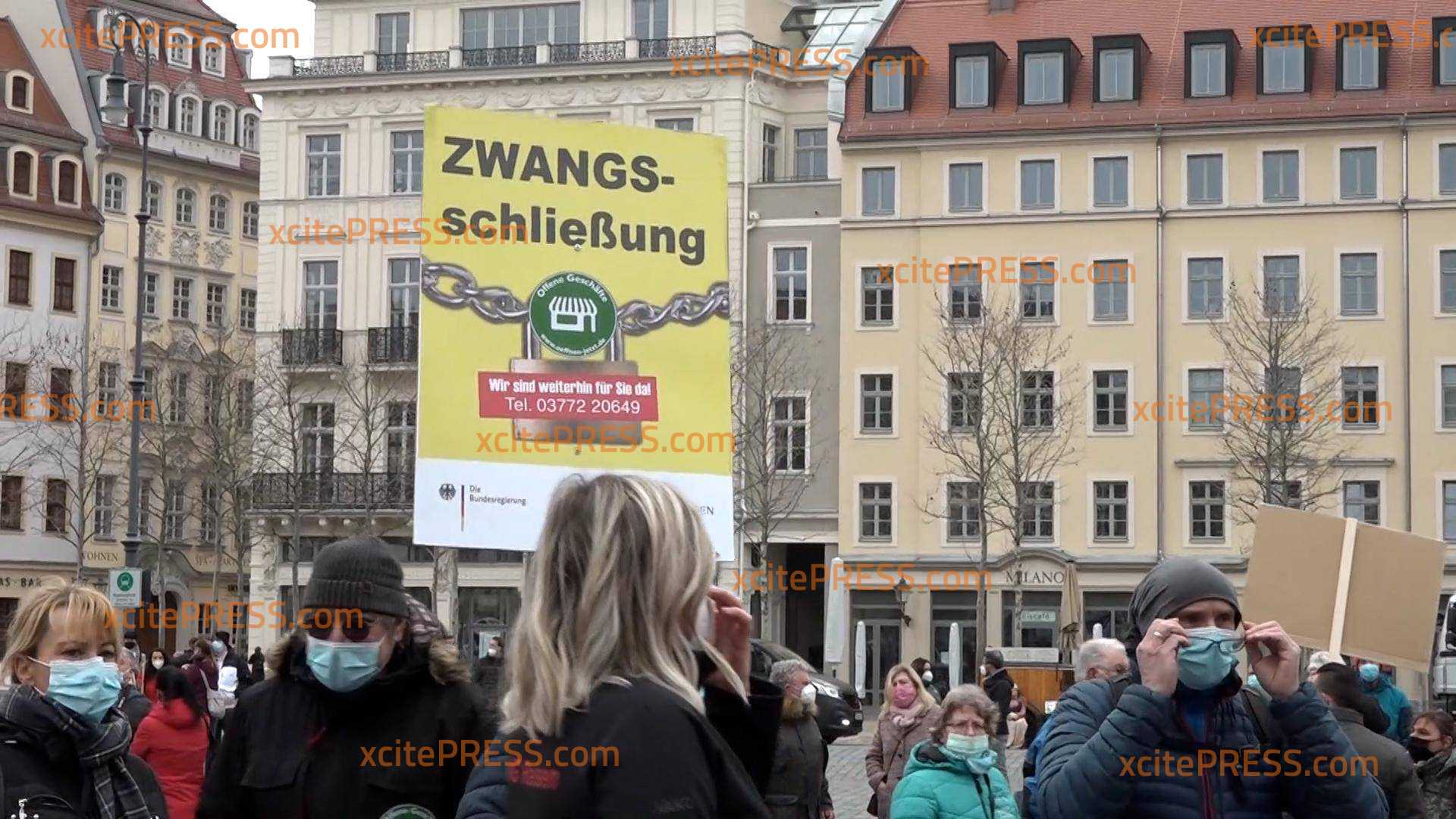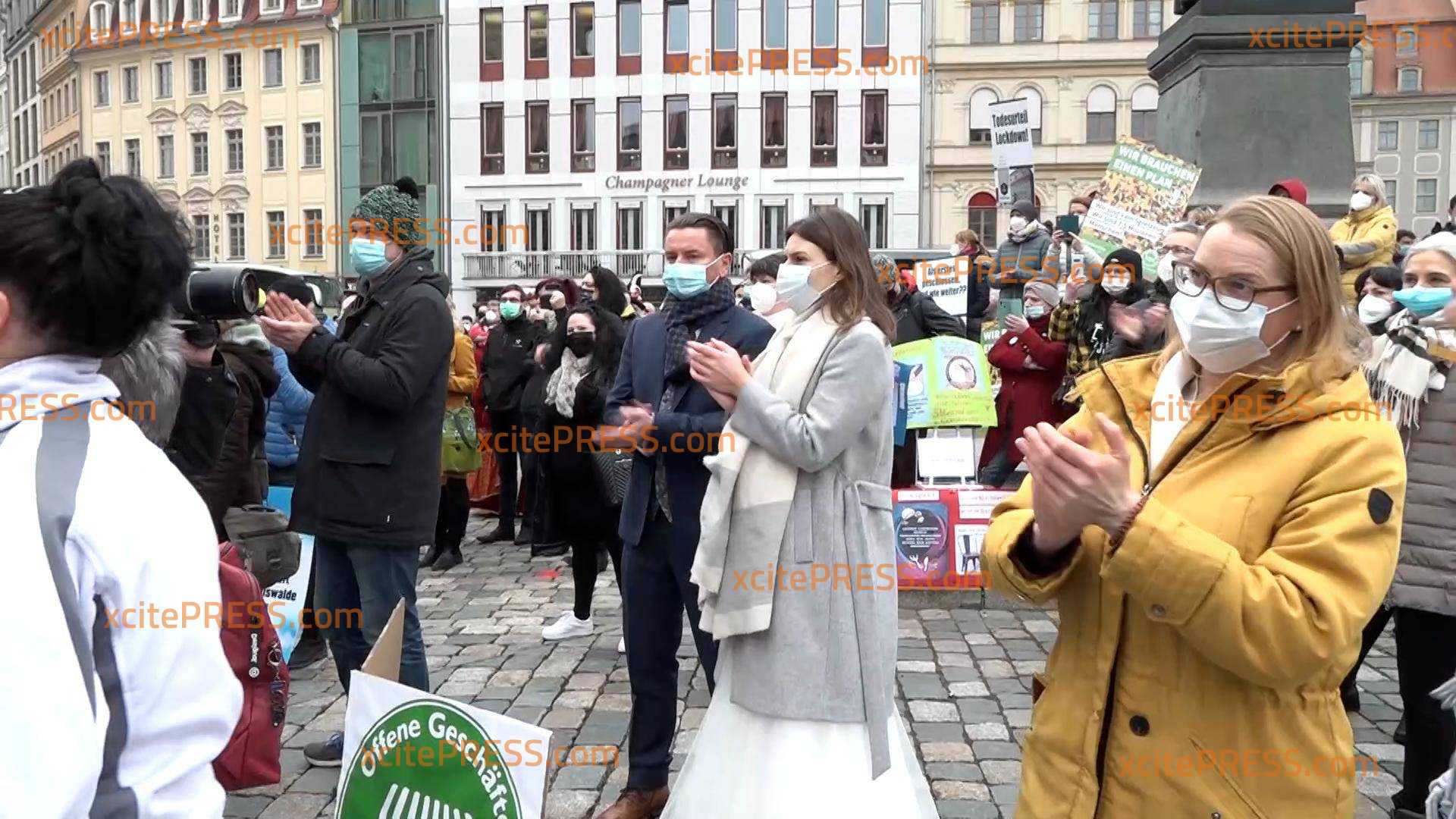 Nachdem am 1. März Frisöre, Fahrschulen und Musikschulen ihre Türen wieder öffnen dürfen, blickt die Mehrzahl an Unternehmen noch immer perspektivlos in die Zukunft, denn weiterhin bleiben unter anderem Fitnessstudios, Hotels, Restaurants, Bars, Einzelhandel, Kosmetikstudios geschlossen. Wann sich die Situation ändern wird ist unklar. Aus diesem Grund lud die Initiative Leere Stühle e.V Unternehmerinnen und Unternehmer branchenübergreifend am Montagvormittag auf den Dresdner Neumarkt zu einem 1000-Personen-Politiktalk ein. Neben dem Brautmodenausstatter Uwe Herrmann (bekannt aus der VOX-Sendung "Zwischen Tüll und Tränen") und dem Dresdner Sushikönig Wolle Förster war auch der sächsische Wirtschaftsminister Martin Dulig (SPD) vor Ort um sich die vielen offenen Fragen der Teilnehmer anzuhören. Um ihrem Ärger und finanziellen Verlust Nachdruck zu verleihen wurde ein symbolischer Scheiterhaufen errichtet, auf welchem die Geschäftsleute Waren abwerfen, welche sie auf Grund der zugesperrten Geschäfte nicht verkaufen konnten.