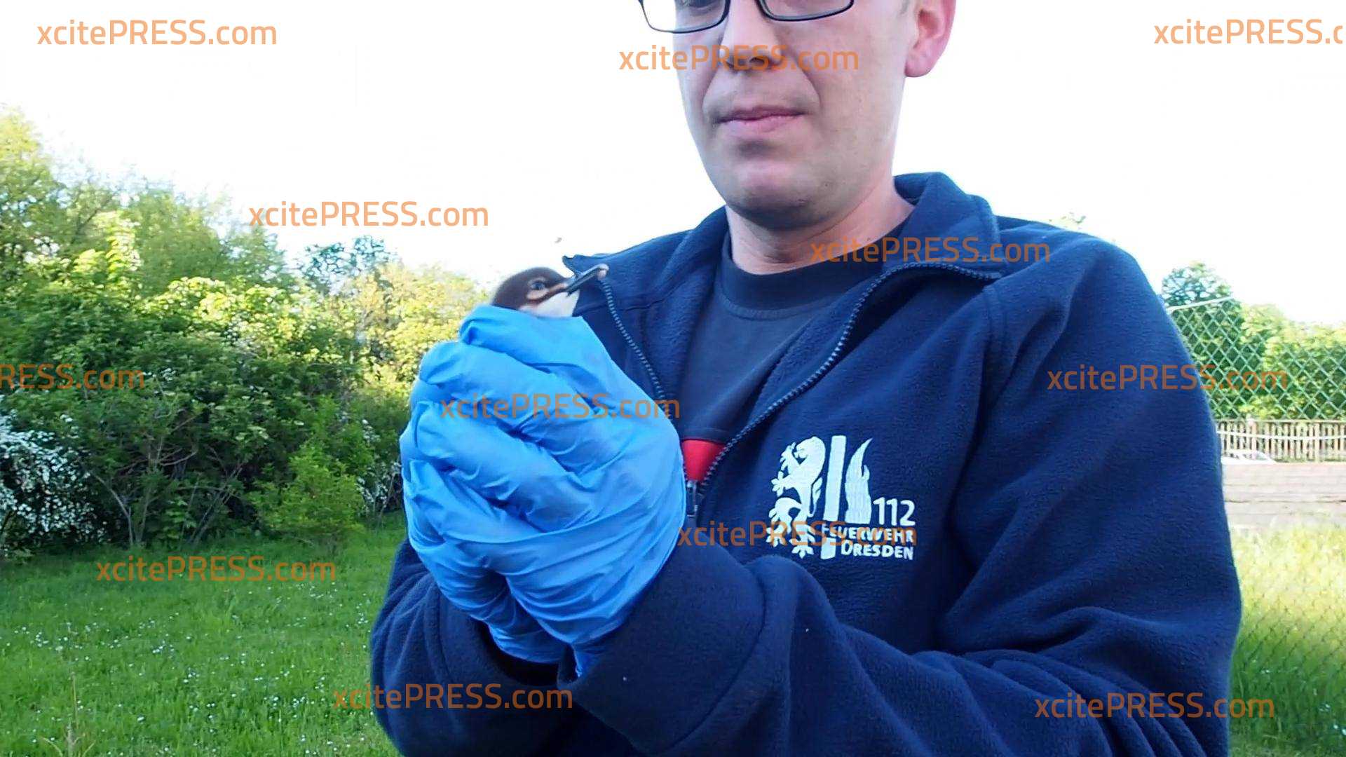 Tierischer Einsatz für die Feuerwehr Dresden: Am Montagabend rückten die Kameraden der Feuerwache 2 zu einem besonderen Einsatz an die Steinstraße aus. Gemeldet wurde eine Entenfamlie (offenbar) auf Irrwegen. Für die Jungs (Hauptbrandmeister Ronny Stanek und Brandmeister Florian Schmidt [mit Brille]) der Feuerwehr stellte sich der Einsatz als knifflig dar - denn die 10 Entenbabys samt Entenmama wollten sich nicht so einfach fangen lassen. Doch die Gefahr, dass die Enten auf die Straße laufen oder hungrigen Raben als Fraß dienen könnten war den Feuerwehrleuten zu groß. Sie stellten sich der komplizierten Aufgabe und konnten die Kleinen und ihre Mutter unversehrt aufsammeln.