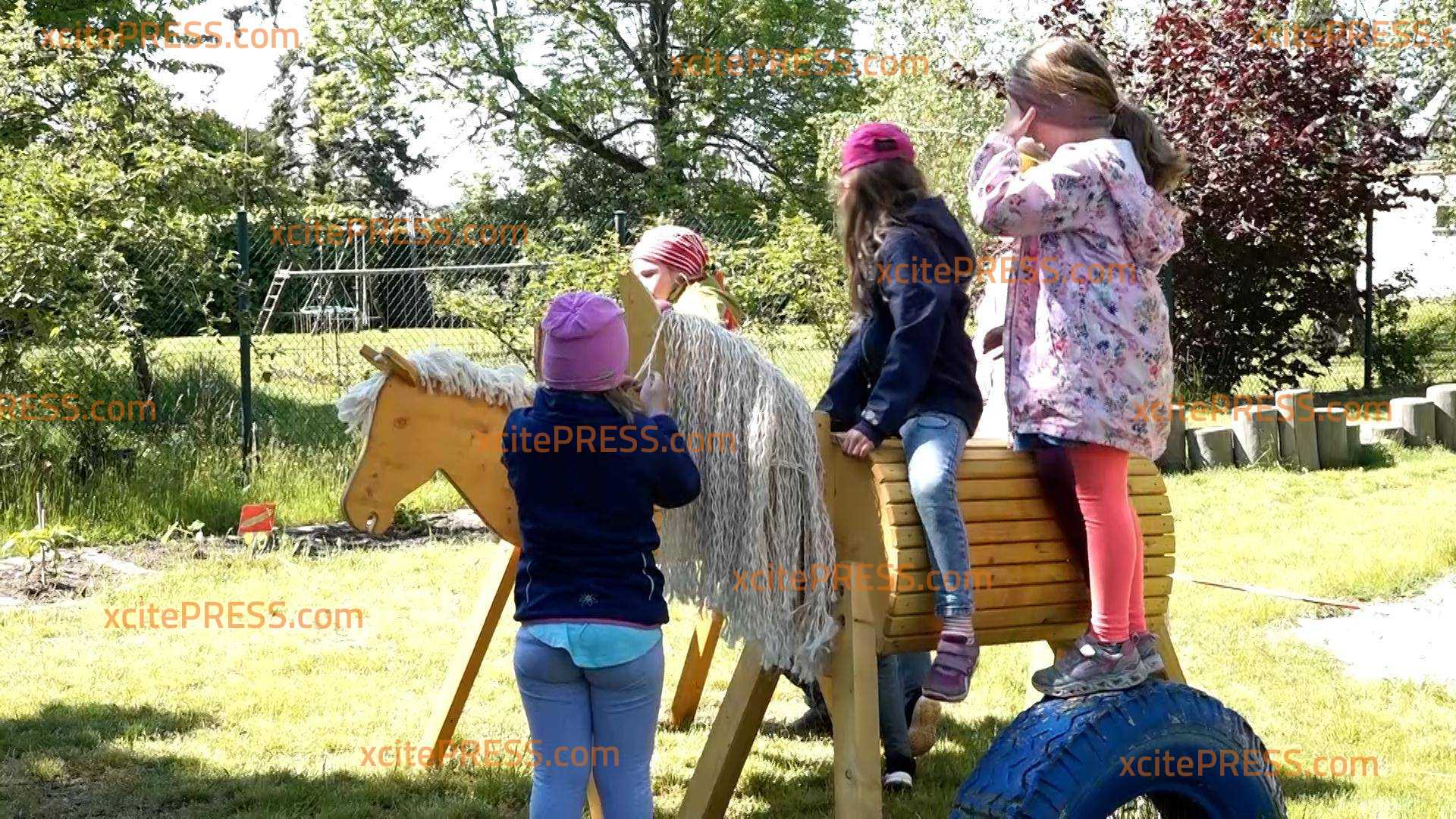 - Kinder stürmen auf die Holzpferde