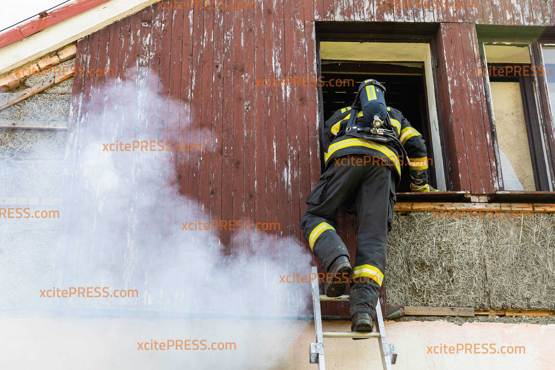- Leitern werden aufgebaut und Schläuche ausgerollt