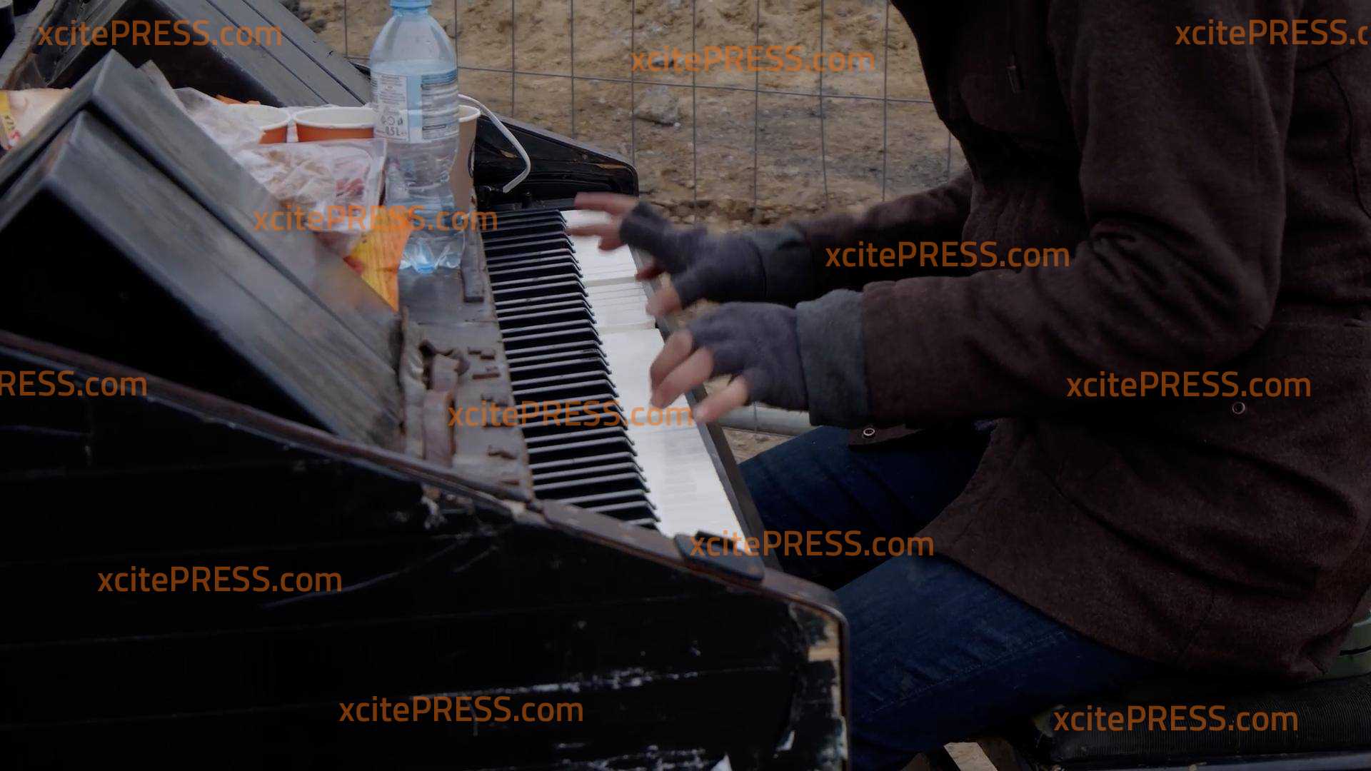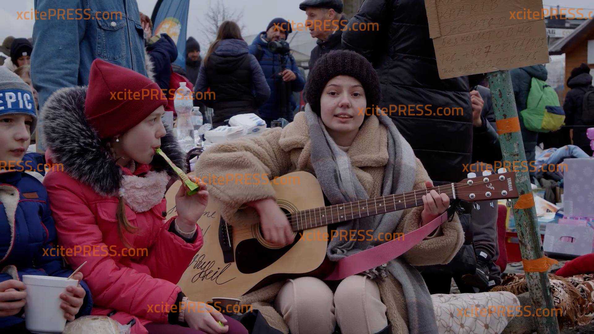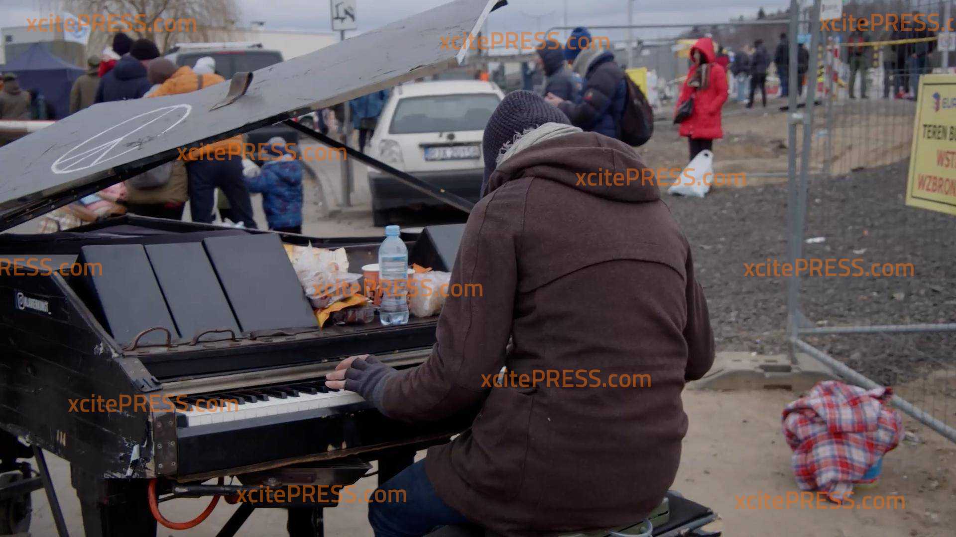 Mann spielt Klavier direkt am Grenzübergang, Flüchtlingsmädchen spielt Gitarre