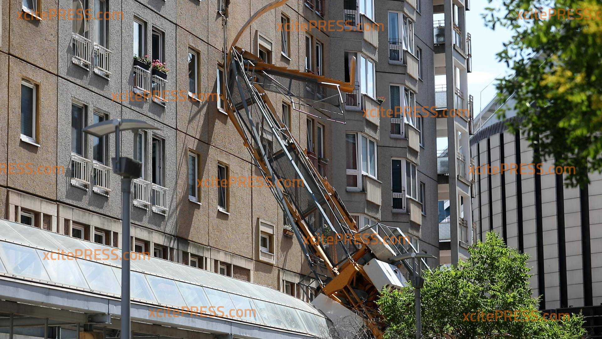 Baukran kracht an Wohngebäude! Schwerer Unfall im Dresdner Stadtzentrum, sehr hoher Schaden - wie durch ein Wunder keine Verletzten