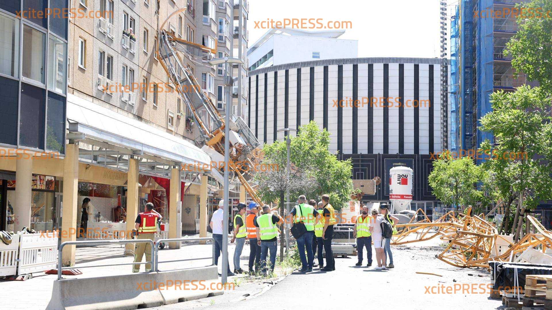 - Trümmerteile vom Kran liegen verteilt auf der Baustelle Close
