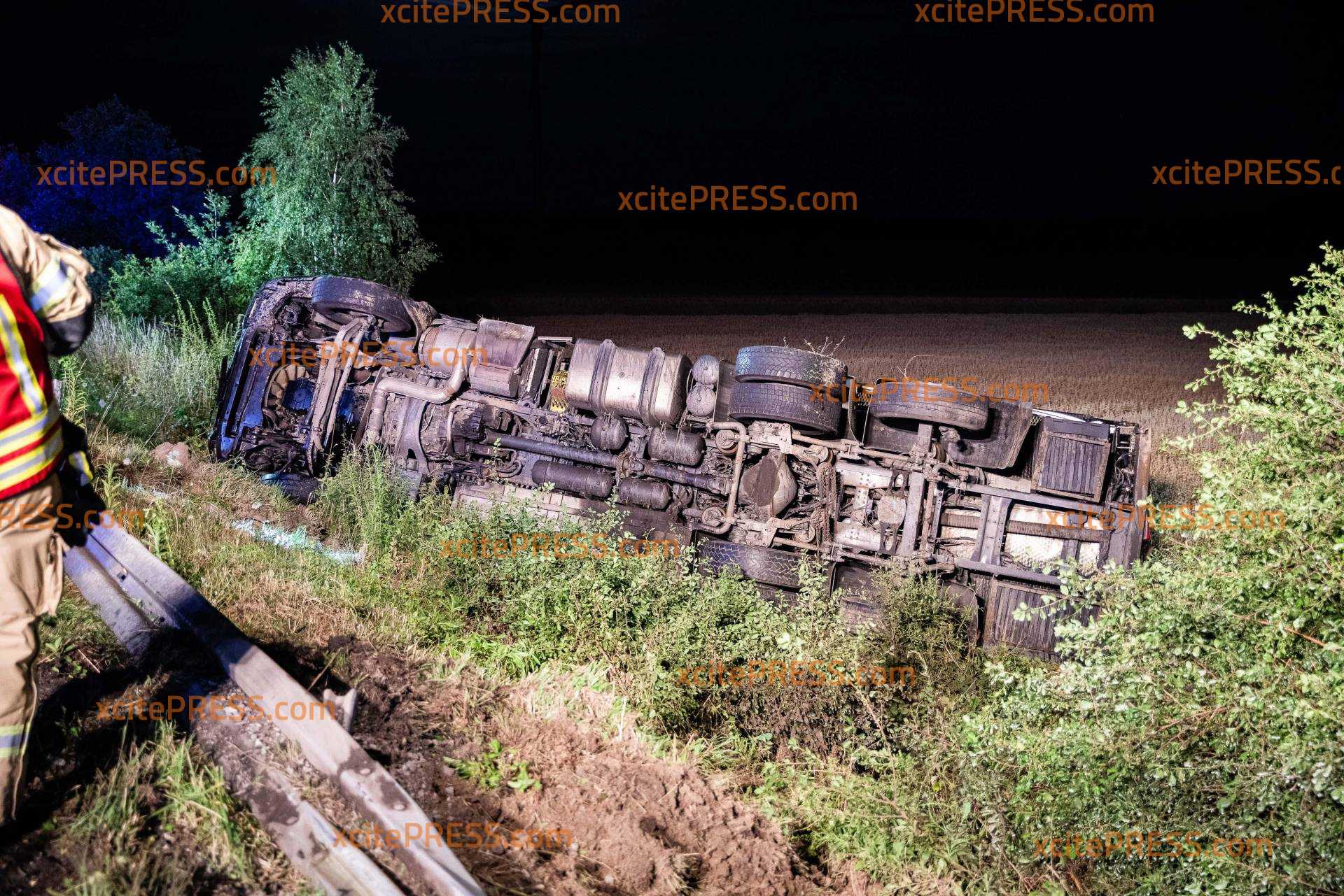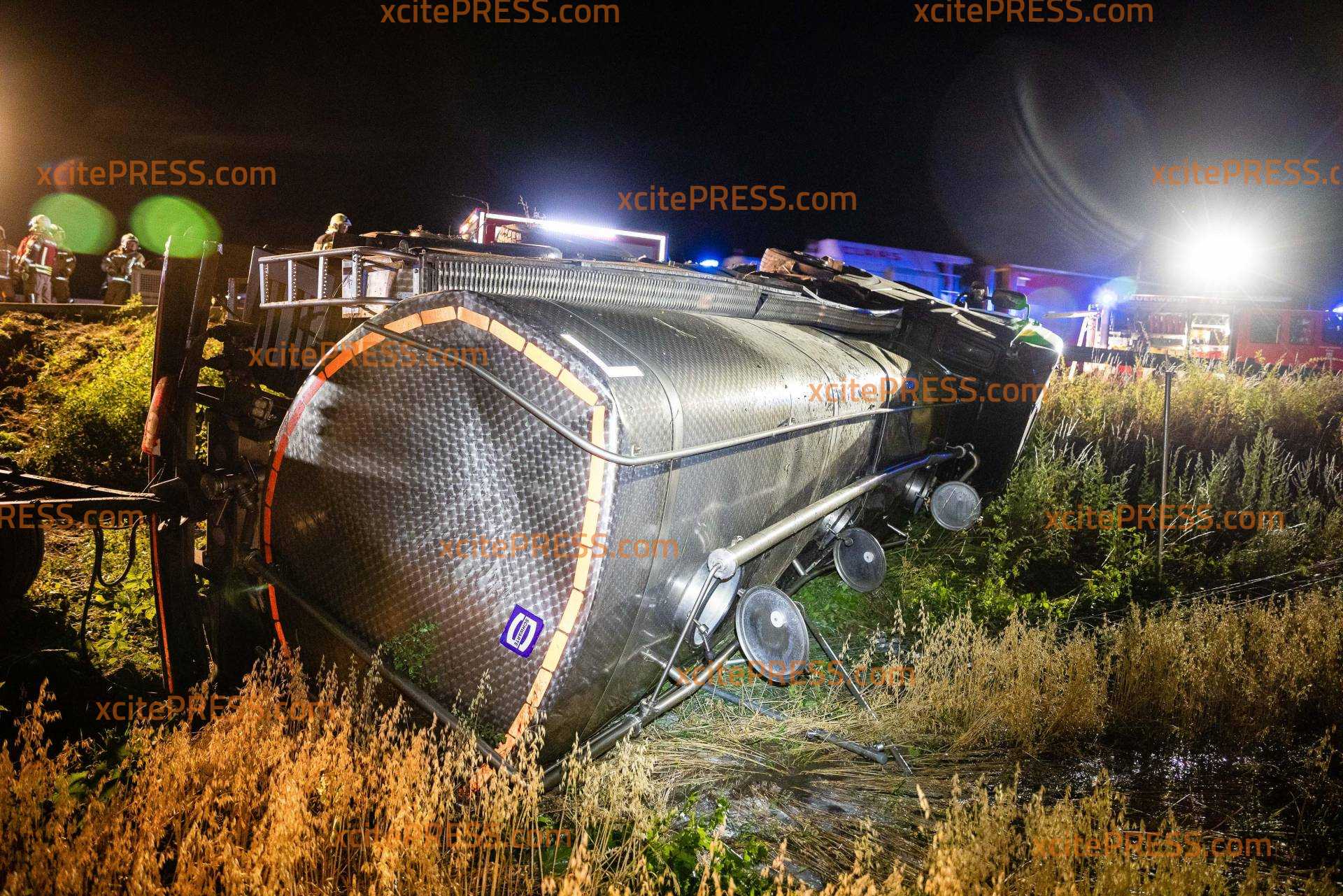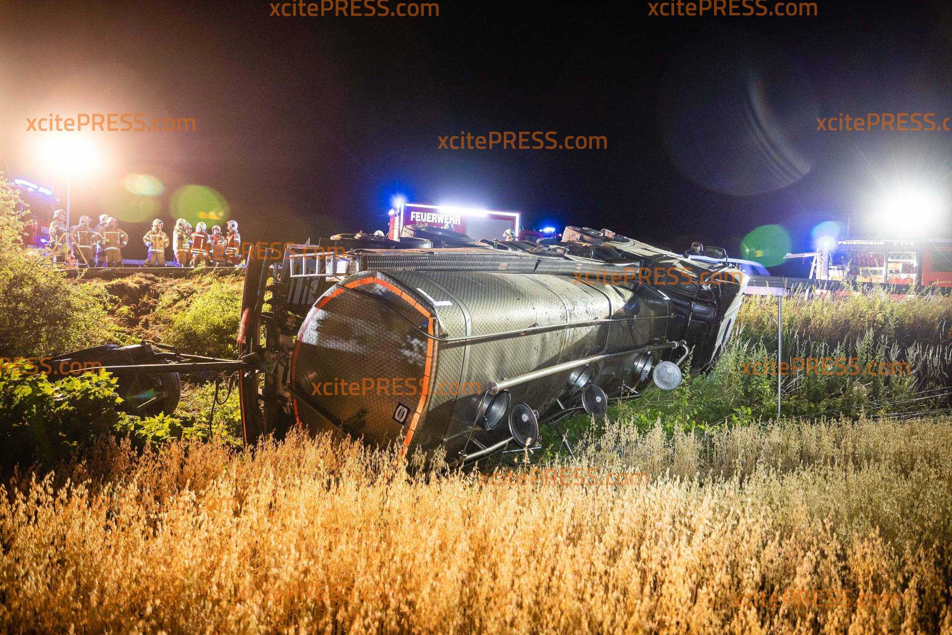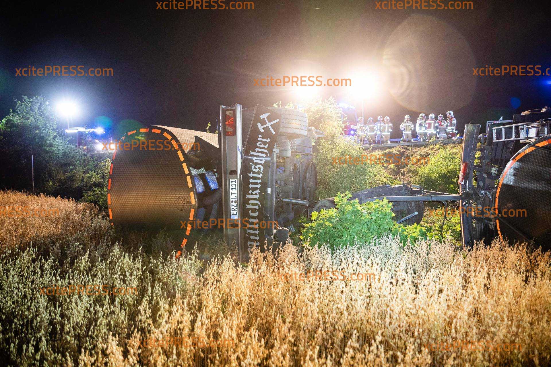 Milchlaster kommt von Autobahn ab und kippt um