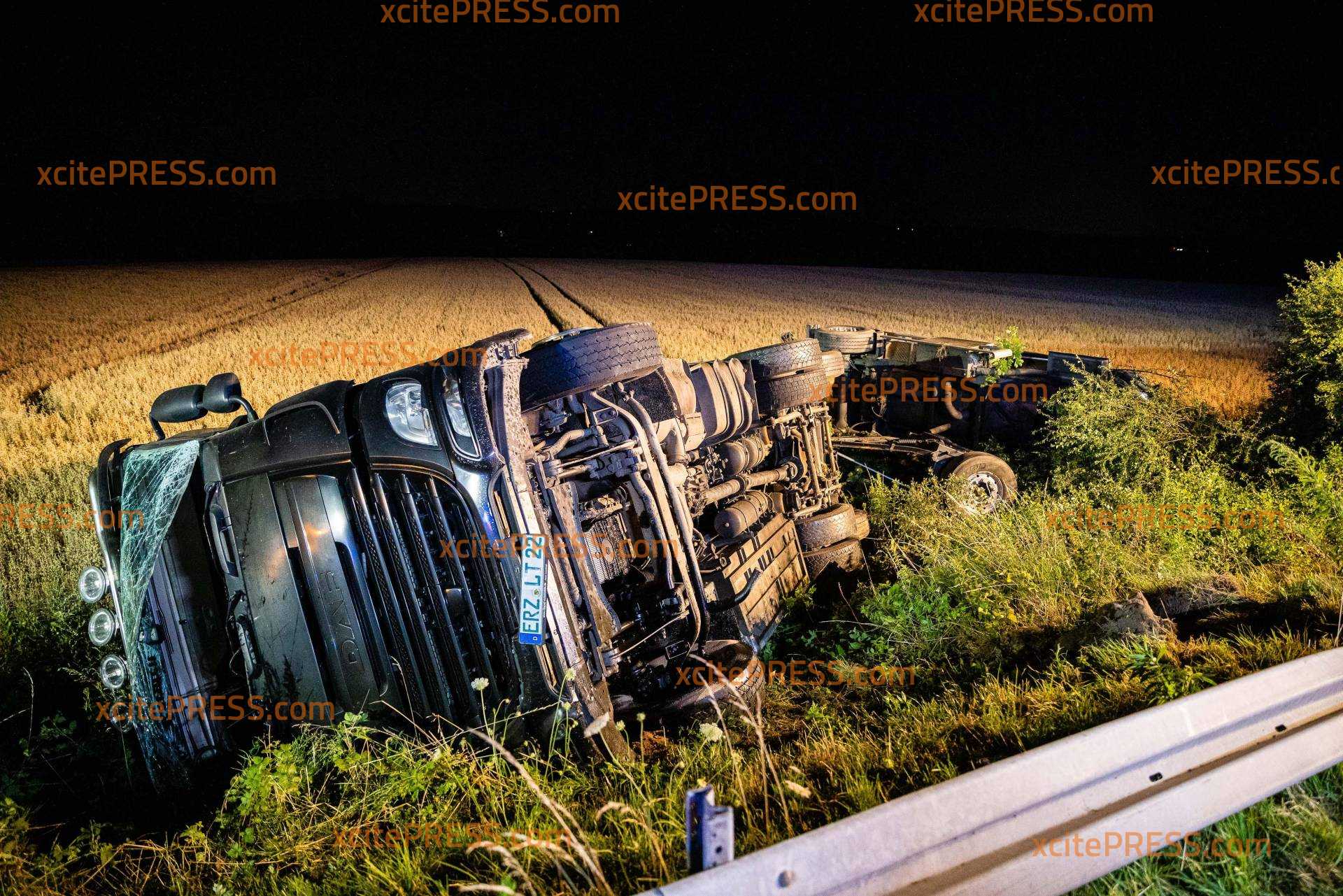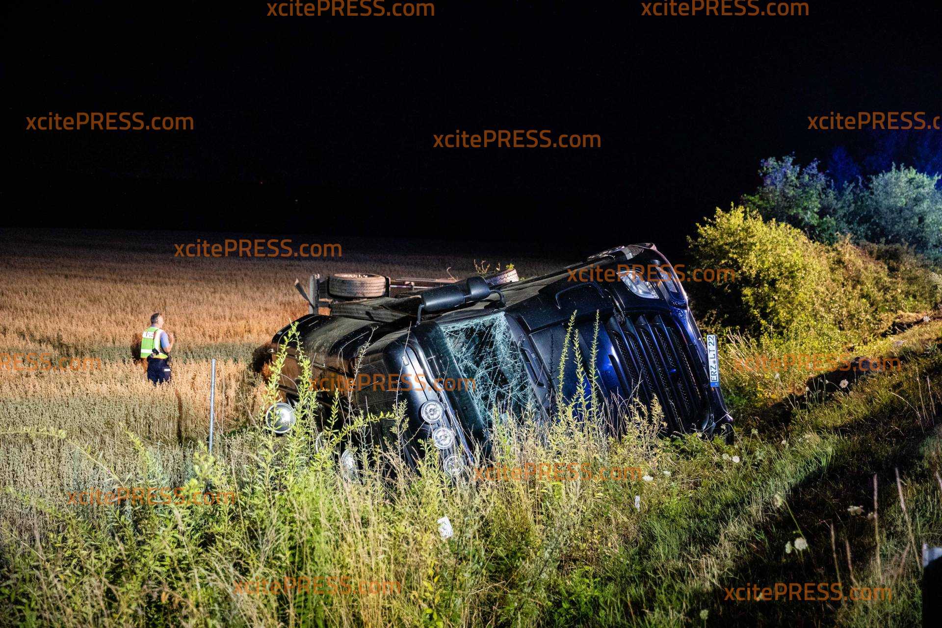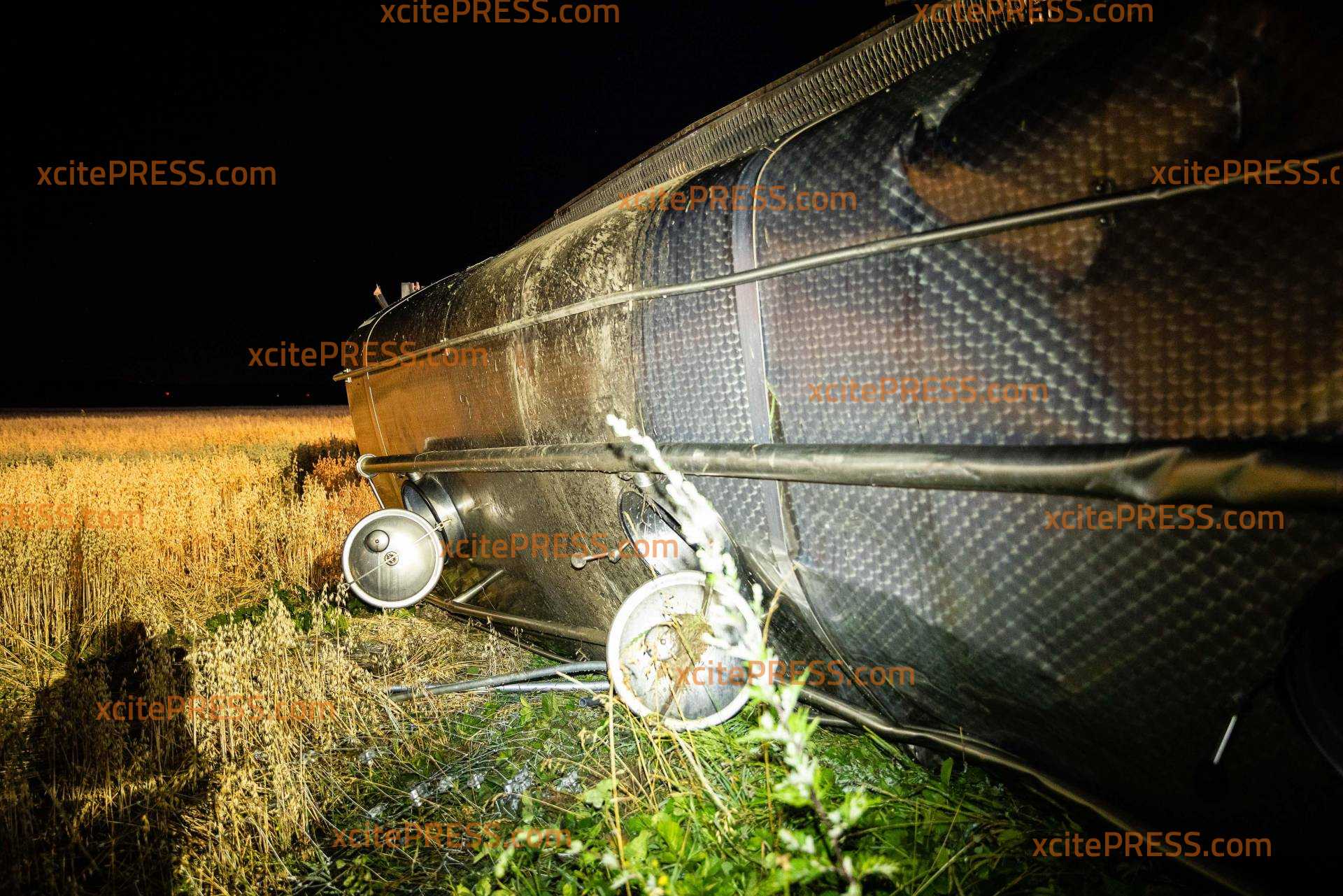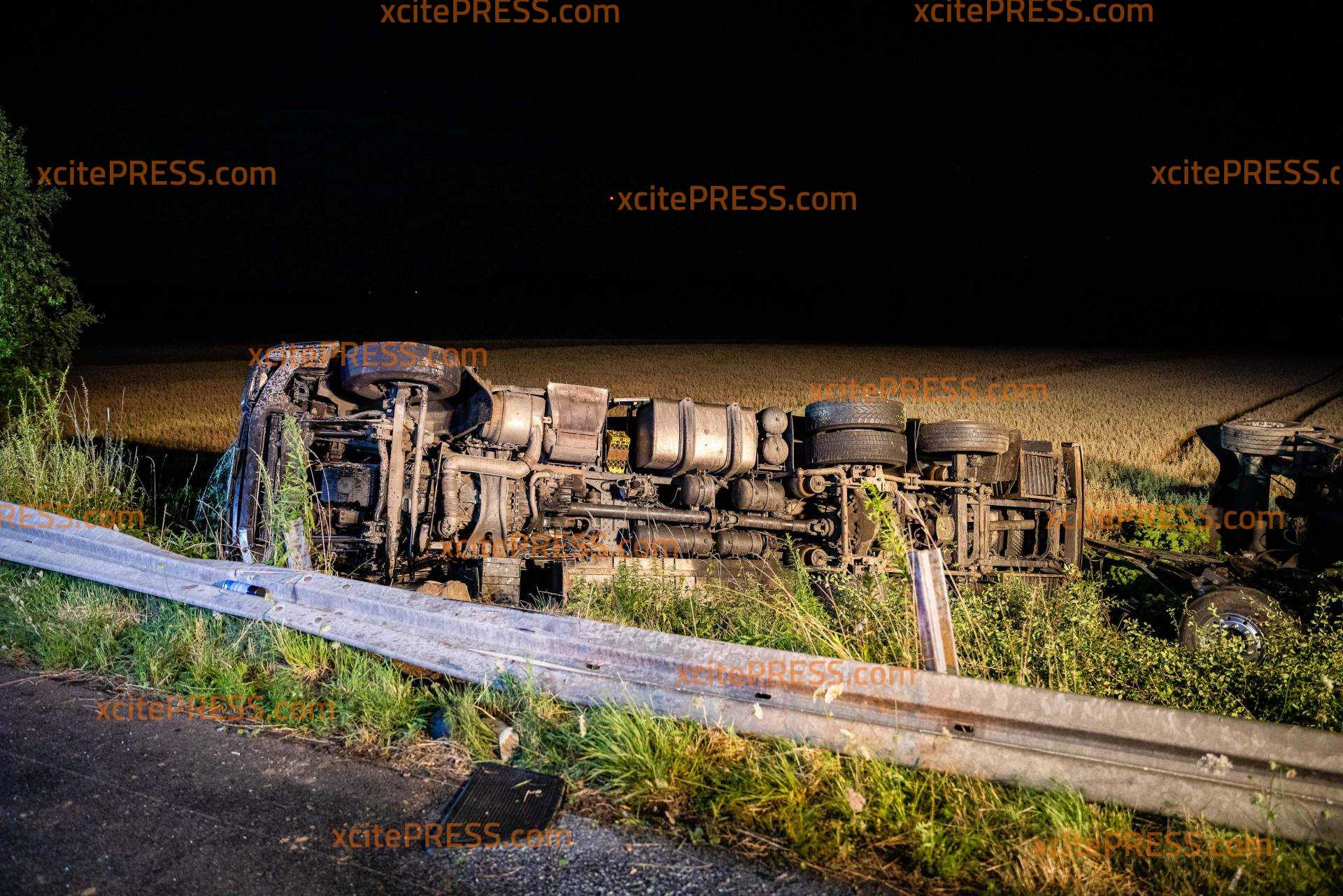Auf der A4 bei Pulsnitz hat es in der Nacht zu Freitag einen schweren LKW-Unfall gegeben. Ein Milchlaster war auf der Fahrbahn von Dresden in Richtung Görlitz unterwegs, als er zwischen den Anschlussstellen Ottendorf-Okrilla und Pulsnitz nach rechts von der Fahrbahn abkam, die Schutzplanke überfuhr und anschließend eine Böschung hinabrutschte. Der LKW kippte samt Anhänger um und blieb auf der Seite liegen. Zugmaschine und Anhänger wurden dabei so beschädigt, dass tausende Liter der geladenen Milch ausliefen und sich im angrenzenden Getreidefeld verteilten. Der LKW-Fahrer wurde vom Rettungsdienst versorgt und in eine Klinik gebracht. Die örtlichen Feuerwehren sicherten die Unfallstelle ab und nahmen auslaufende Betriebsstoffe auf. Die Polizei sperrte die rechte Fahrbahn, der Verkehr wurde an der Unfallstelle vorbeigeleitet. Zur Stunde ist noch unklar, wie es vor Ort weitergeht. Die Autobahnmeisterei wurde verständigt, ebenso ein Bergungsunternehmen. Beide wollten sich den Unfallort noch in der Nacht anschauen und entscheiden, wie die Bergung am Morgen von statten gehen soll.