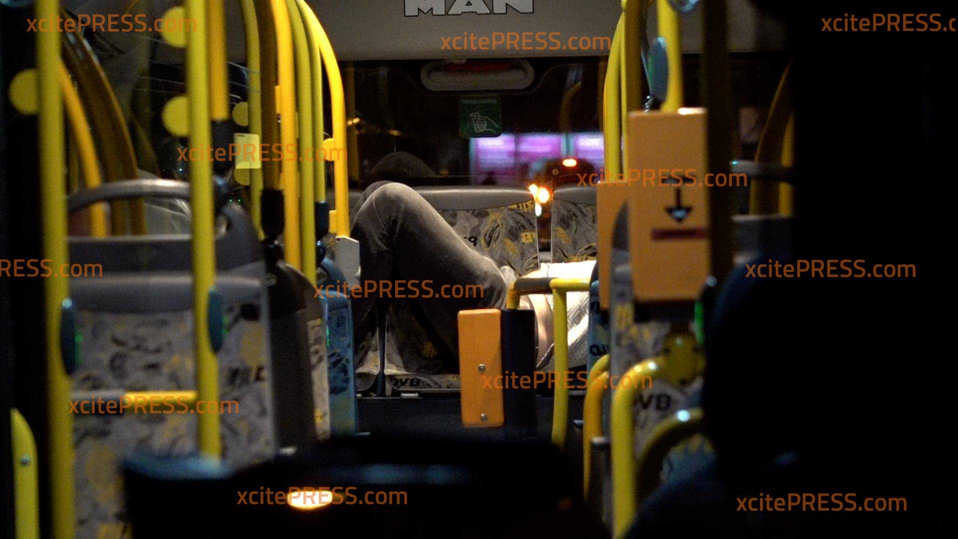 Menschen, die auf der Straße wohnen, durften unter keinen Umständen zu ihrer Wohnung. Sie kamen unter anderem in einem Linienbus der Dresdner Verkehrsbetriebe unter (im Bild: Mann liegt im Bus, versch. Ansichten).