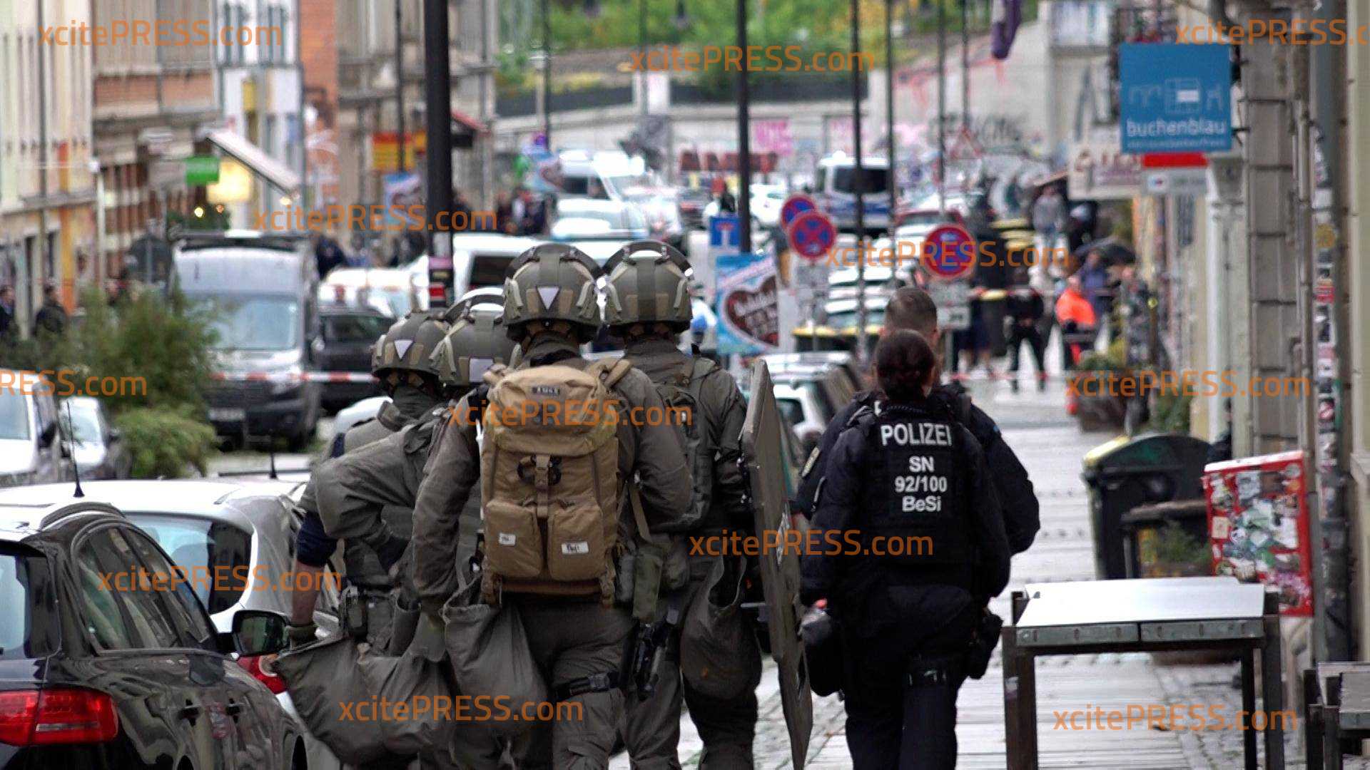 Großer Polizei-Einsatz in der Dresdner Neustadt. Etliche schwer bewaffnete Polizisten waren insgesamt fast 8 Stunden auf der Rudolf-Leonhard-Straße im Einsatz, auch das SEK (Sondereinsatzkommando) der Polizei musste anrücken. Ein Mann hatte sich in seiner Altbauwohnung verschanzt, mit Waffen umhergefuchtelt. Immer wieder hielt er auch eine Langwaffe (ON TAPE) aus dem Fenster. Die Straße war für Stunden voll gesperrt, da von der Polizei auch für einer Gefahr für die Bevölkerung ausgegangen werden muss.