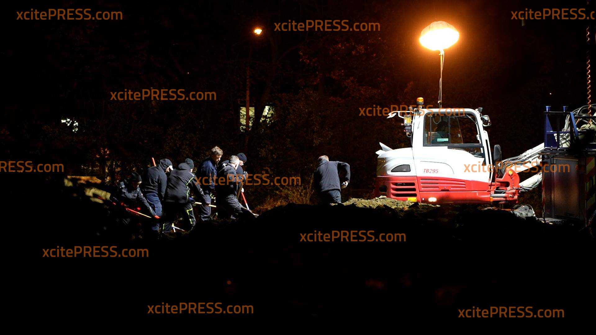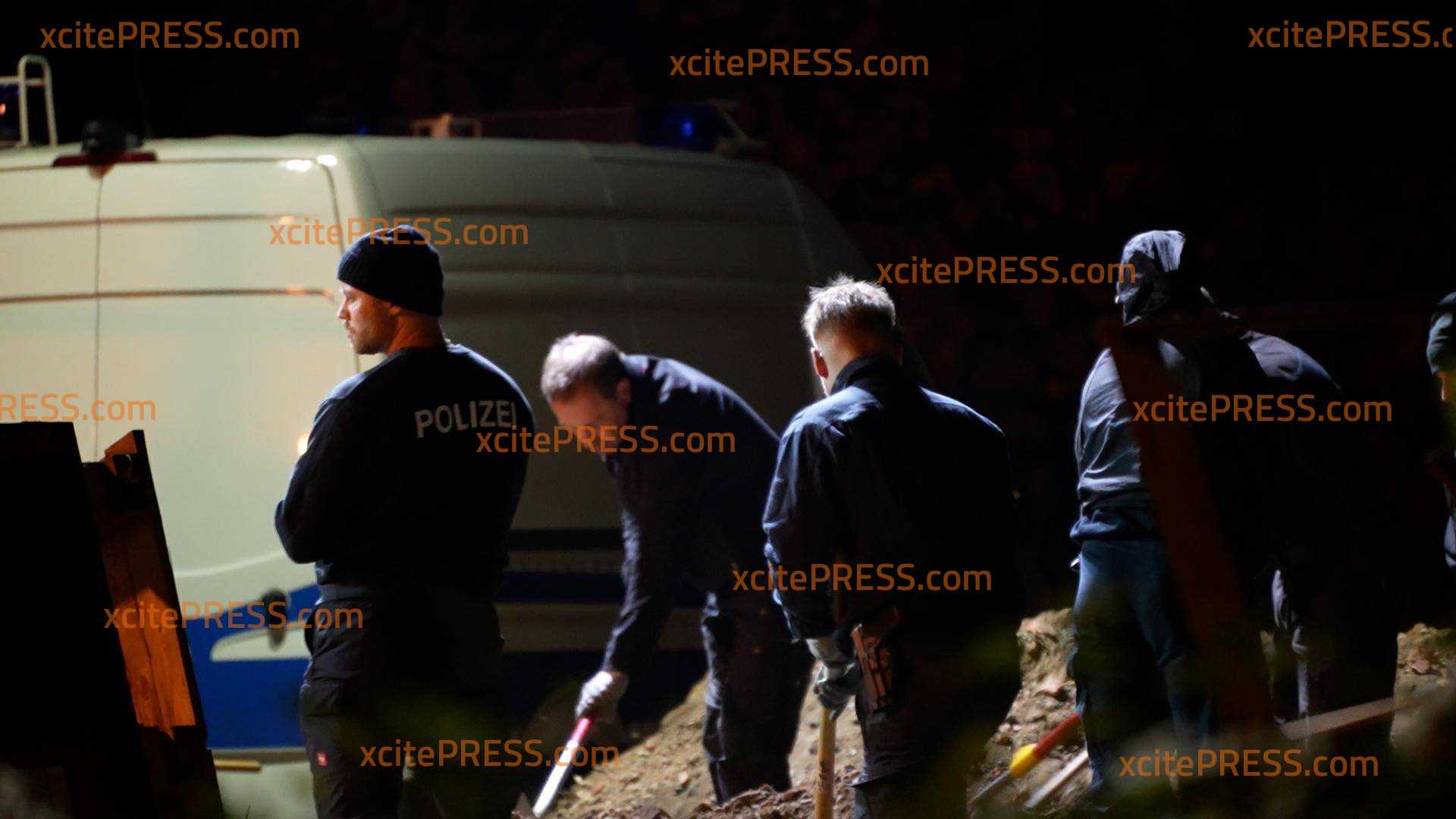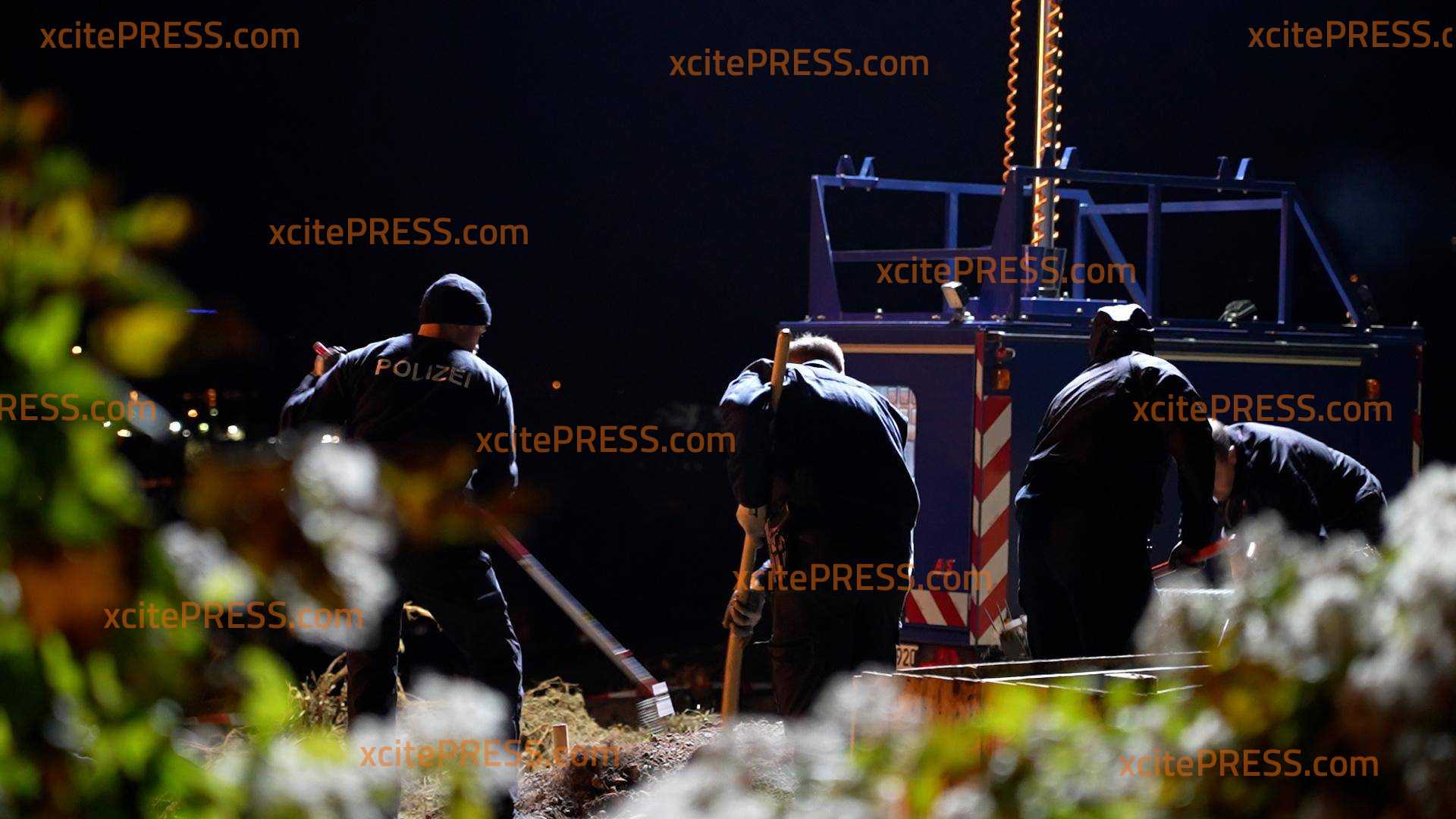 - Polizisten graben mit Schaufeln, offenbar suchen sie etwas