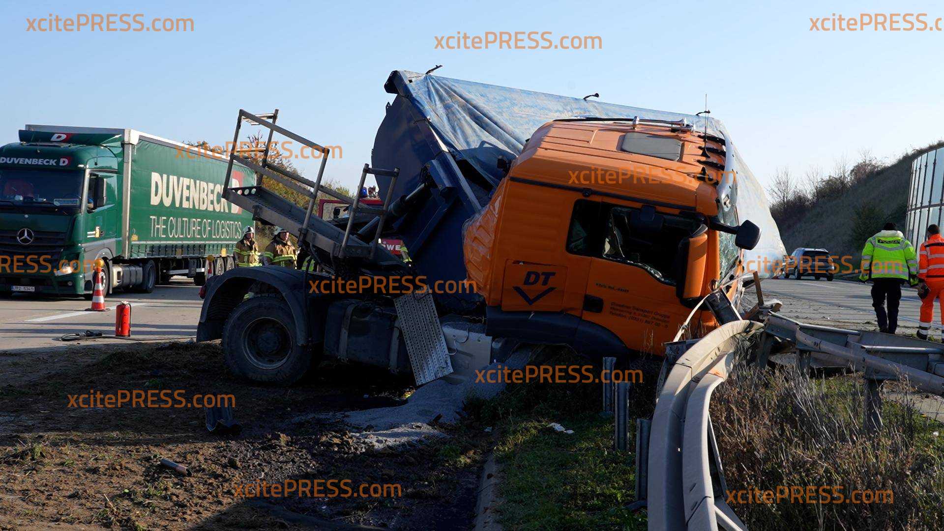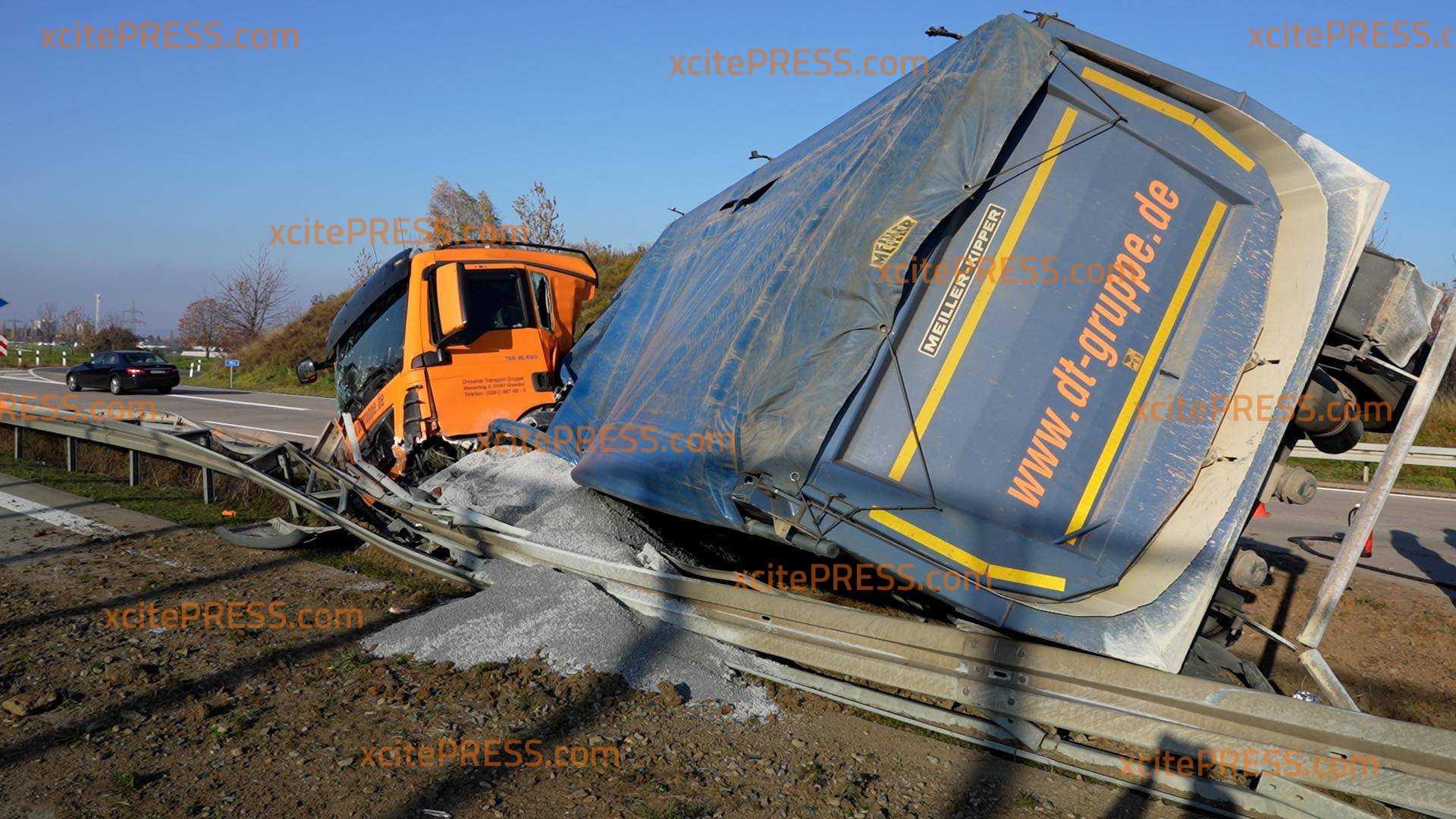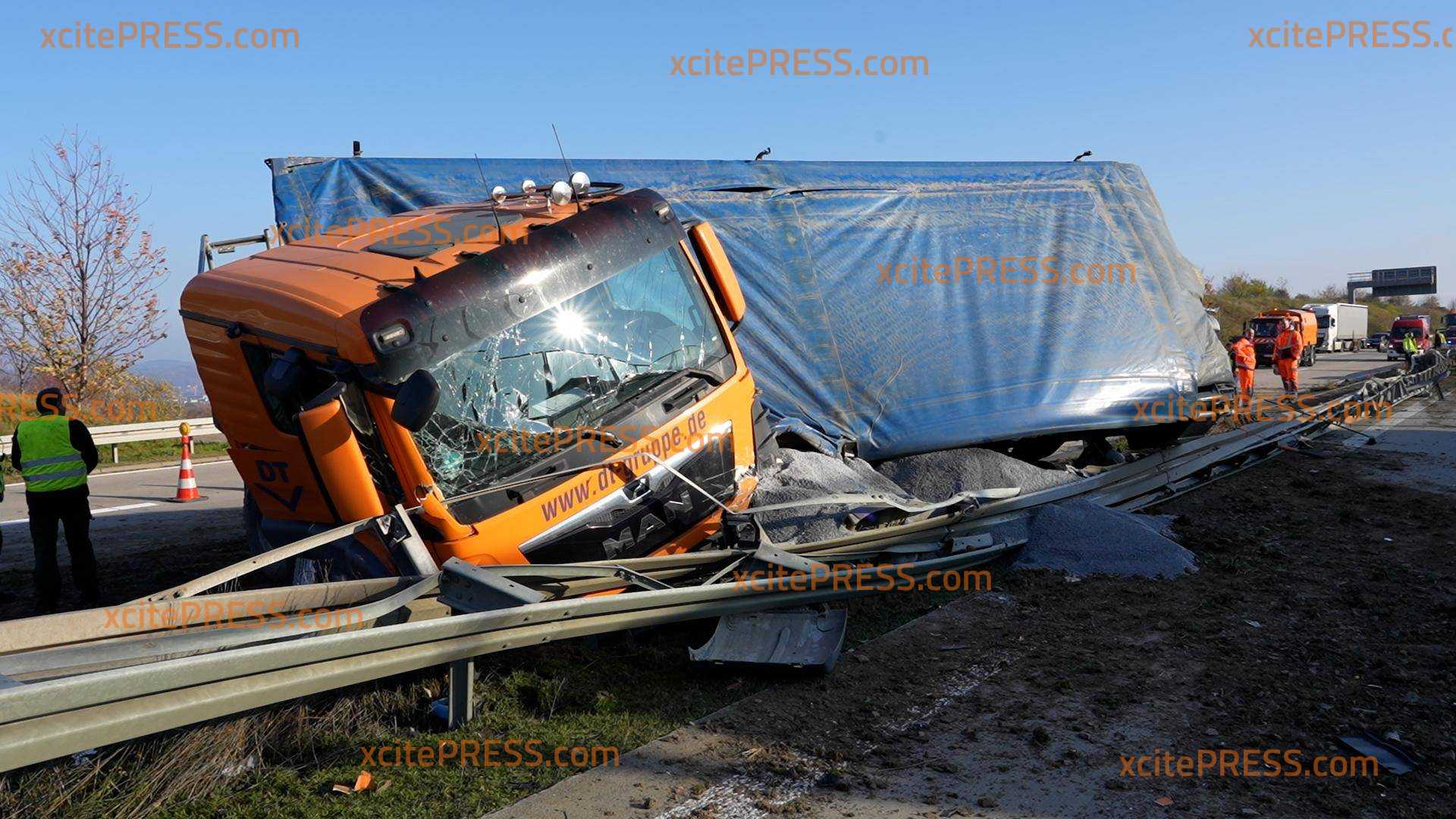 Gaffer-Alarm auf der A17 - Kieslaster kracht in Leitplanke: Fahrzeug völlig zerstört, wie durch ein Wunder kommt der Fahrer mit leichten Blessuren davon, Verkehr wird an der Unfallstelle vorbeigeleitet - Komplizierte Bergung dauert bis zum Montagabend