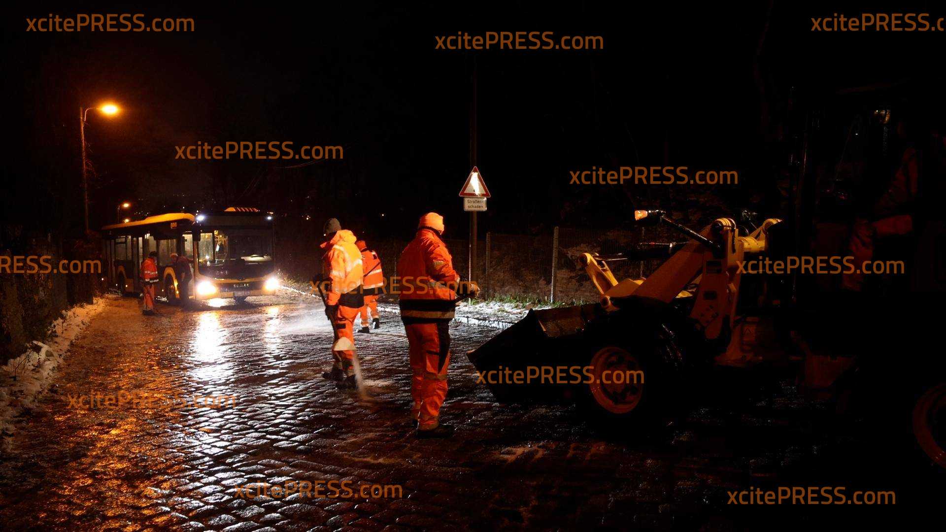 Linienbus bleibt auf spiegelglatter Straße „stecken" und kommt nicht weiter, Winterdienst hilft und streut Salz auf die Straße