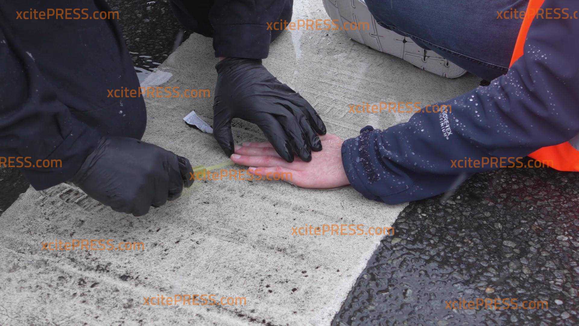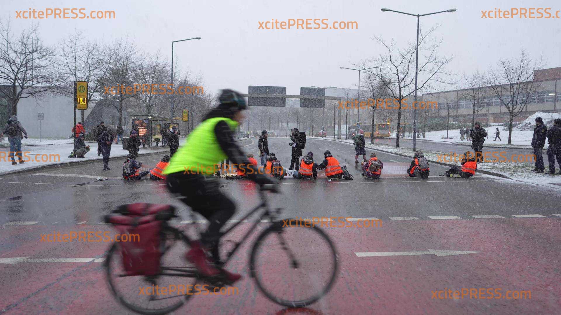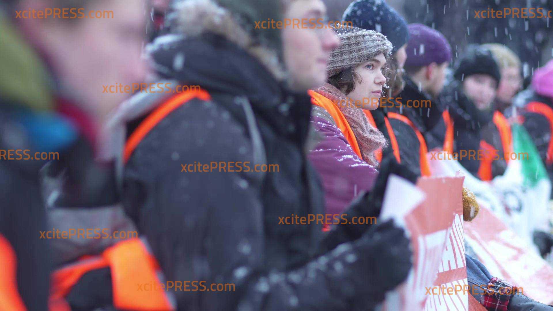Bei eisigen Temperaturen und Schnee kleben sich die Aktivisten mit Sekundenkleber auf die Straße