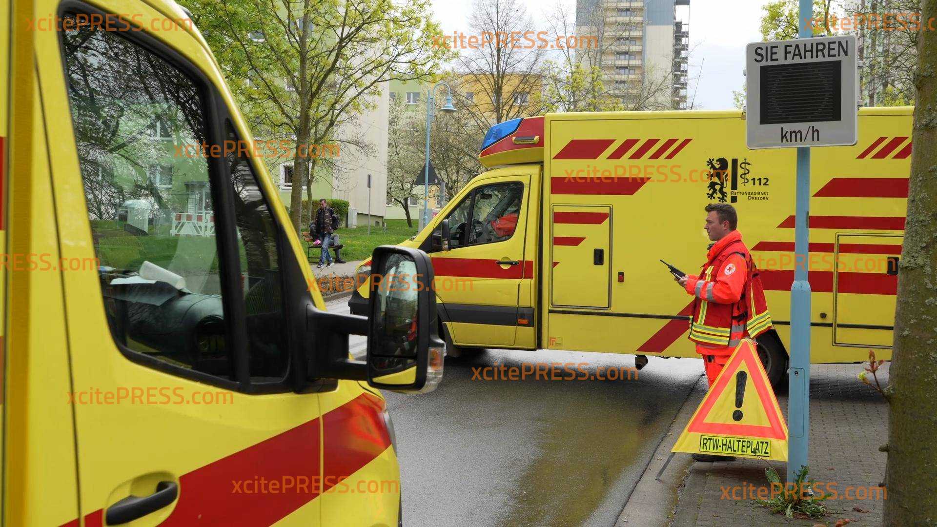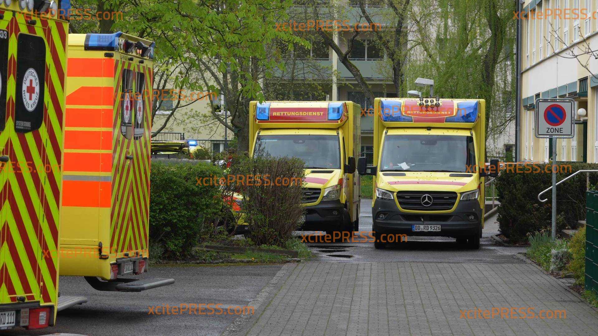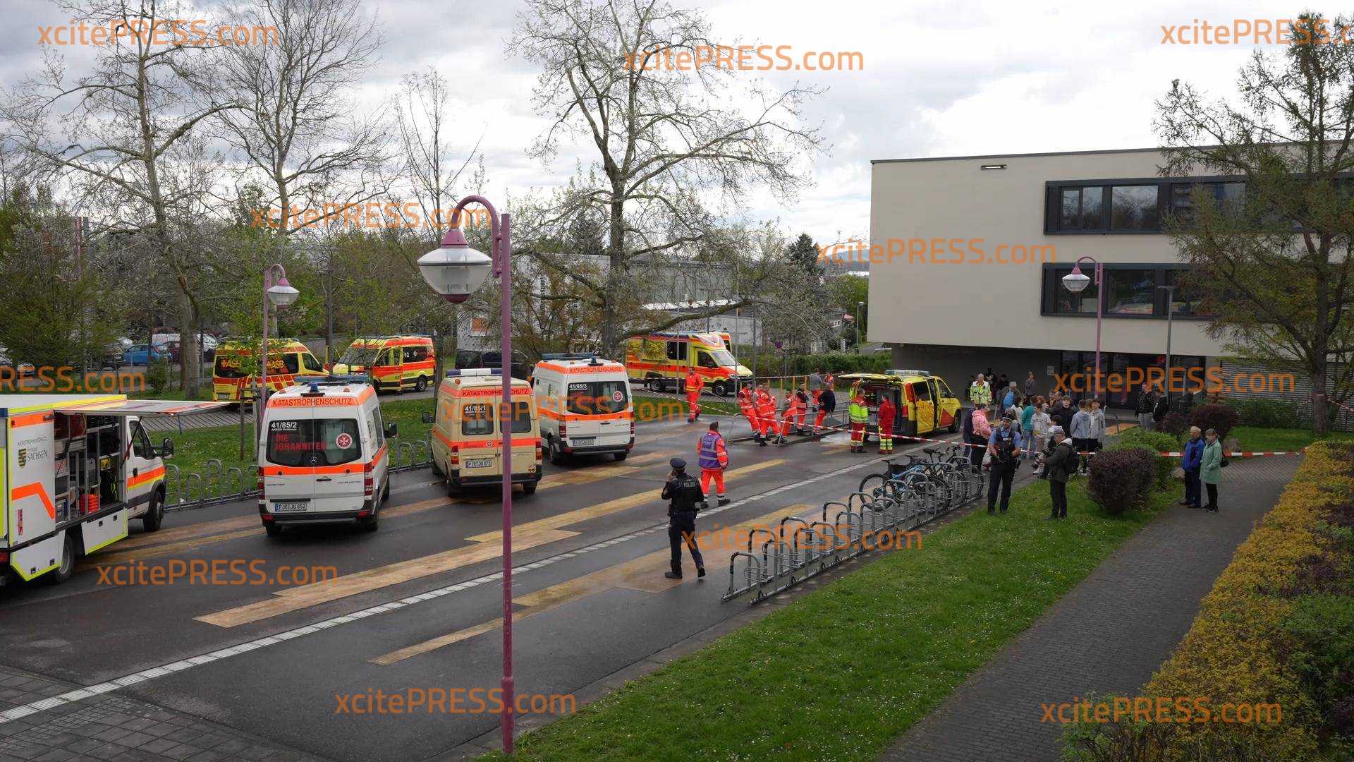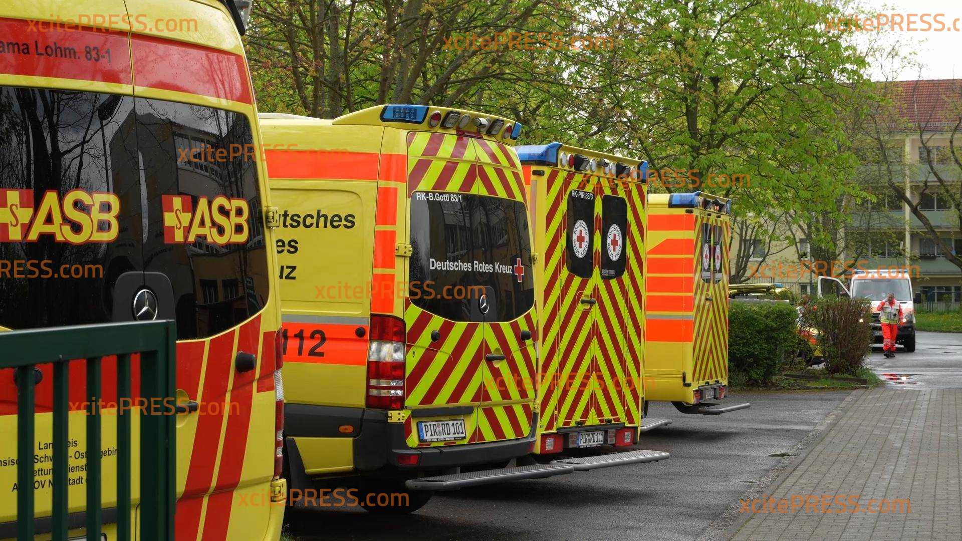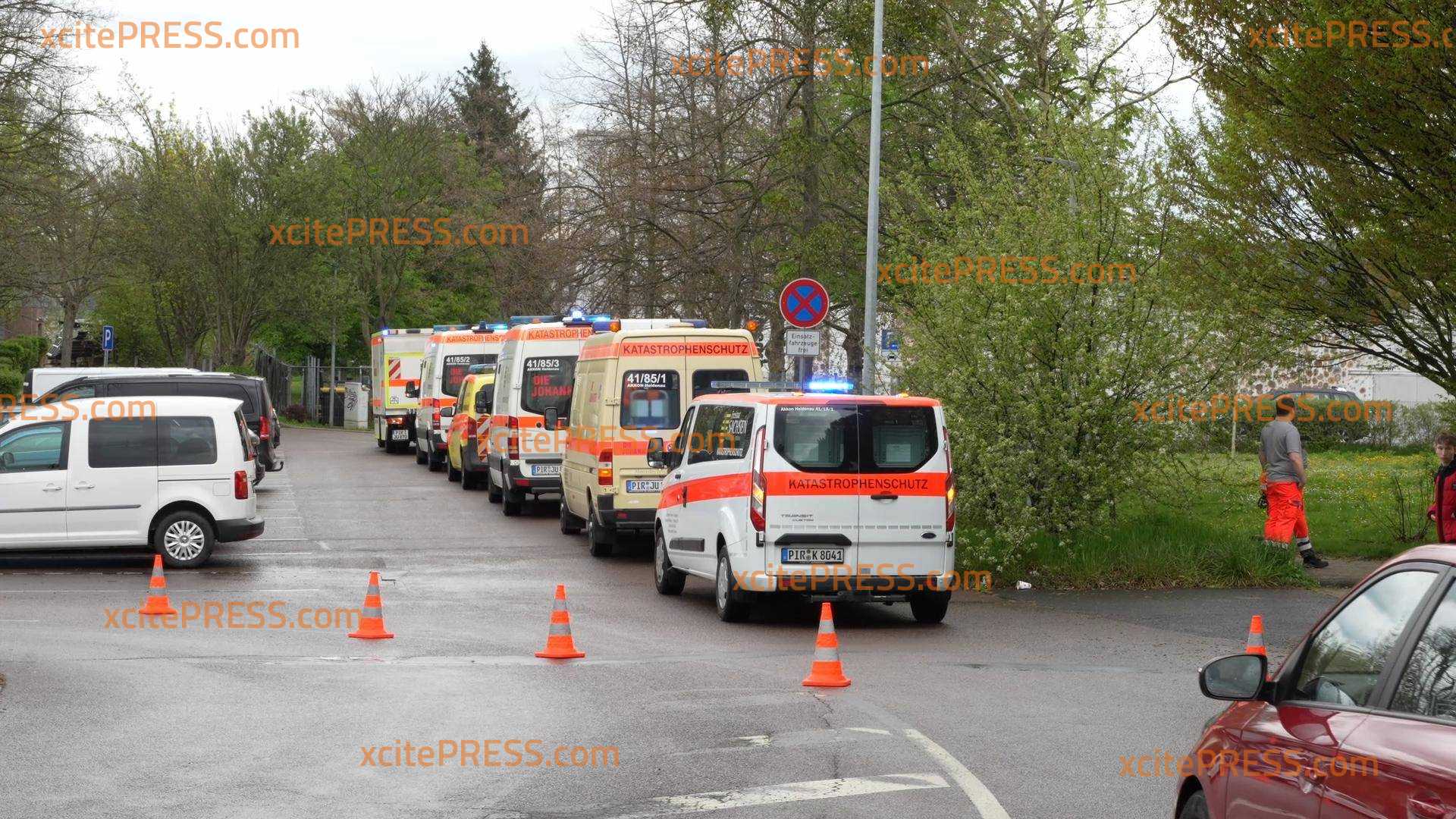 Großeinsatz für Rettungskräfte in Pirna: 59 betroffene Kinder offenbar nach Kontakt mit Reinigungsmitteln verletzt, Katastrophenschutz im Einsatz