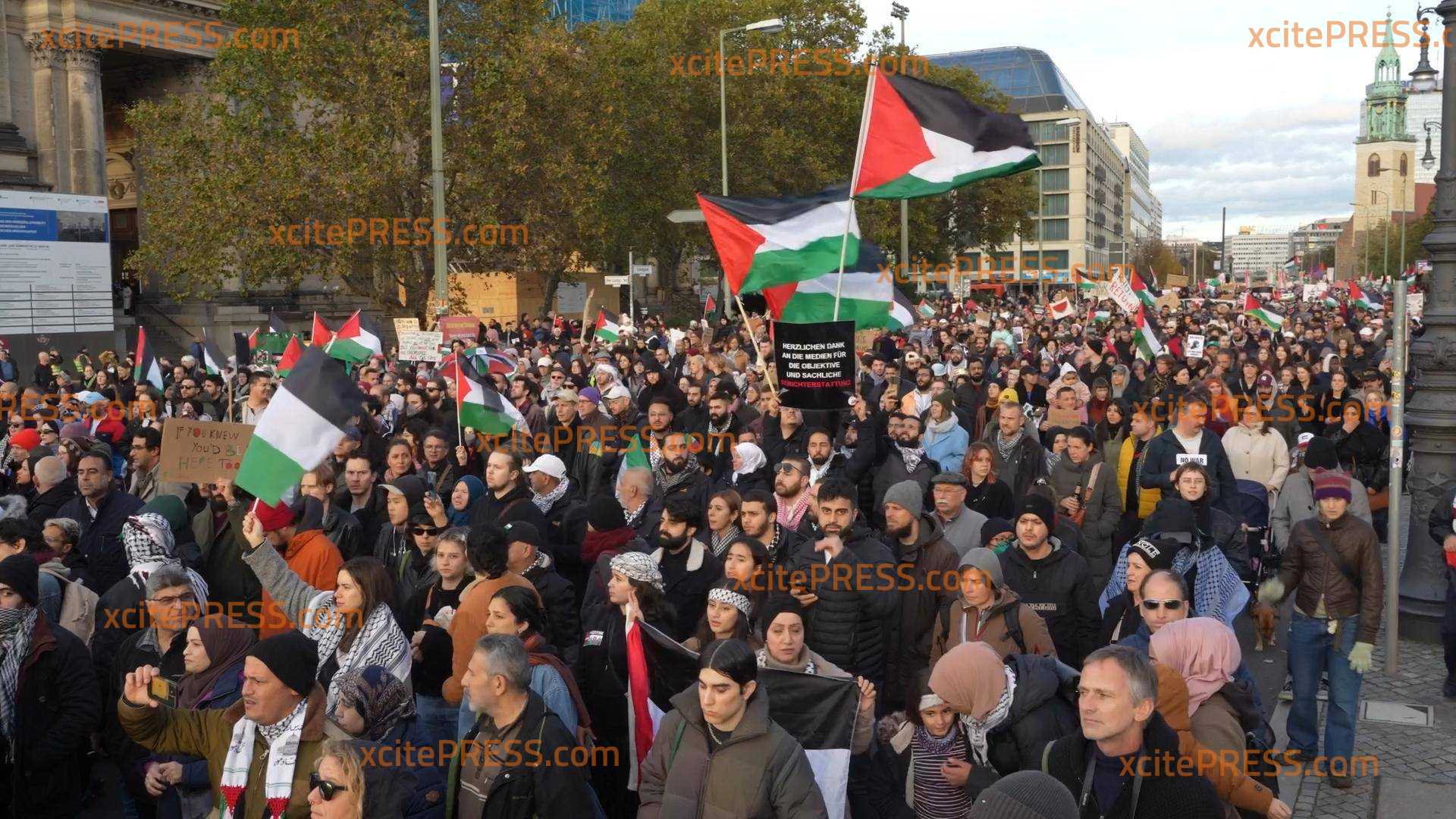 Update: Laut Veranstaltern nahmen über 50.000 Personen an der Demo Teil. Die Polizei bestätigte eine Teilnehmerzahl von über 10.000 Menschen. Am Rande kam es zu mehreren Festnahmen - die Stimmung war teils aufgeheizt. Mehrfach waren auch "from the River to the sea" oder "Völkermord"-Sprechchöre zu hören.