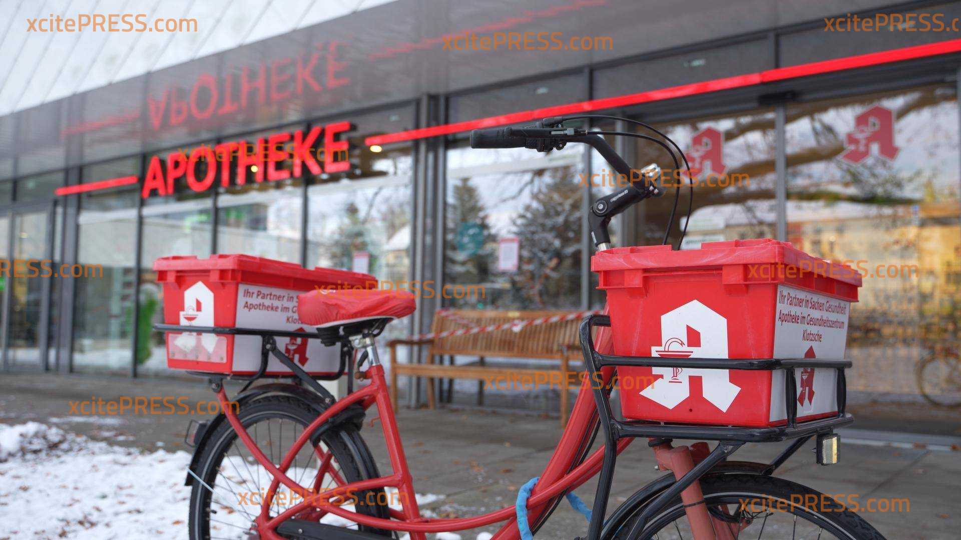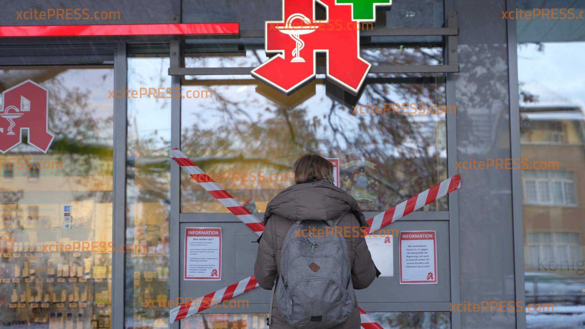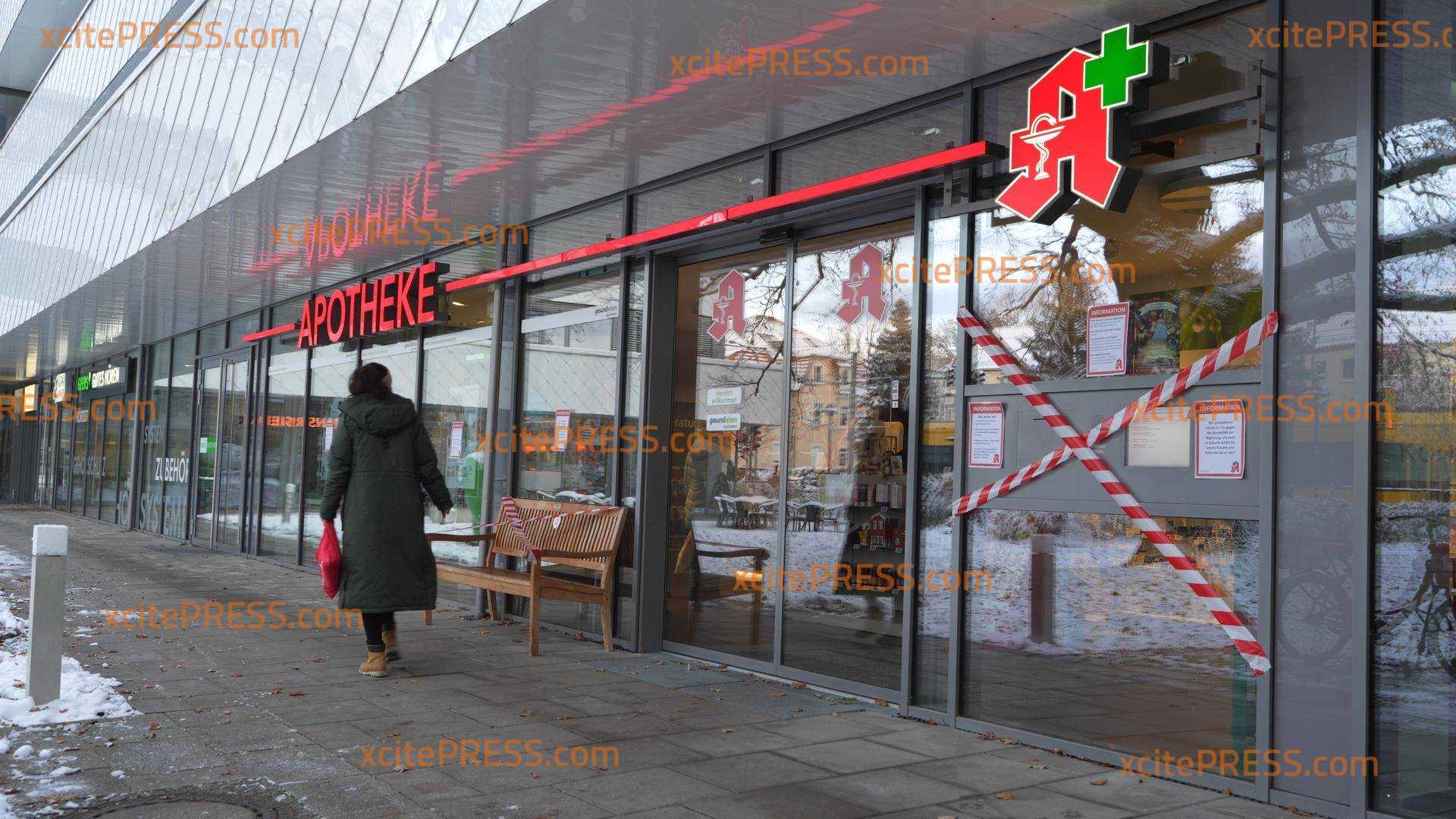 Die "Apotheke im Gesundheitszentrum Dresden-Klotzsche" ist von außen mit Absperrband umwickelt, Zettel hängen in den Schaufenstern. Die zahlreichen Aushänge sollen die Forderungen der Apotheken nach außen zu tragen.