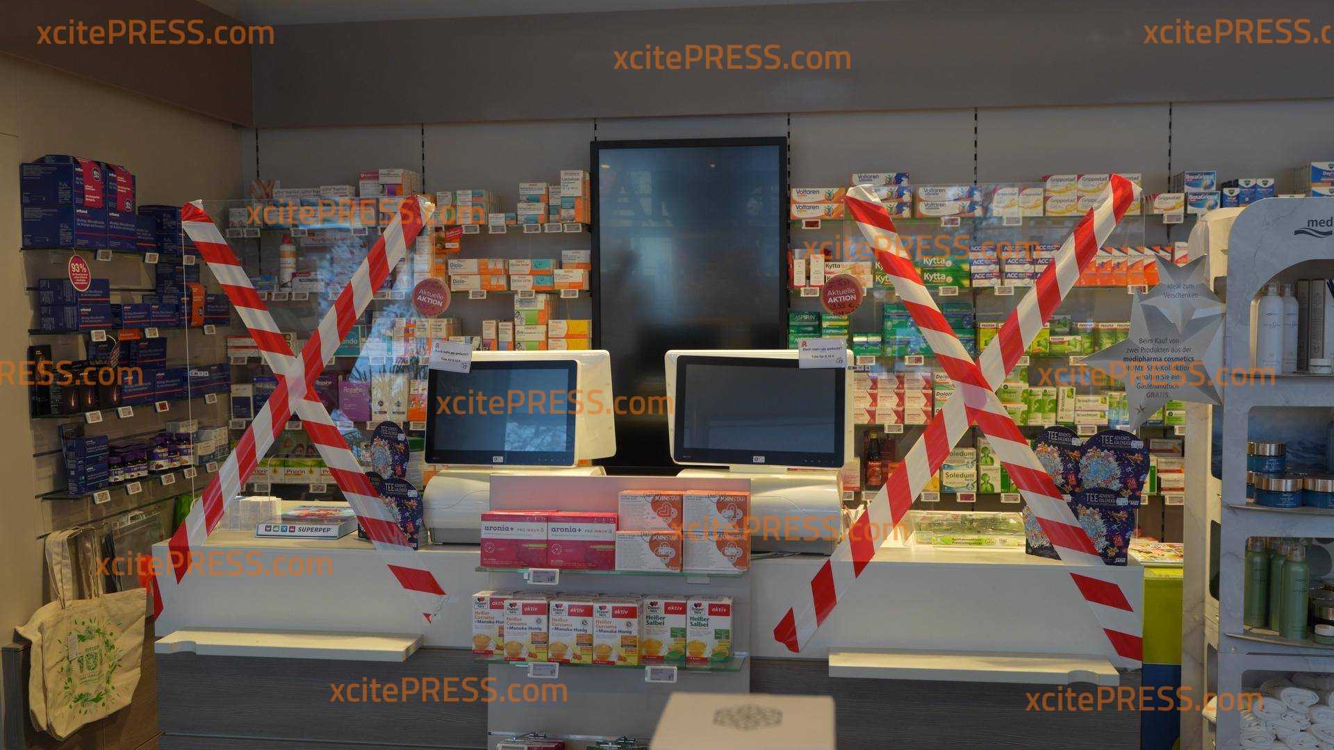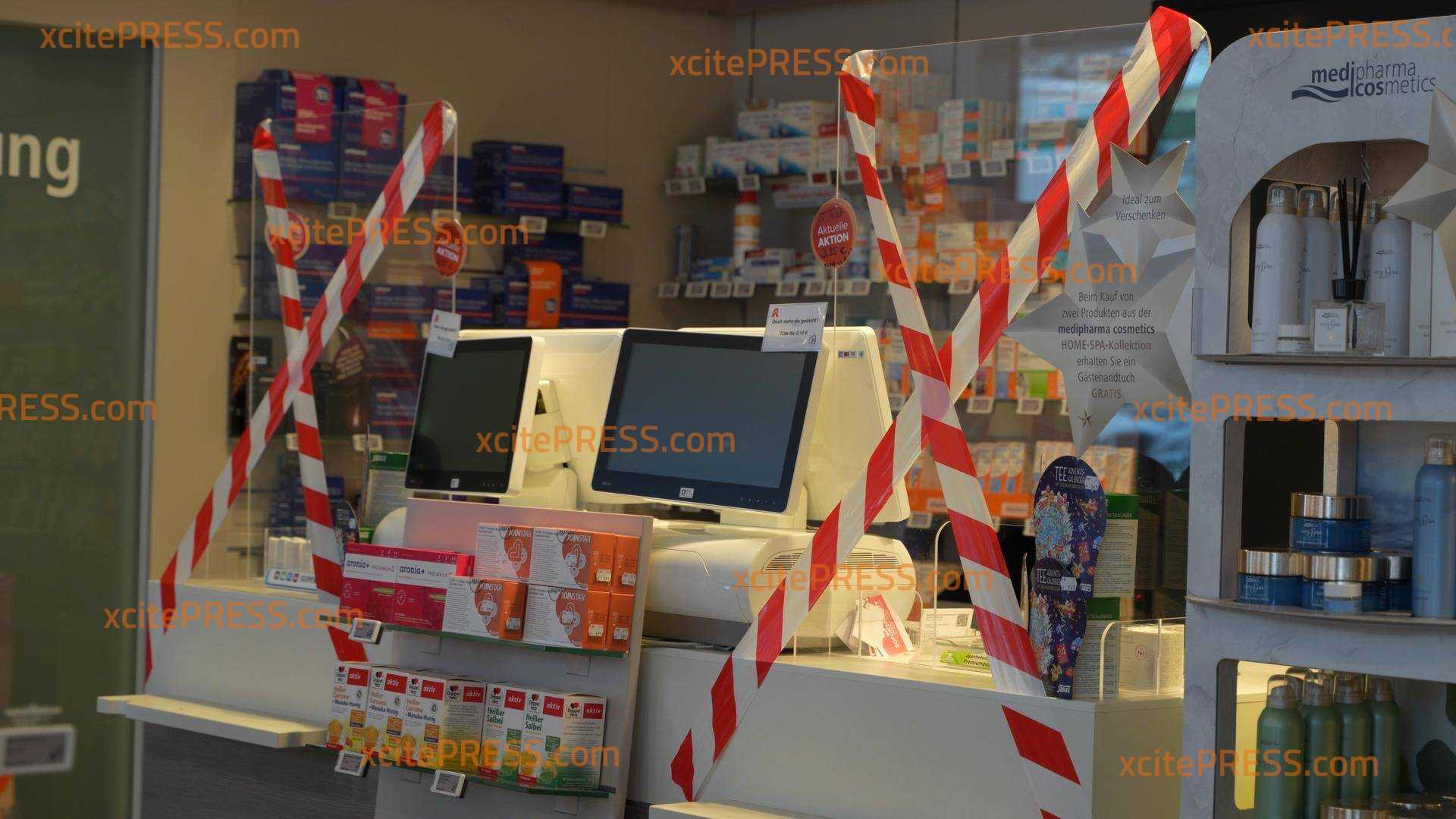 Apotheken-Streik: Schaufenster in Absperrband gehüllt, dutzende Flugzettel, sogar die Kasse ist abgesperrt!