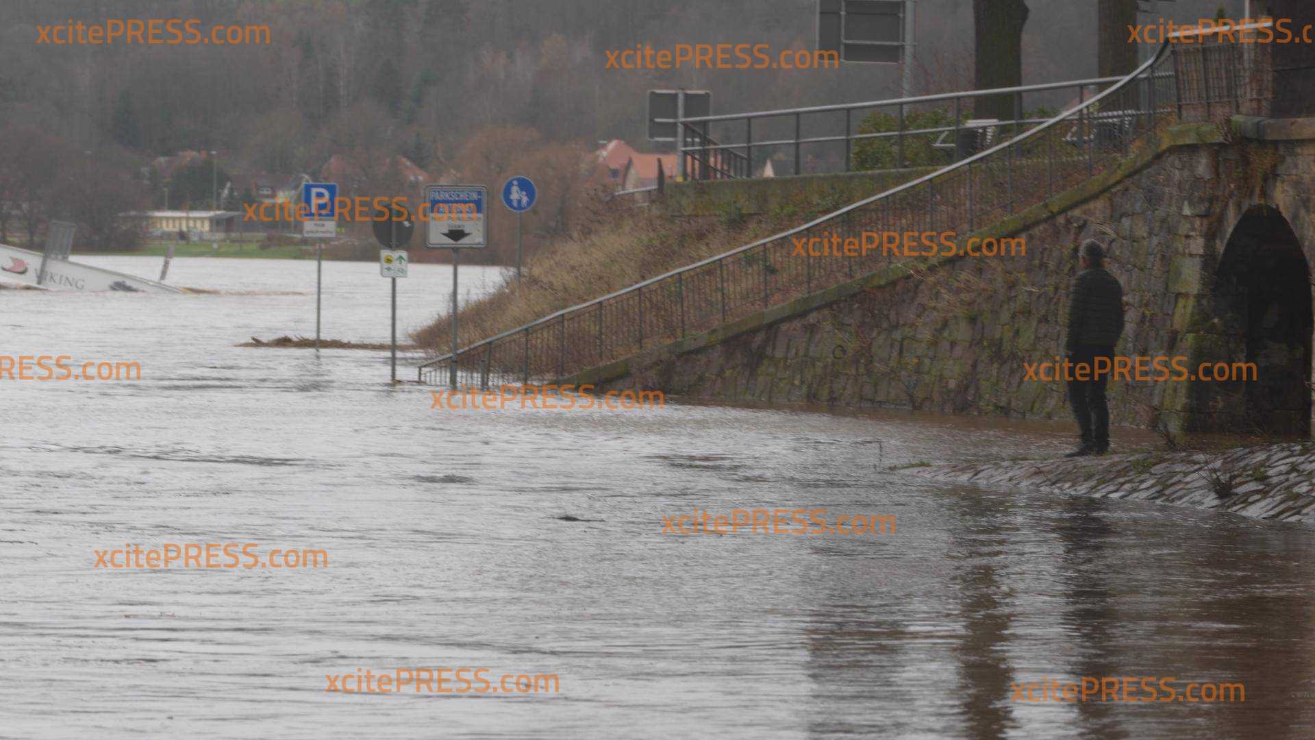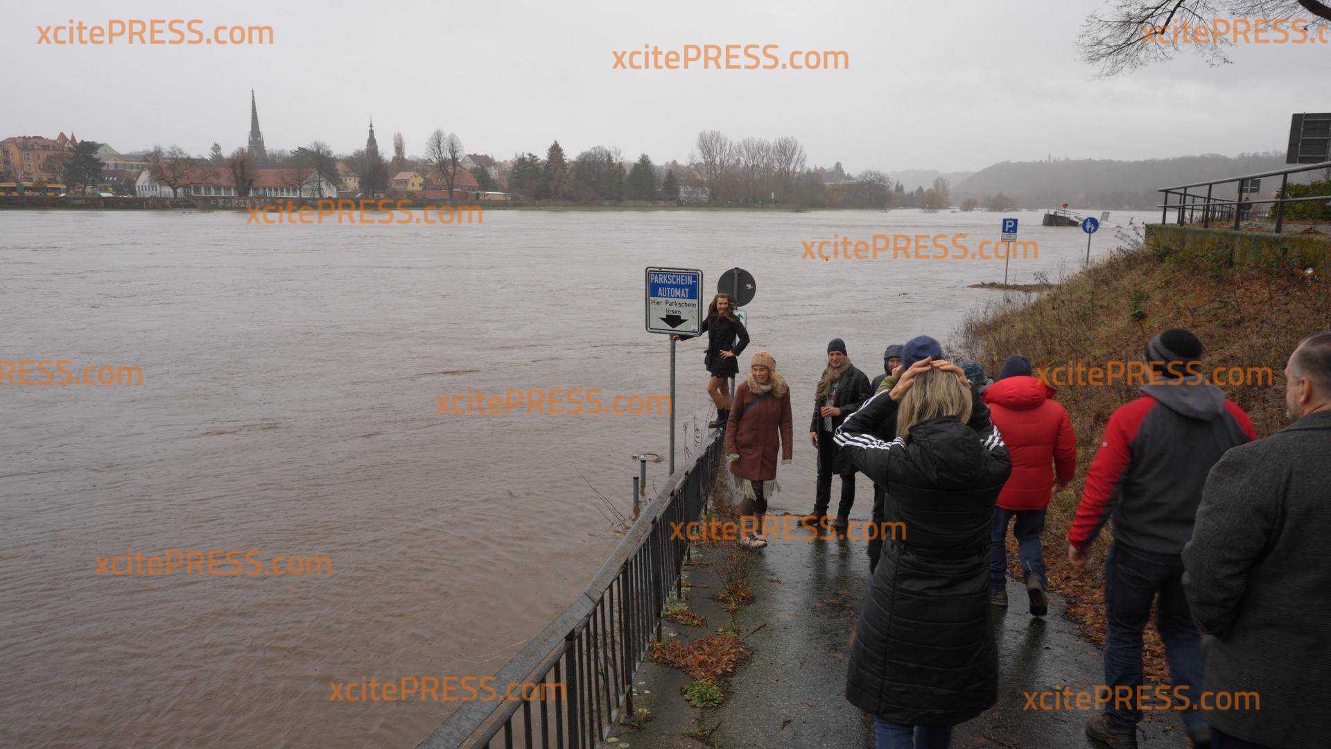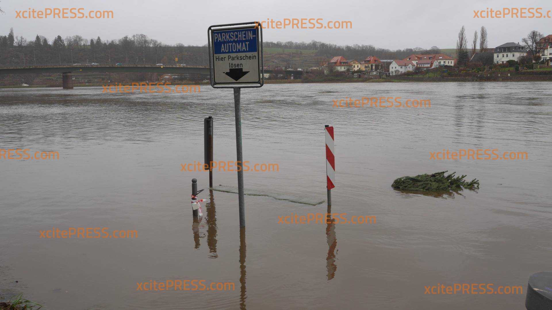 "Es ist ernst, nicht zu spaßen!" - Hochwasserlage in Meißen spitzt sich zu: Wasser hinter geschlossenen Flutschutztoren, Straßen und Parkplatze abgesoffen, hohe Schilder unter Wasser