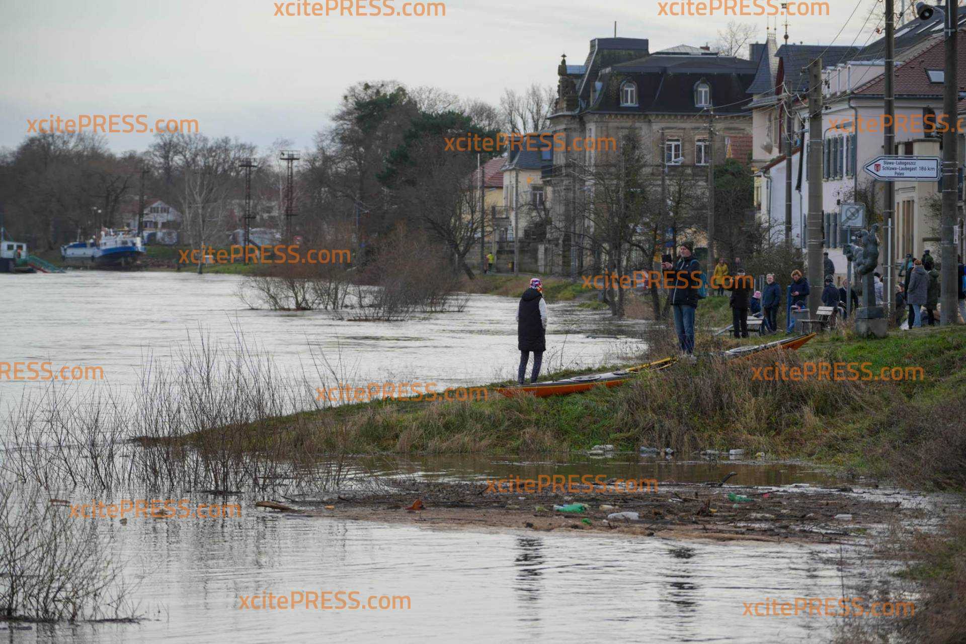 Deutschlandweit wird das Hochwasser zur Attraktion für Schaulustige. Entlang des Elbehochwassers ist zunehmend zu beobachten, dass Passanten und Schaulustige fahrlässig mit der Situation umgehen. Ein schnelles Foto hinter dem Schutzdamm oder möglichst nah am Wasser, kann dabei schnell zum tödlichen Verhängnis werden. Wie reißenden die sonst so ruhig erscheinende Elbe ist, lässt sich gut in Dresden-Laubegast beobachten. Hier kommt das Wasser den Wohnhäusern bedrohlich nah - nur ein Sandsack-Damm soll hier die Bevölkerung schützen. Unsere Aufnahmen zeigen: die breite Elbe entwickelt hier eine rasende Strömung. Vom Wasser mitgerissene Bäume verdeutlichen die Fließgeschwindigkeit. Bei den Anwohnern kommen derweil böse Erinnerungen an das Jahrhundert-Hochwasser von 2002 wach (Vox-Pop). Ein Schild am Bäcker neben der Elbe erinnert an den damaligen Wasseehöchststand.