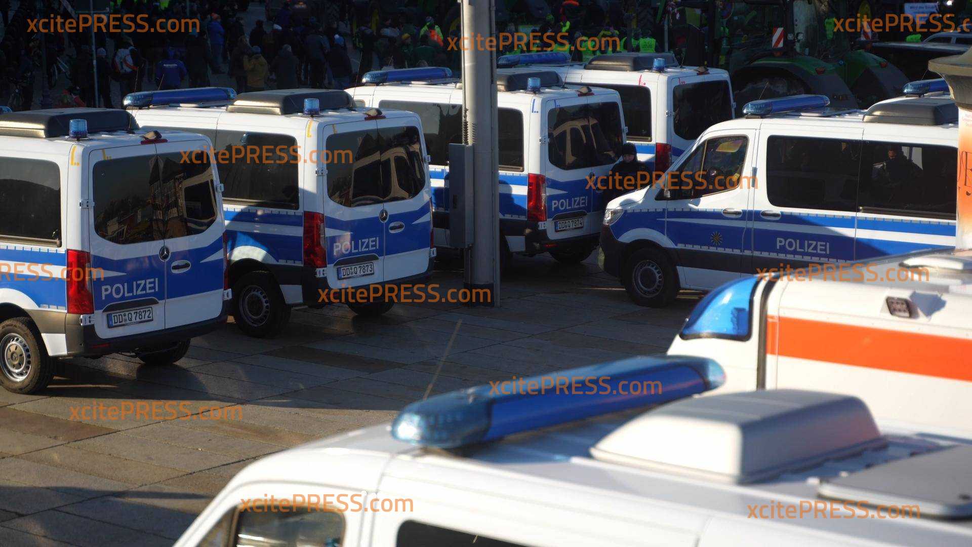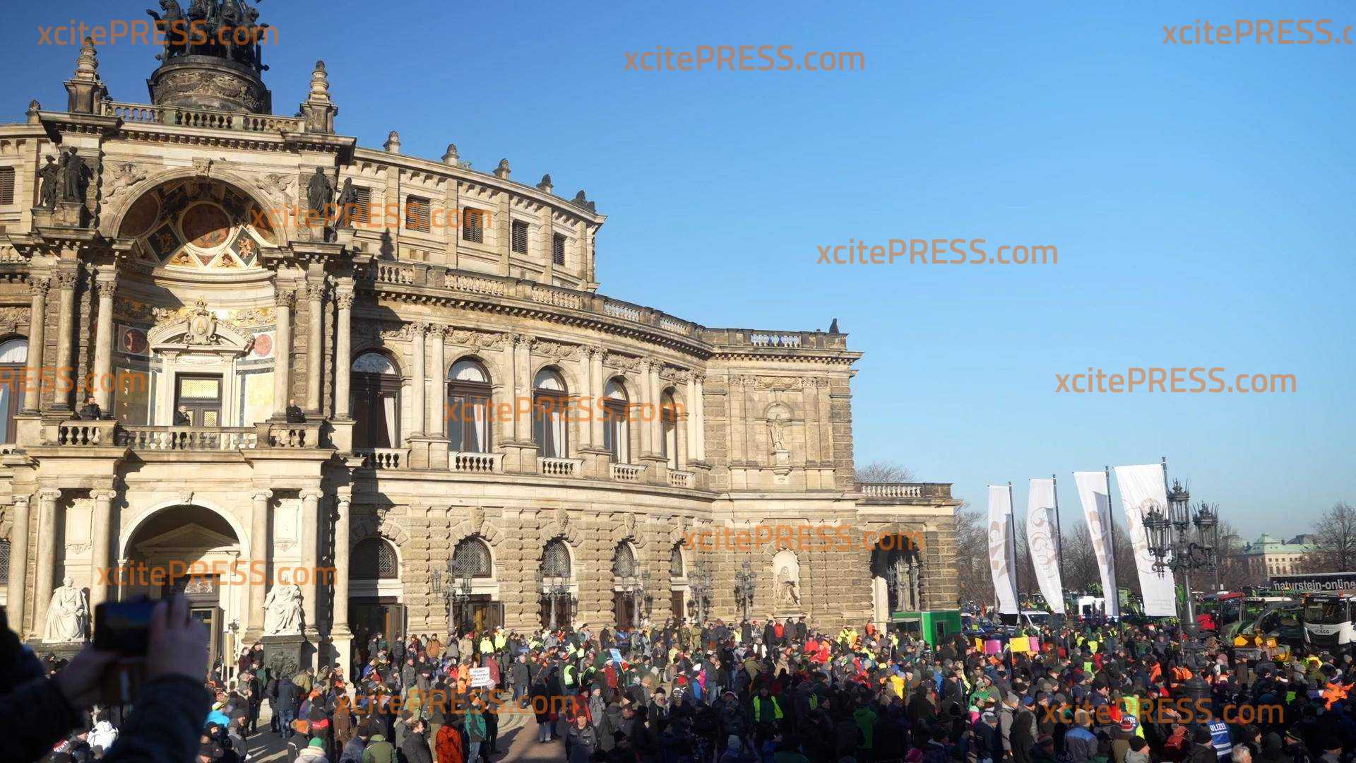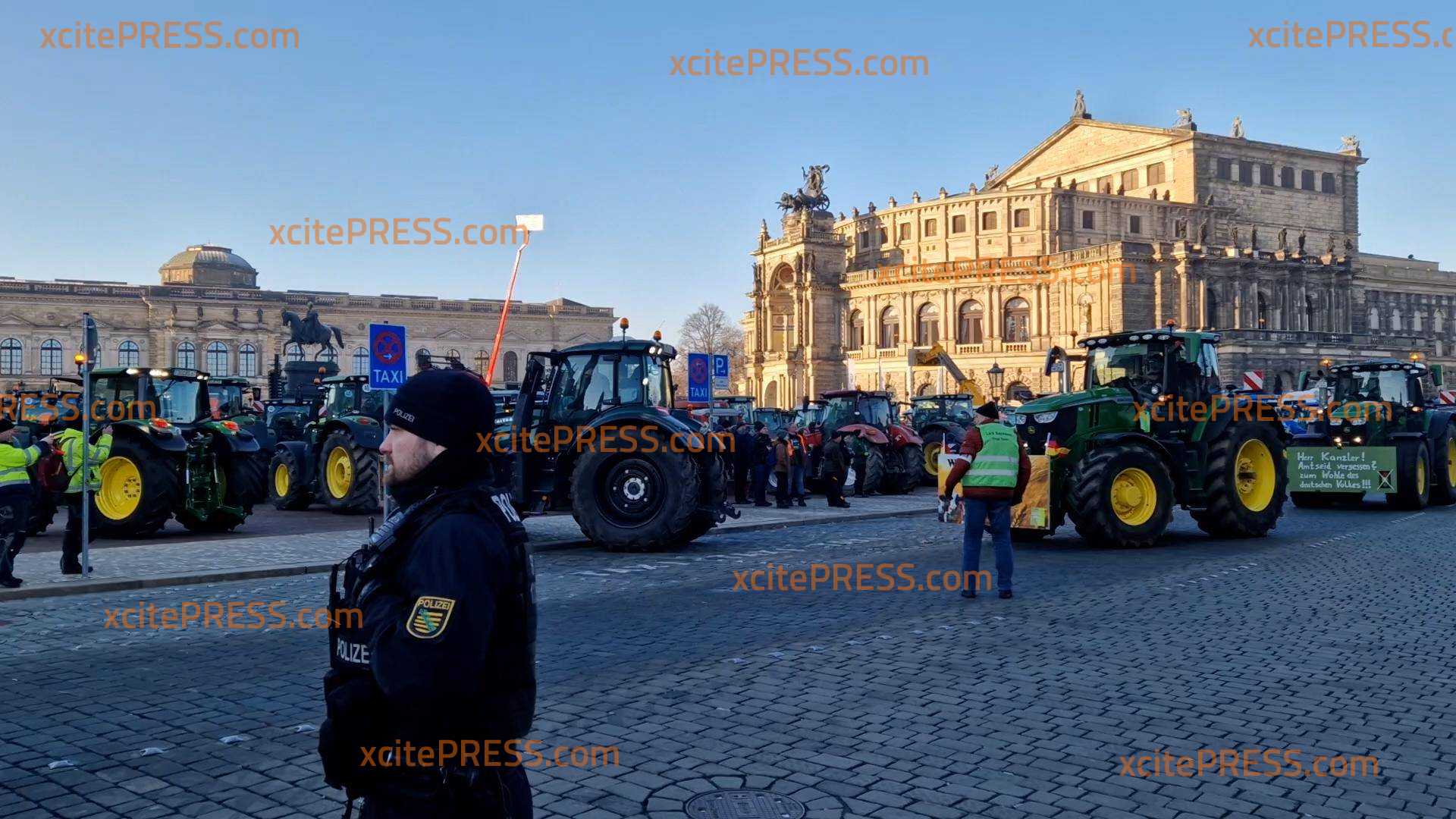 Der Stadt und dem Umland droht ein Verkehrschaos - die Polizei seit dem Morgen mit einem Großaufgebot vor Ort. Mit einem Hupkonzert begann gegen 11.00 Uhr die Demo am Dresdner Theaterplatz. Torsten Krawczyk, Präsident des Sächsischen Landesbauernverband e.V. zeigt sich begeistert und erleichtert: "Wir stehen hier mit viel Frust und vielen Sorgen und sind begeistert und erleichtert [...] über den Zuspruch [...] wir stehen in der Mitte der Gesellschaft, wir sind die Wirtschaft, wir sind der ländliche Raum".