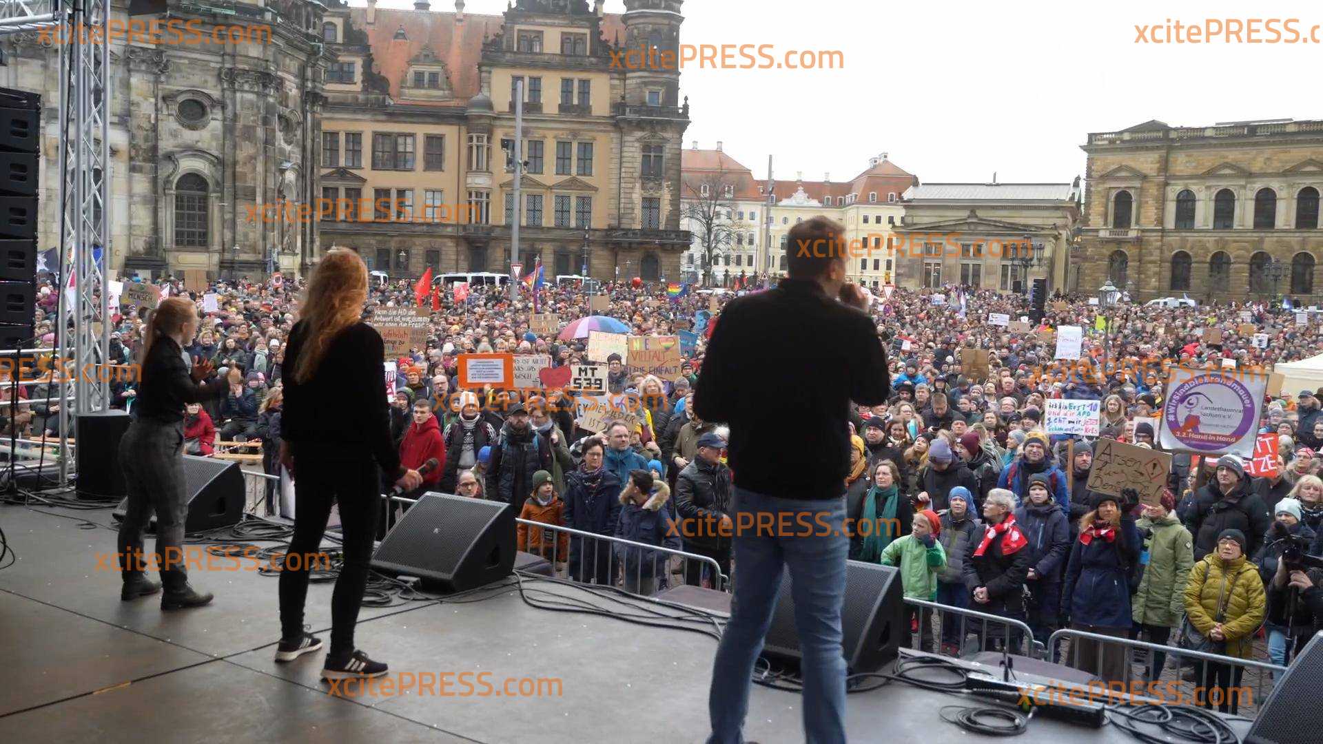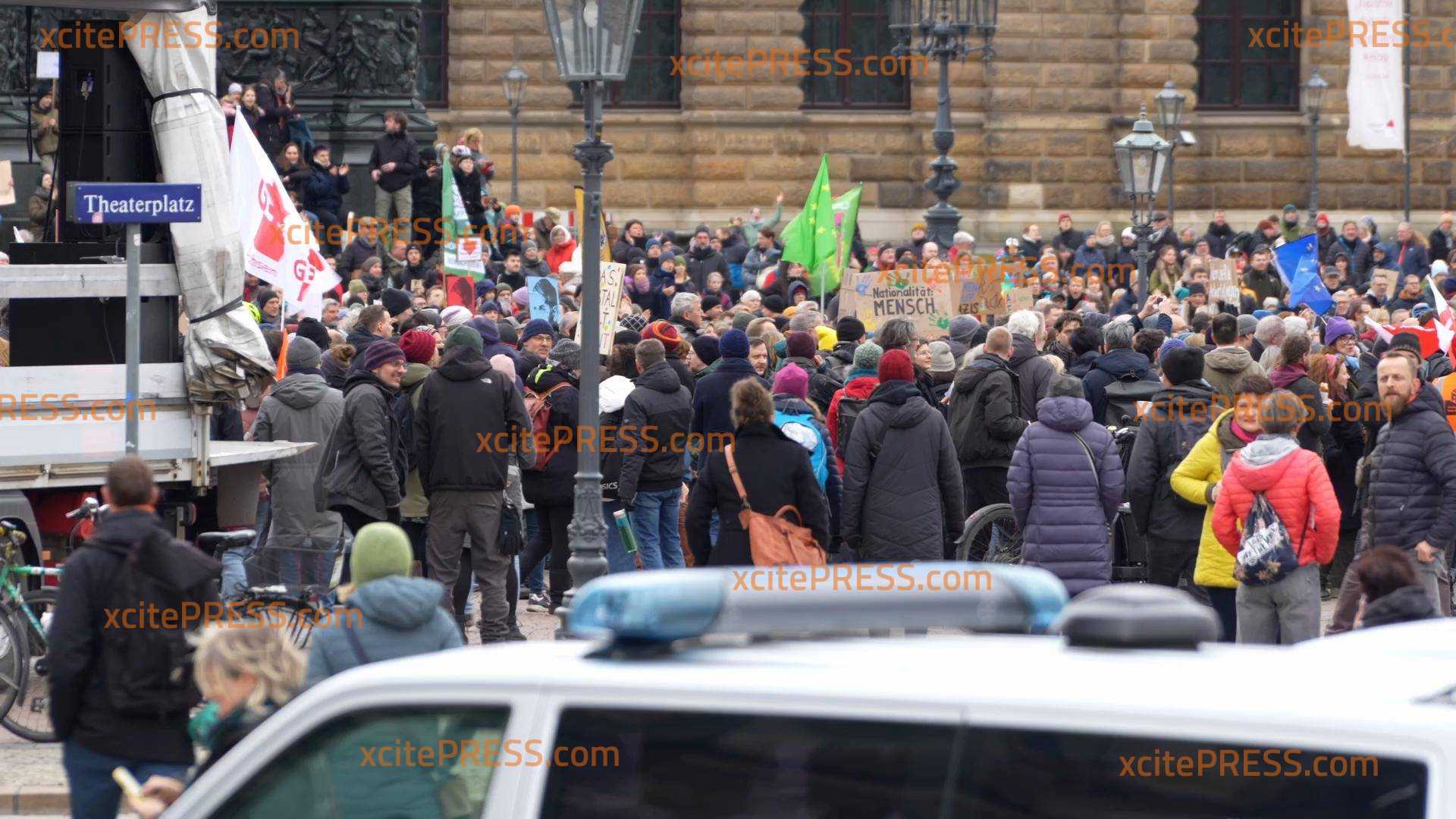 UPDATE 16:30 Uhr: Trotz Nieselregen blieben mehrere tausend Menschen auch zur Abschlusskundgebung auf dem Theaterplatz. Die Veranstalter zeigten sich begeistert über die hohen Teilnehmerzahlen. Michal Tomaszewski (Banda Communale) sagte im O-Ton: "In Sachsen regt sich etwas, was seit vielen vielen Jahren einfach nicht gab!". Er schaut hoffnungsvoll auf die Zeit bis zu den anstehenden Landtagswahlen.