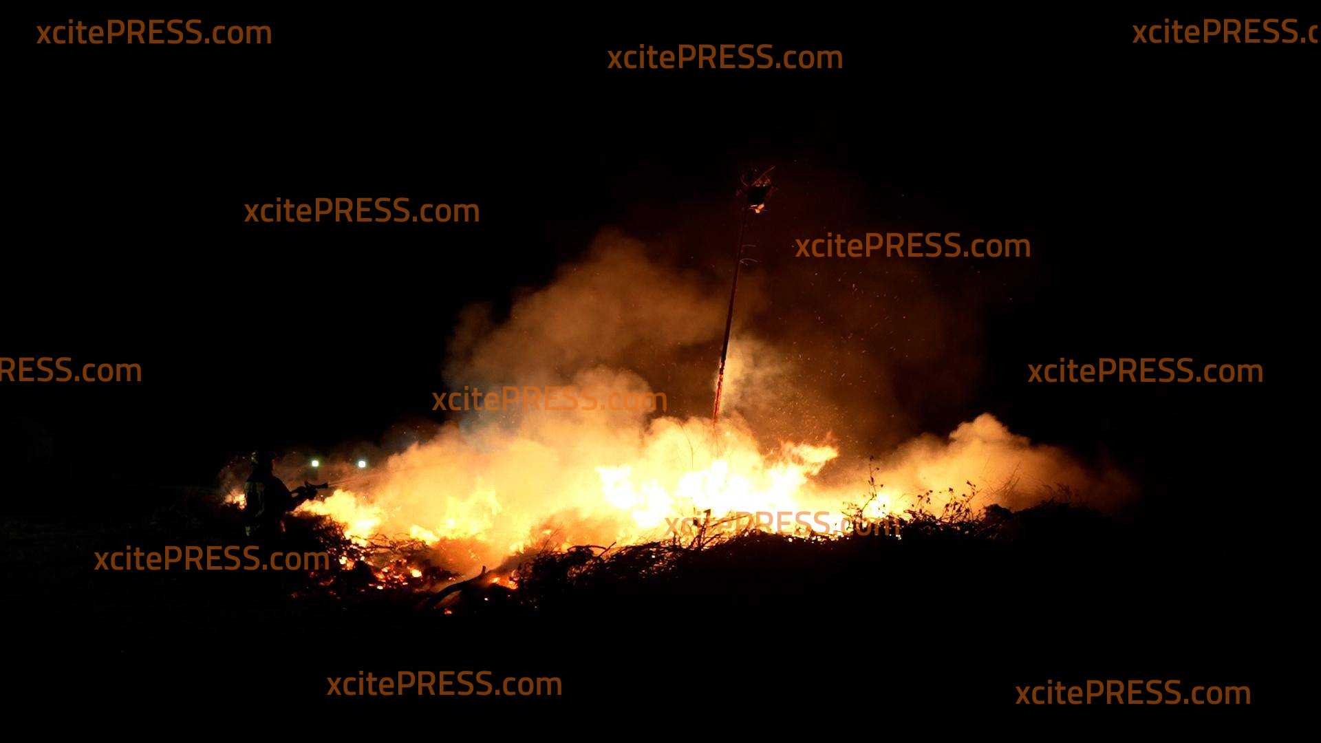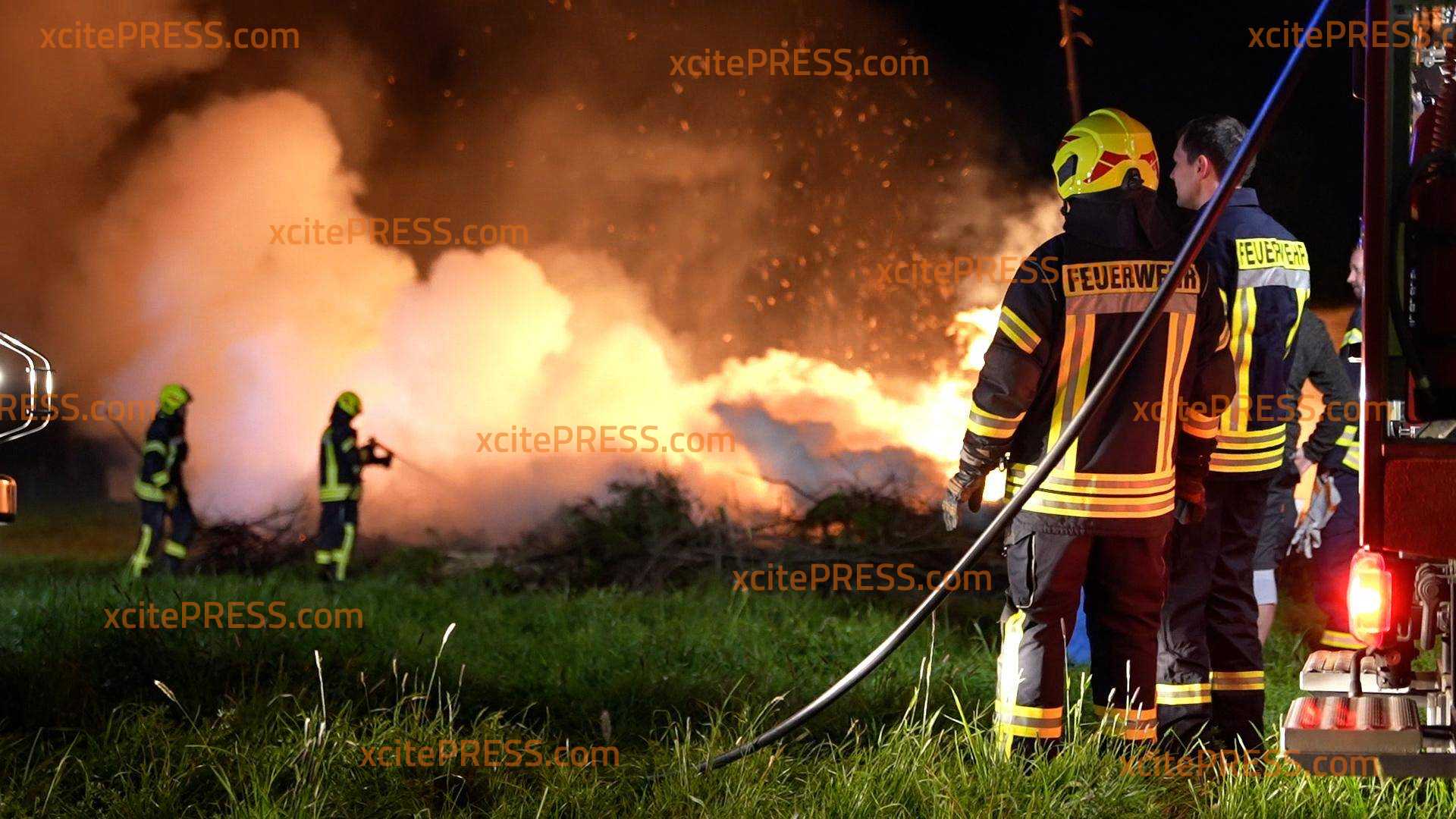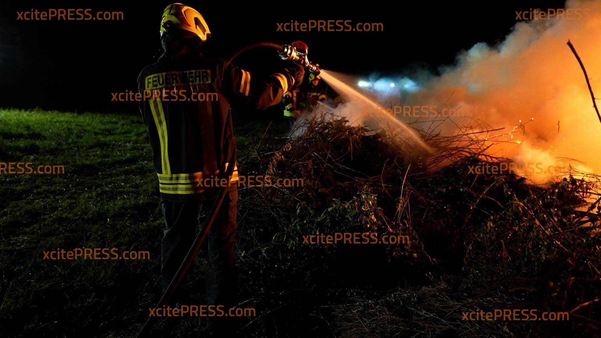 In Salzenforst, wo keine Nachtwache stattfindet, wurden die Hexenhaufen vorzeitig angezündet. Unser Material deckt die schnelle Reaktion der Feuerwehr ab, die versucht, das Feuer zu löschen und das noch nicht brennende Holz zu retten.