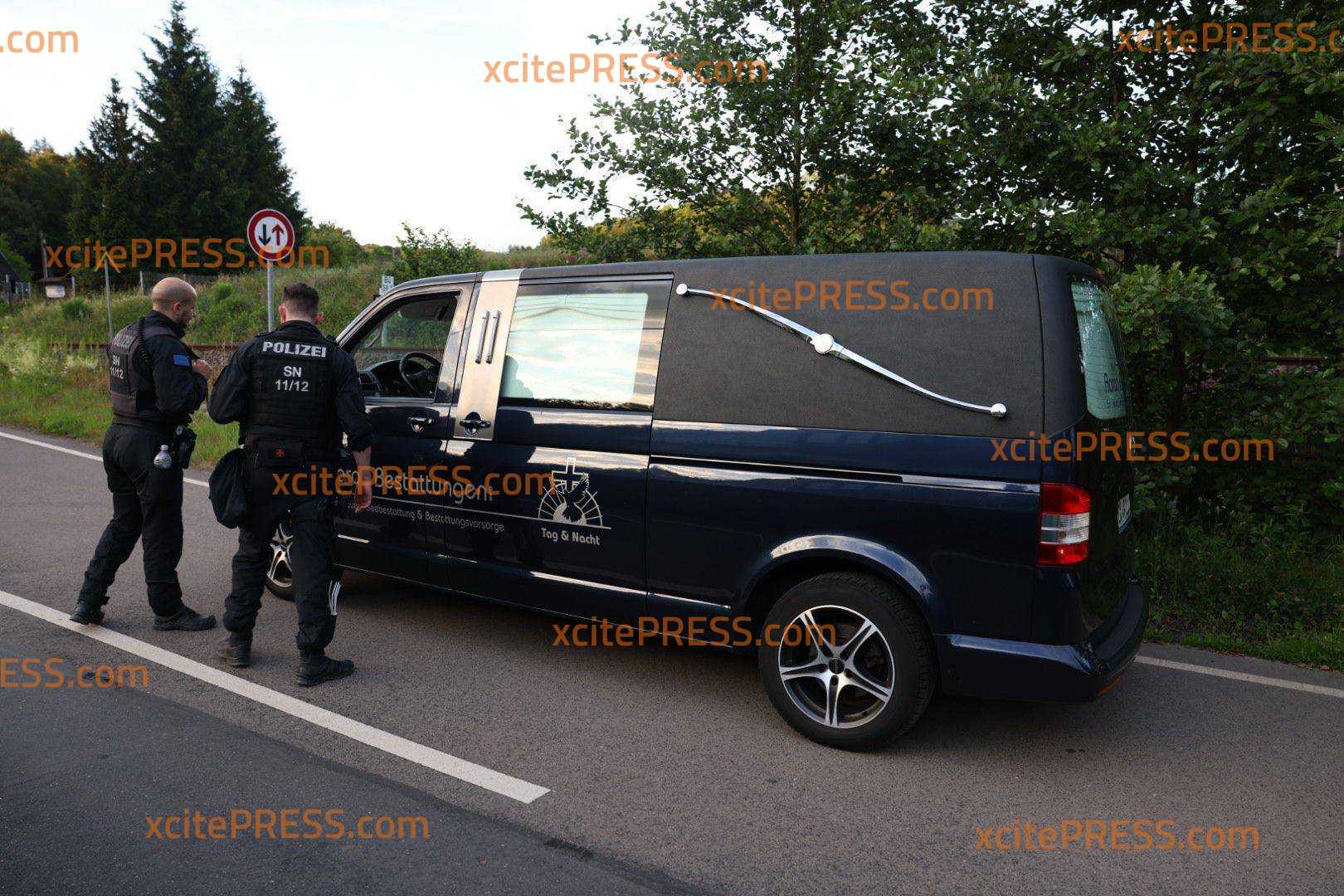 Das Gebiet um den Fundort ist weiträumig abgesperrt. Gegen 20:45 Uhr fuhr der Bestatter vor.