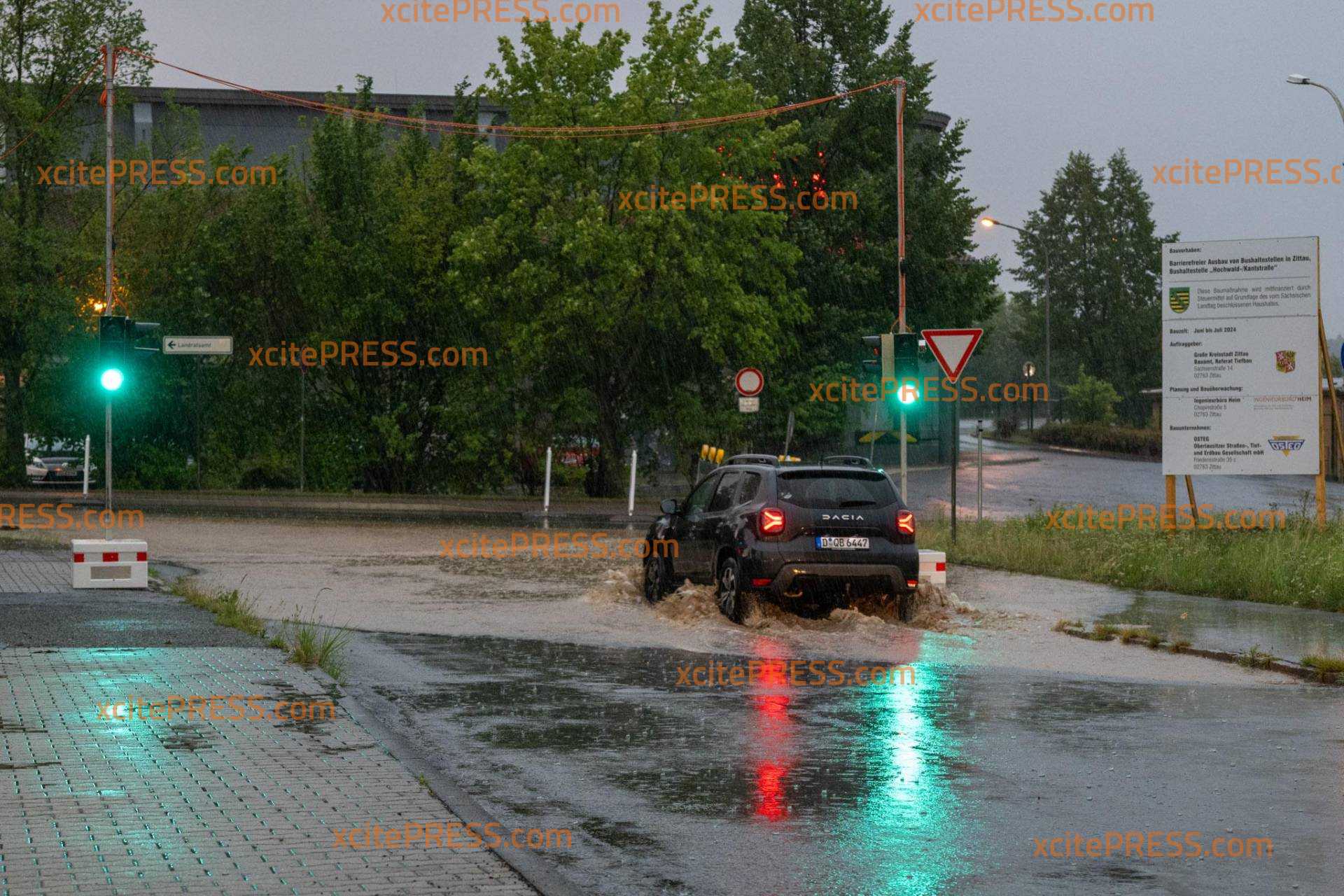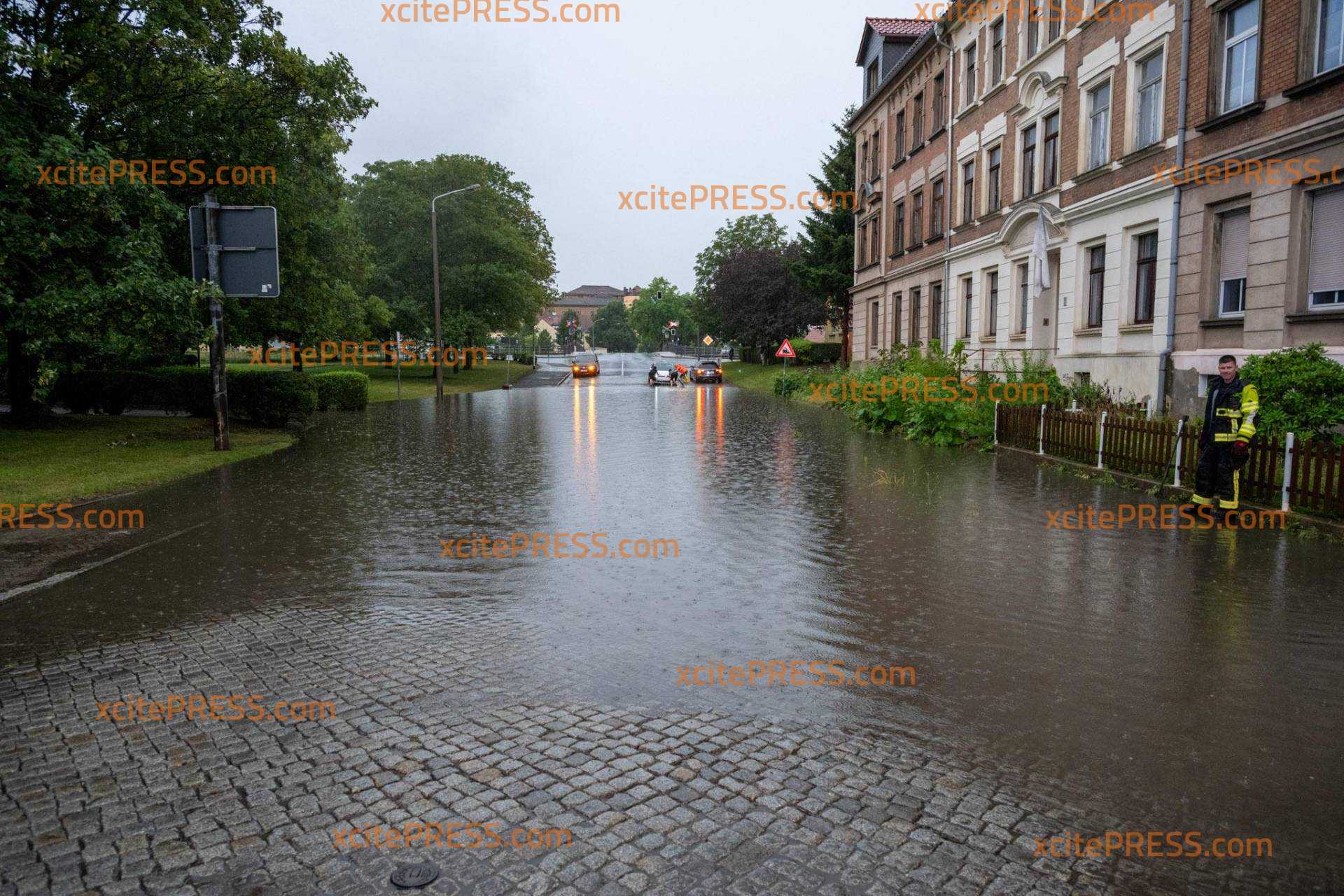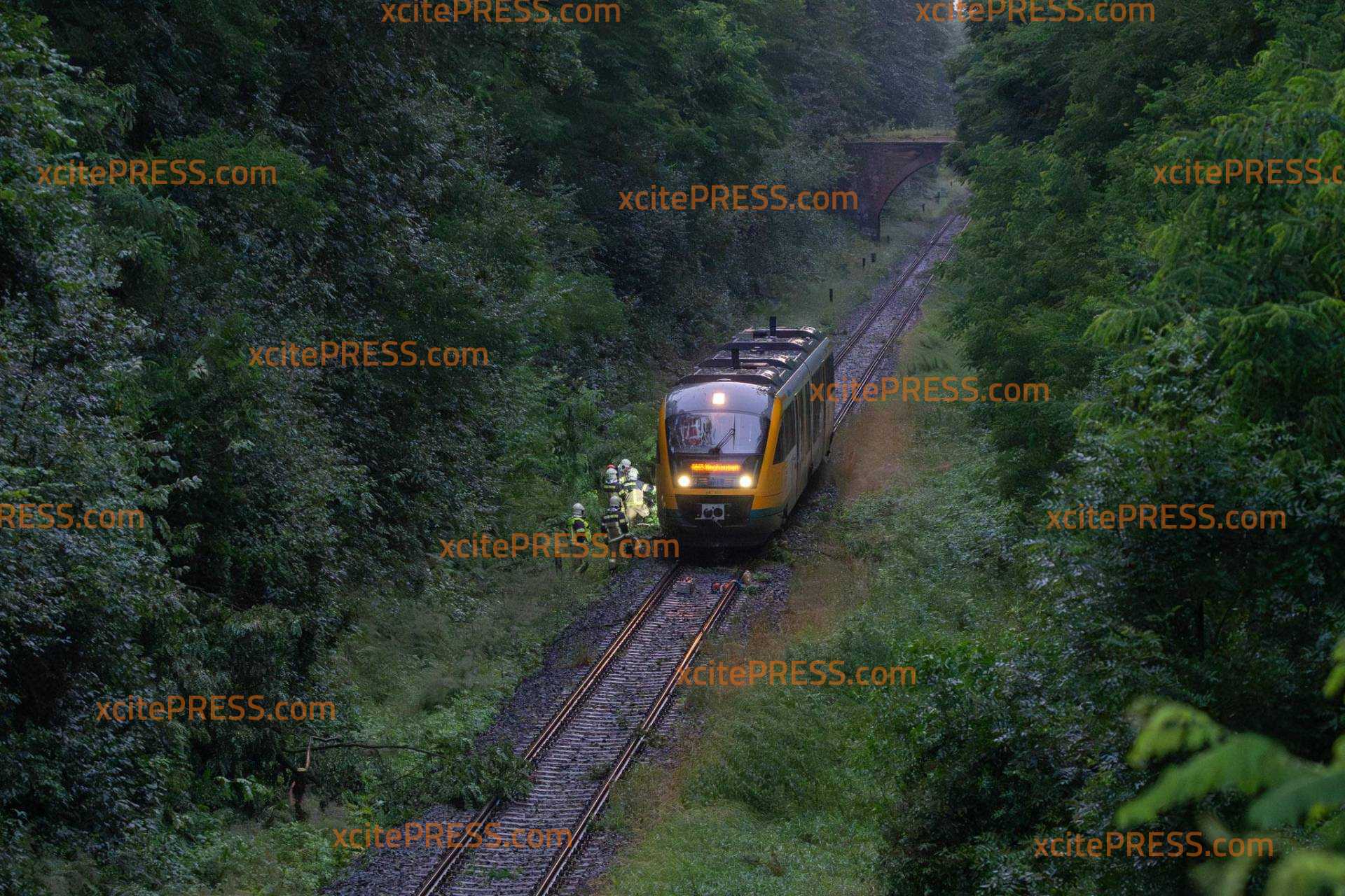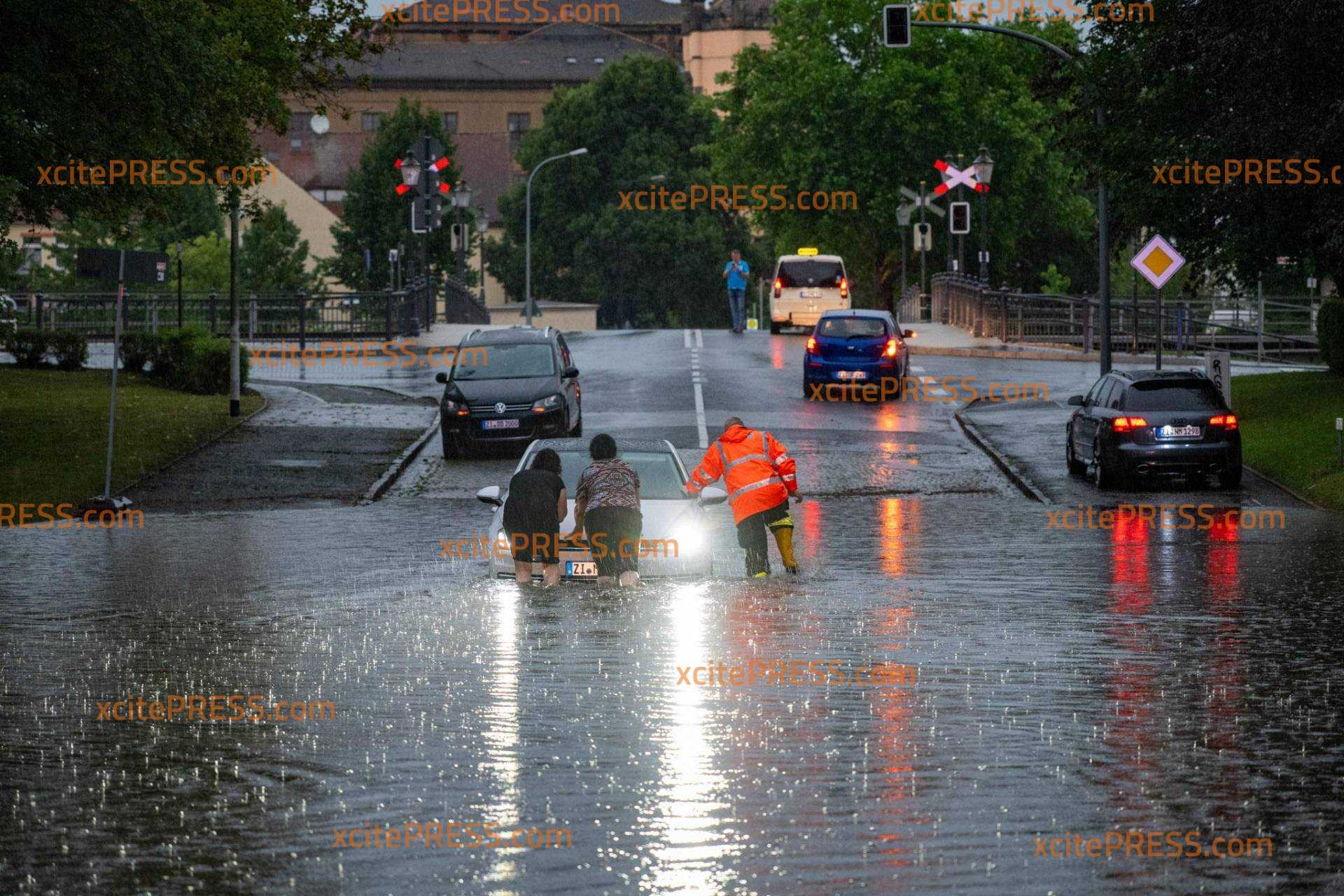 Unwetter am Mittwochnachmittag sind zahlreiche Straßen im Landkreis Görlitz überflutet worden. Auch auf der Regionalbahnstrecke Zittau Görlitz gab es einen Zwischenfall, bei dem ein Zug mit mehreren Stämmen von Bäumen kollidierte. Aufgrund der Einsatzmaßnahmen ist die B 178 in Richtung polnischer Grenze voll gesperrt. Feuerwehren aus Eckartsberg, und zwar Seifersdorf sind aktuell im Einsatz, um die Baumstämme von den Gleisen zu entfernen. Auf der Zittauer Südstraße fuhr ein VW-Fahrer in eine Überspülte Straße und blieb stecken. Ersten Erkenntnissen nach erlitt das Auto einen Totalschaden. Feuerwehr und Passanten halfen dem Fahrer, das Fahrzeug aus dem Wasser zu befreien.