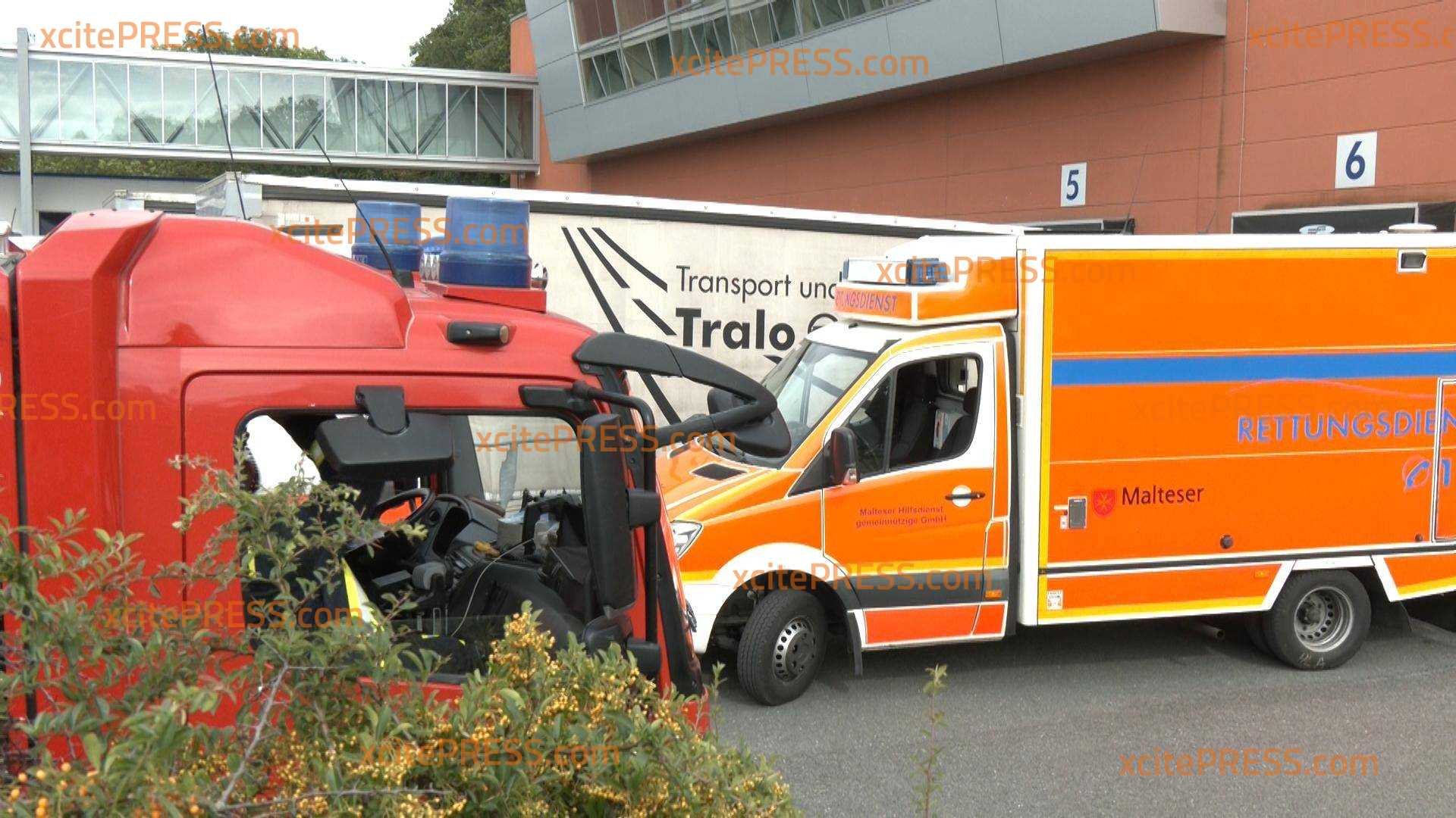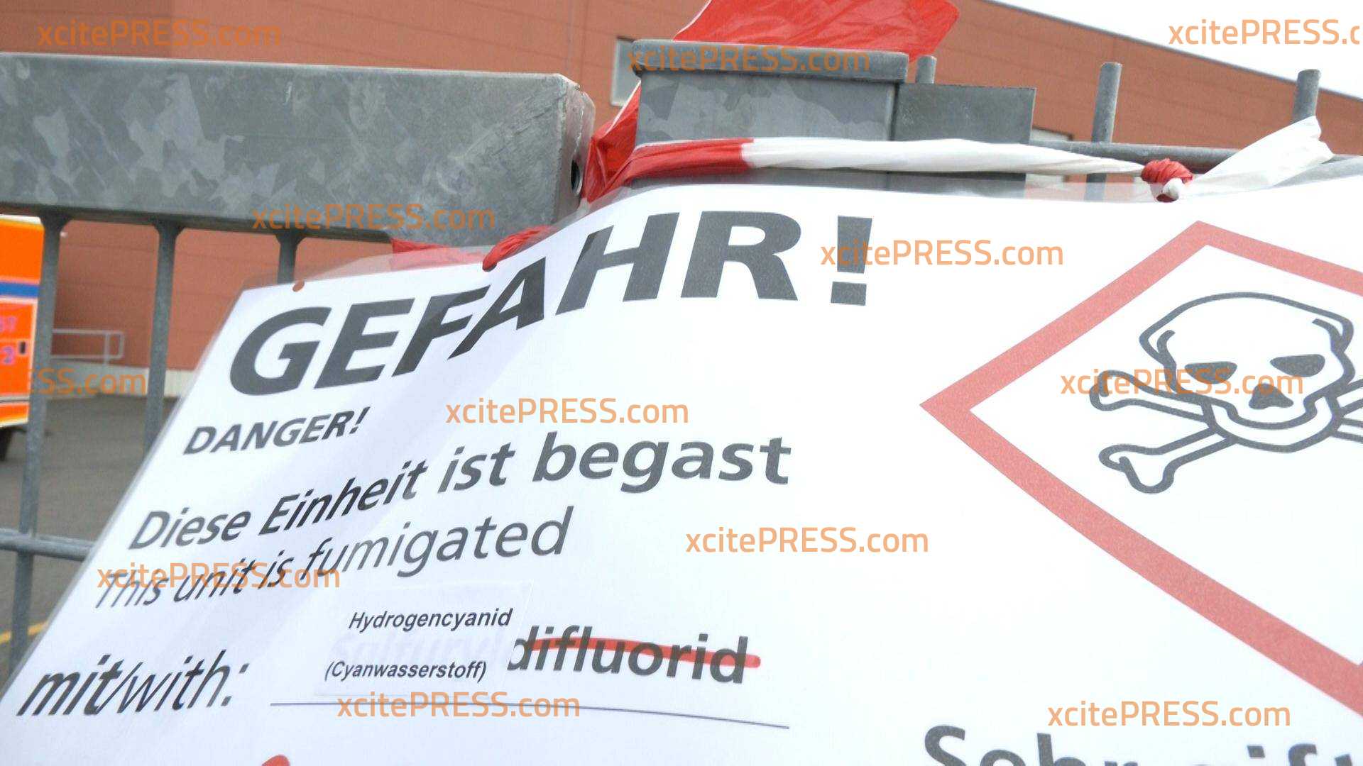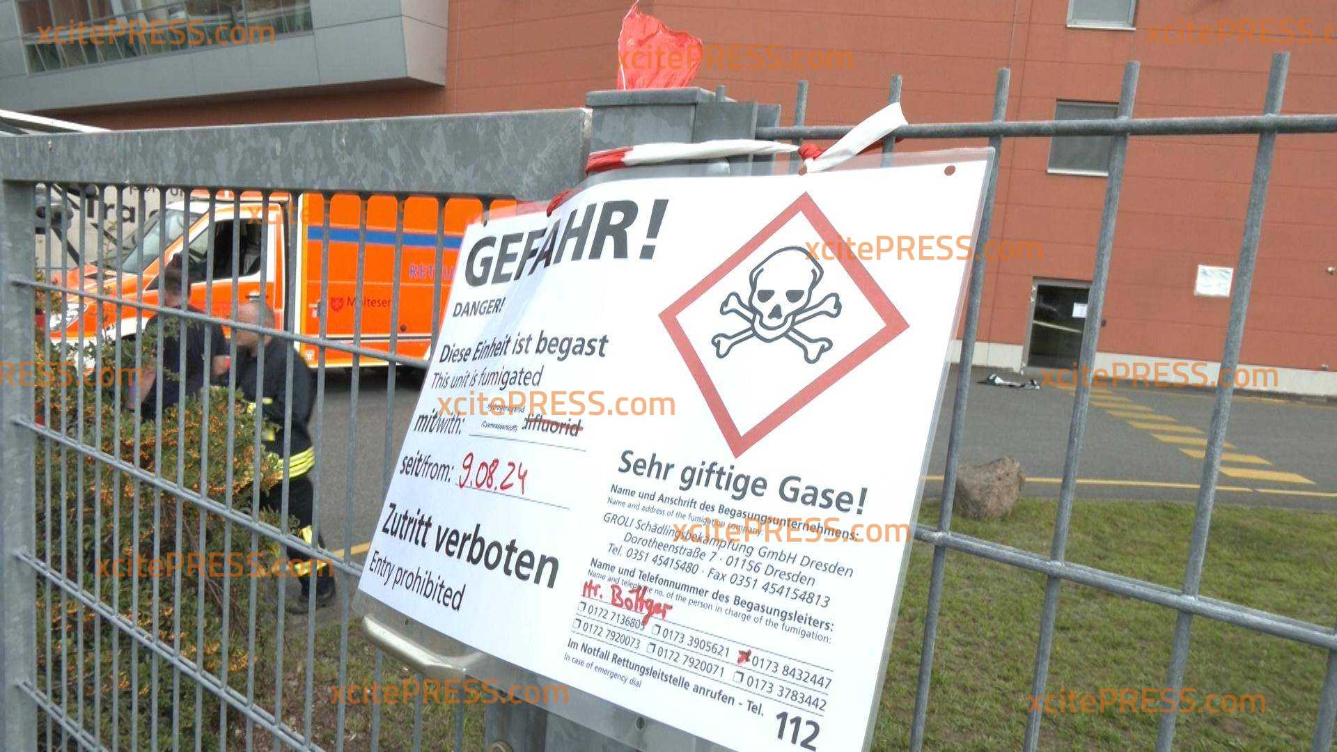 Feuerwehrleute betreten in Schutzanzügen die Fabrik von "Teigwaren Riesa" - schwieriger Einsatz - Schilder warnen vor giftiger Blausäure!